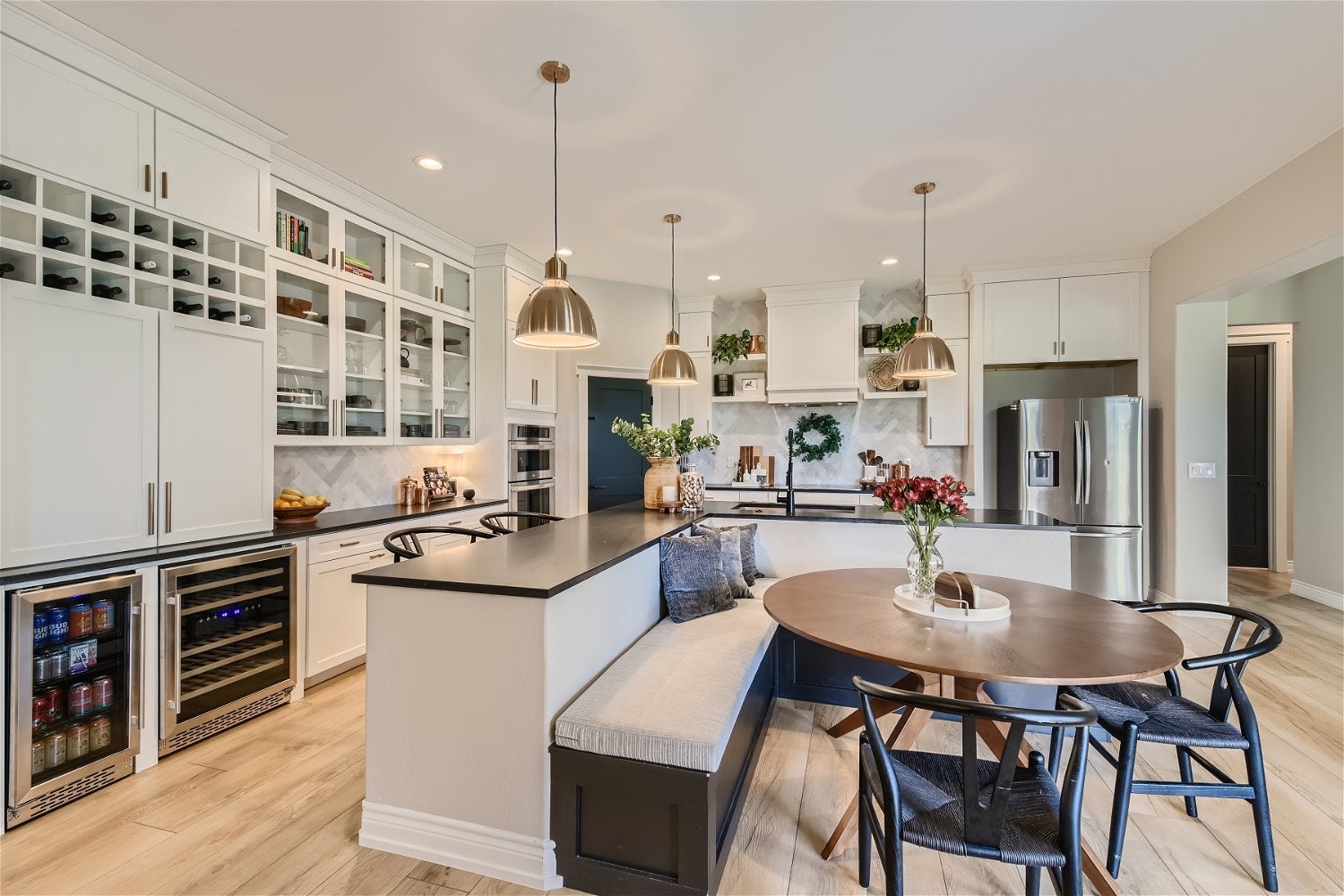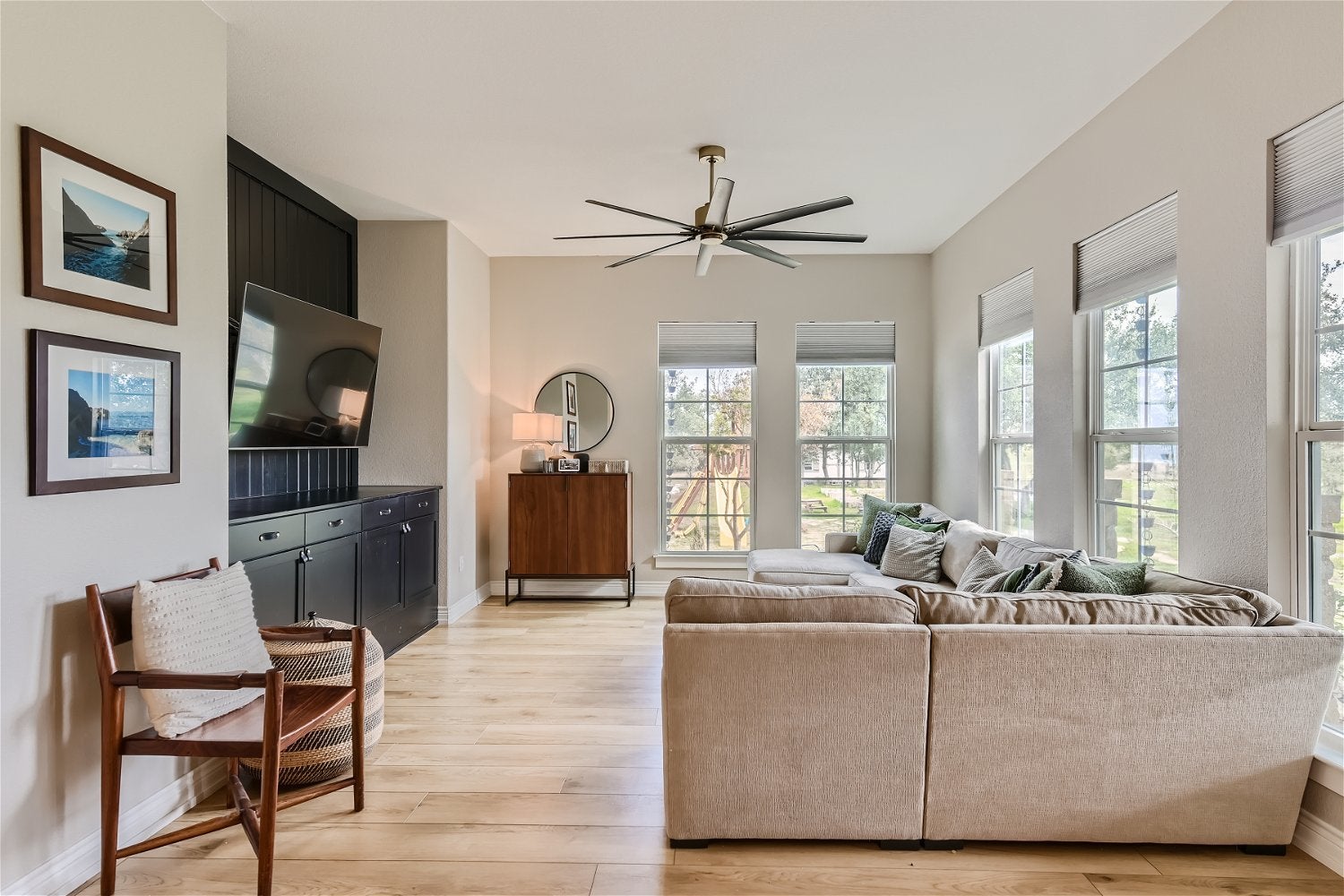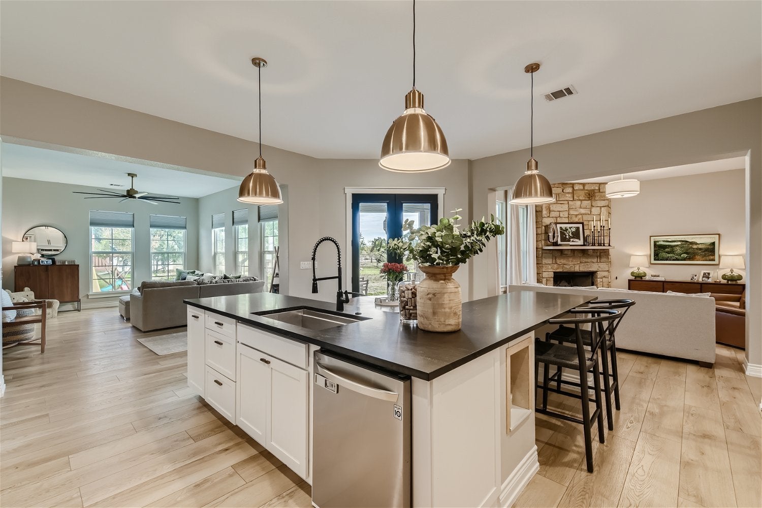 The Texas Hill Country awaits you! Less than an hour to downtown Austin, this stunning home offers four bedrooms, three full baths, athree car garage and 3.31 acres of hill country. The foyer leads into one of two living areas. Recently remodeled, the kitchen is the hubof the home offering a walk0in pantry, two small refrigerators for wine and drinks, stainless steel appliances, an oversized island, and abuilt in breakfast nook perfect for a quick bite or easy entertaining. The split floor plan gives additional privacy to the master suite whichhas a beautiful ensuite bath with walk-in shower, large walk-in closet and a lounging tub. Two bedrooms share a Jack n Jill bath withindependent sinks. Other highlighted features include an irrigation system, landscaped yard, eight foot doors through out, a ten footstone fireplace, a dedicated office, energy efficient 16 seer a/c unit, a separate laundry space with abundant storage and sink, custombuilt-in’s in the living room and office, town independent Nest thermostats for balancing energy efficiency across the house, and a mudroom. Double Horn Creek is the epitome of the Texas Hill Country neighborhood highlighting custom homes on sprawling acreage platsalong with a community park, pool, and walking trails. .