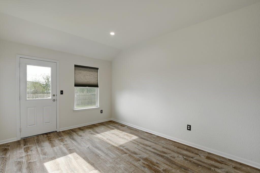 Welcome to this beautiful 3-bedroom, 2-bathroom gem perfectly tucked away on a quiet cul-de-sac in the sought-after Post Oak community. Built in 2016, this 1,371-square-foot, one-story home radiates a bright and energetic vibe, further enhanced by recent updates including luxury vinyl flooring and bedroom carpeting. The open-concept floor plan and soaring ceilings create an airy, spacious feel, seamlessly connecting the living area to a modern kitchen equipped with updated cabinets, granite countertops, a reverse osmosis water filter, and an included water softener. Retreat to the generous primary suite, which features a large walk-in shower and a spacious closet. Outside, the property truly shines with oversized front and back yards boasting a lush, carpet-like lawn, offering the perfect private oasis for relaxation or play.