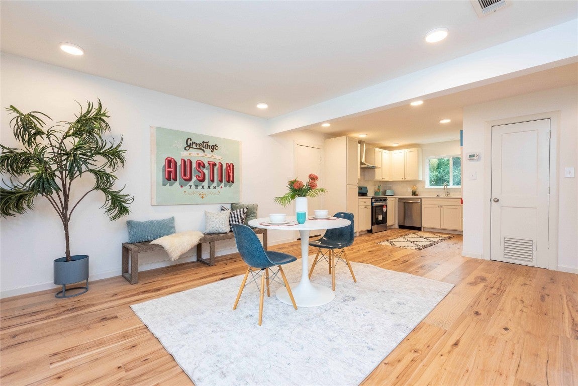 Thoughtfully restored, this captivating 1960s Garrison Colonial off South Congress seamlessly merges timeless allure with contemporary refinements, minutes away from South Congress' vibrant offerings, premier dining establishments, upscale shopping destinations, and dynamic entertainment venues. Masterfully revitalized, this home features an open floor plan with modern updates The residence boasts three spacious bedrooms and two full bathrooms, with a flex space off the garage. The traditional entry offers the choice of dining and living spaces on each side. With custom cabinetry throughout, the kitchen and bathroom offer a rare, bespoke finish for the area. The large lot has a private backyard setting, with a city owned lot next door. The garage includes an electric car plug in, aforementioned flex space and direct access to the home. The home includes recent upgrades of a metal roof, hardwood flooring, water heater and windows throughout.
