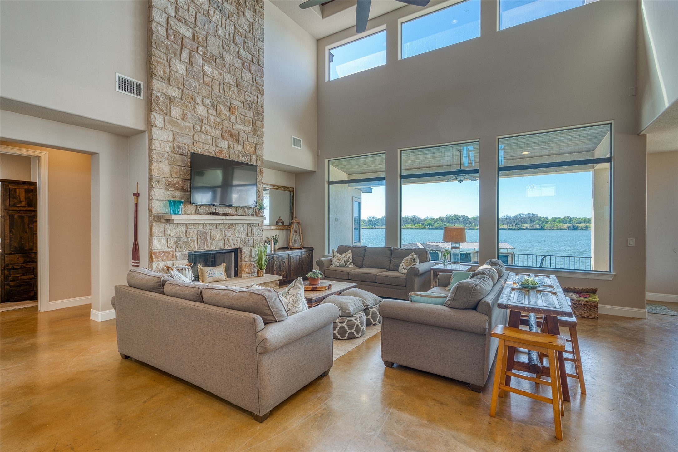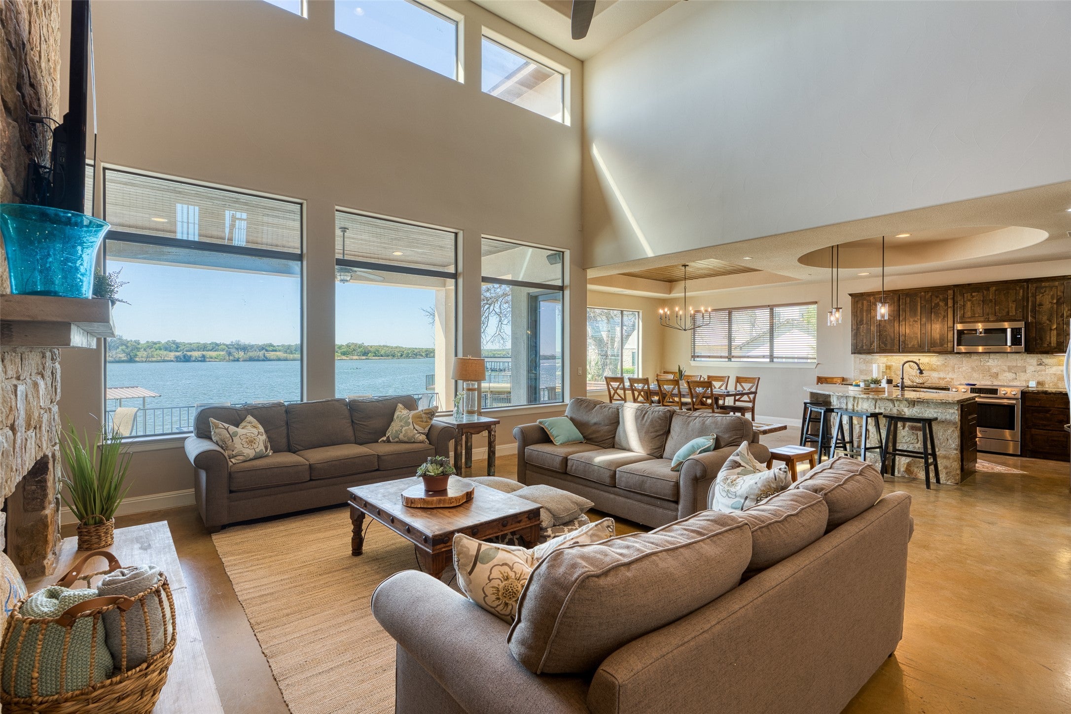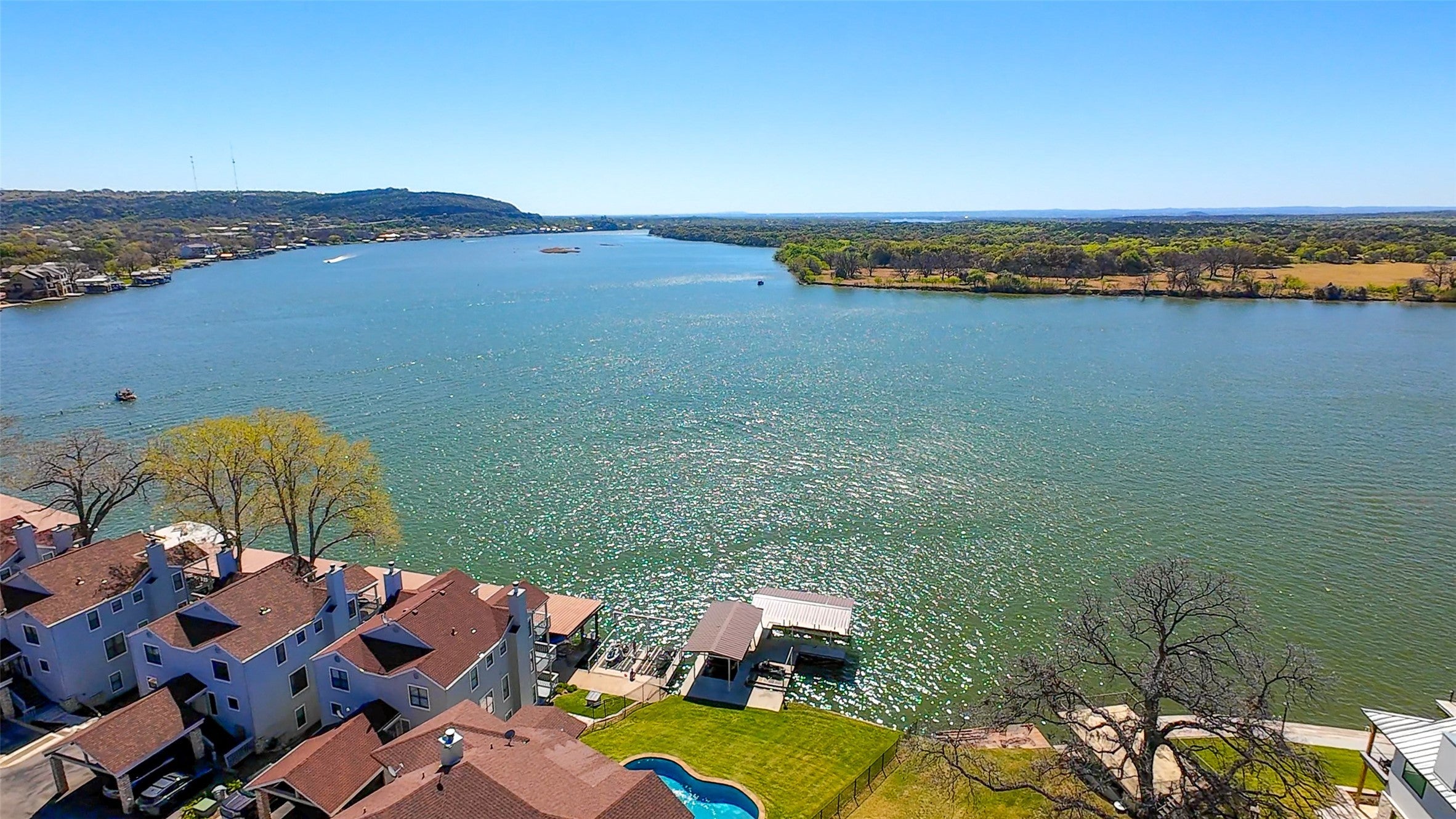 A turnkey waterfront property that balances luxury, privacy, and investment appeal, 517 Reynolds is built for the way people actually want to live on Lake LBJ. This 5-bedroom, 4-bath Lake LBJ retreat delivers nearly 4,000 sf designed for effortless lake living, with the rare ability to host extended family in comfort while also performing as a short-term rental. Built in 2016 and offered fully furnished, minus a few personal exclusions, the home is move-in ready and thoughtfully arranged for large gatherings, with generous living spaces, multiple sleeping areas, and seamless flow to the outdoors. Set on 70’ of southeast-facing open water frontage, the one-of-a-kind view is wide, unobstructed, and unusually peaceful, stretching across to ranch land and open sky, with the kind of lake backdrop where even seeing the cows across the water becomes part of the charm. Outside, the pool creates a true resort feel, while the private concrete and steel boat dock features 2 boat slips and 2 jet-ski lifts for easy days on the water. Positioned on .44 acres, the property enjoys quick access to boating, dining, and lake activity while staying removed from the noise, heavy traffic, and constant wake of the busier stretches nearby. 517 Reynolds is a rare combination of luxury, flexibility, and income potential located on one of Lake LBJ’s most desirable waterfront settings.