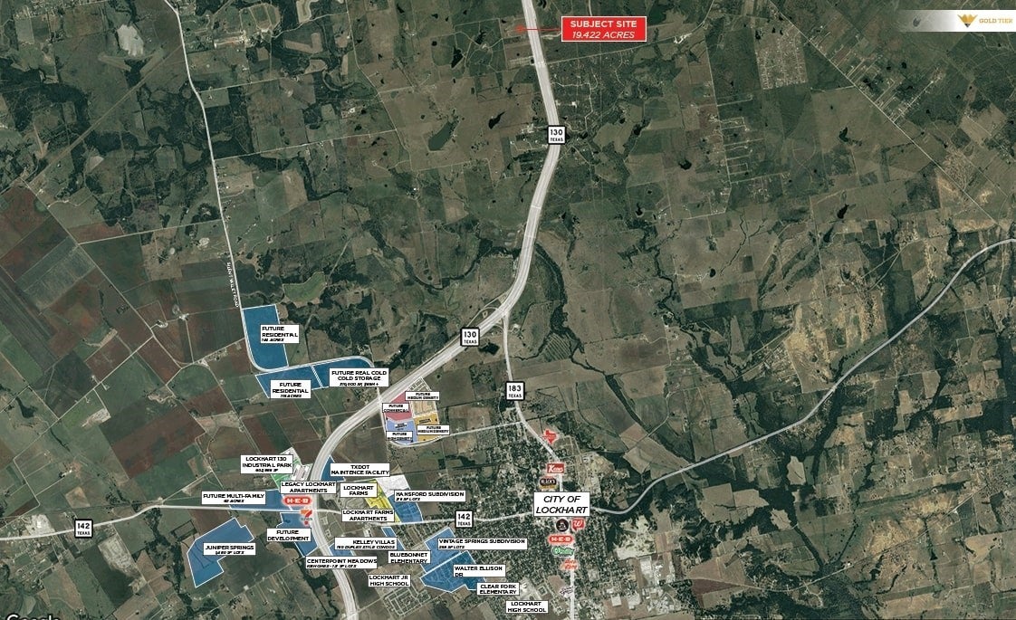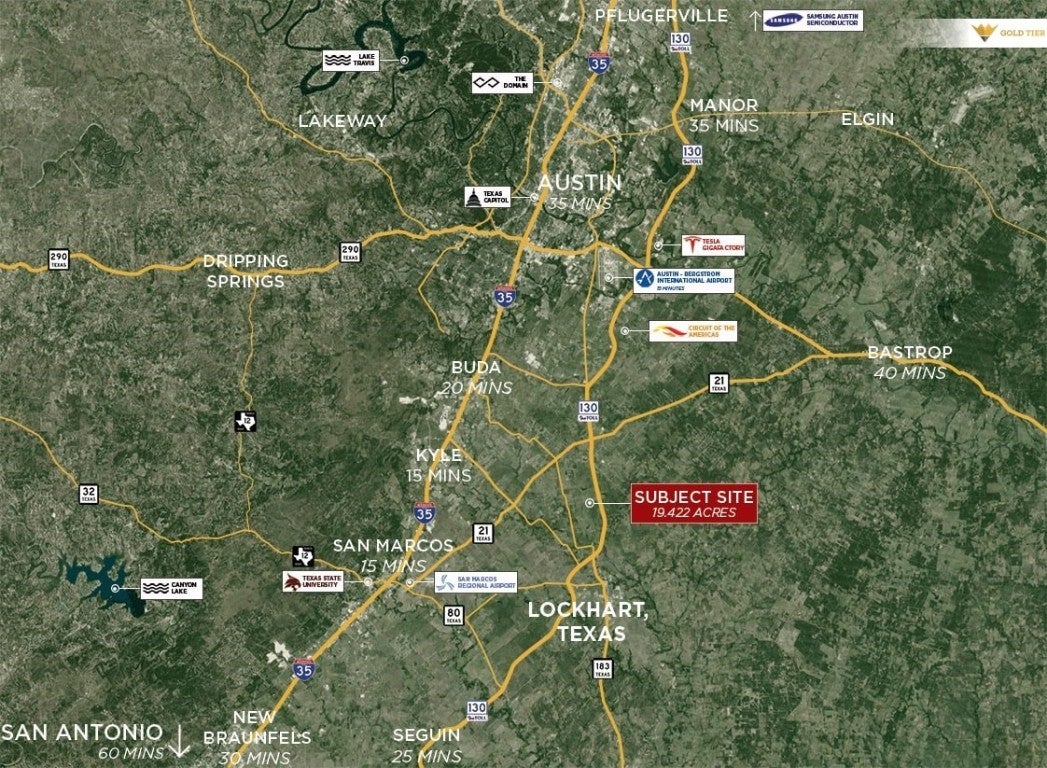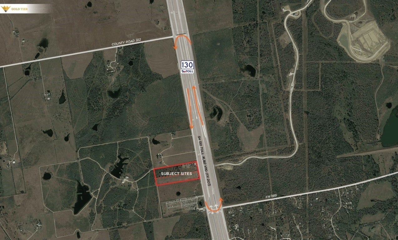 Gold Tier is proud to present a total of 19.422 acres on Toll 130 near Lockhart, Texas. The owner WILL subdivide into a 8.98 acre tract and a 10.44 acre tract. The price is $135,000/acre. This property offers excellent ingress and egress with nearby on-ramps and off-ramps (see page 4 of the brochure for details). The seller has preliminary plans for industrial outdoor storage, flex industrial, and boat/RV storage. With no zoning restrictions, the property is suitable for various industrial storage or manufacturing uses. Aqua has installed a 4-inch water line to the site, and the seller has an agreement with Aqua to allocate LUEs to the property. Septic will be required. The property is conveniently located near major developments such as Circuit of the Americas, Austin International Airport, Goodnight Ranch, and Easton Park.