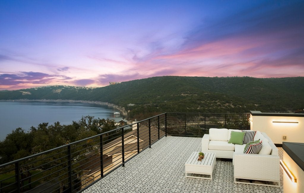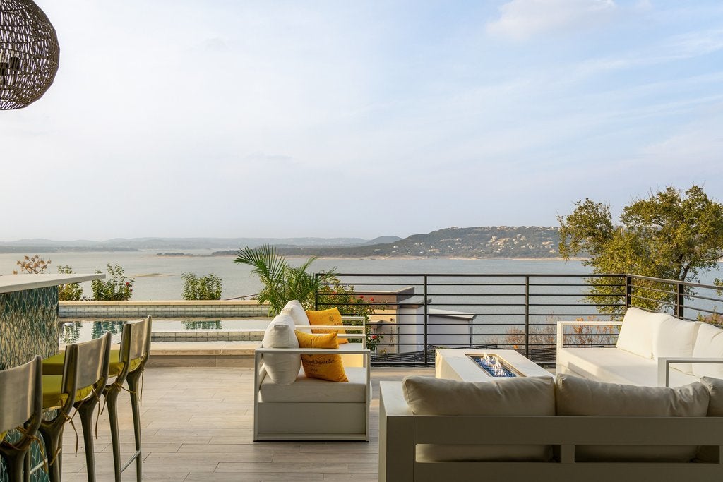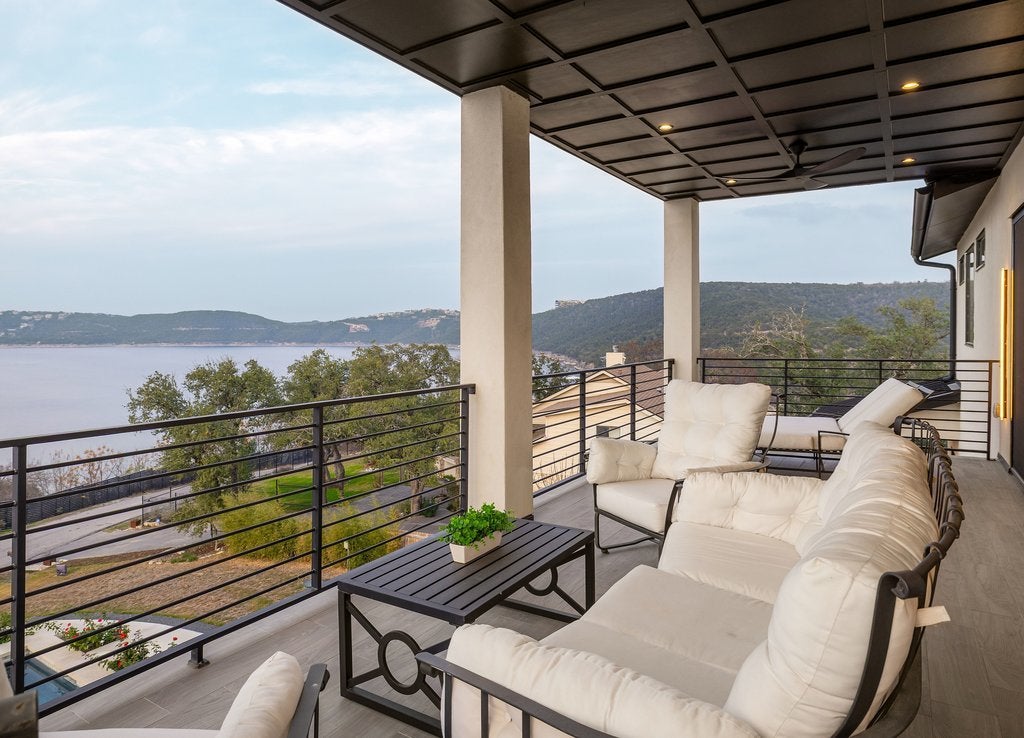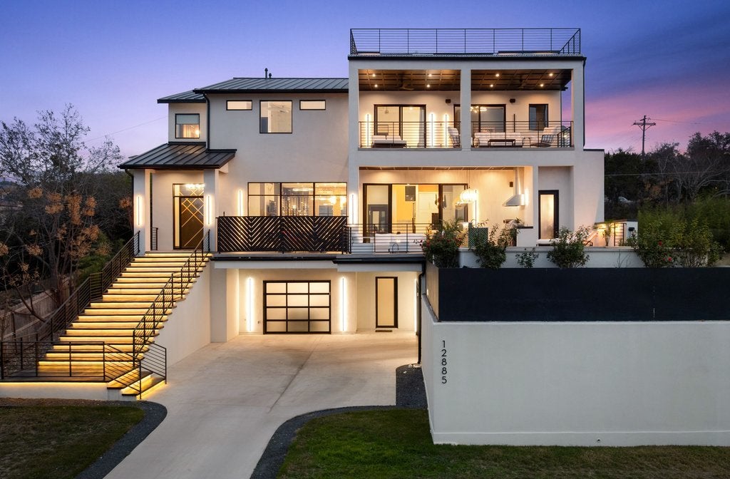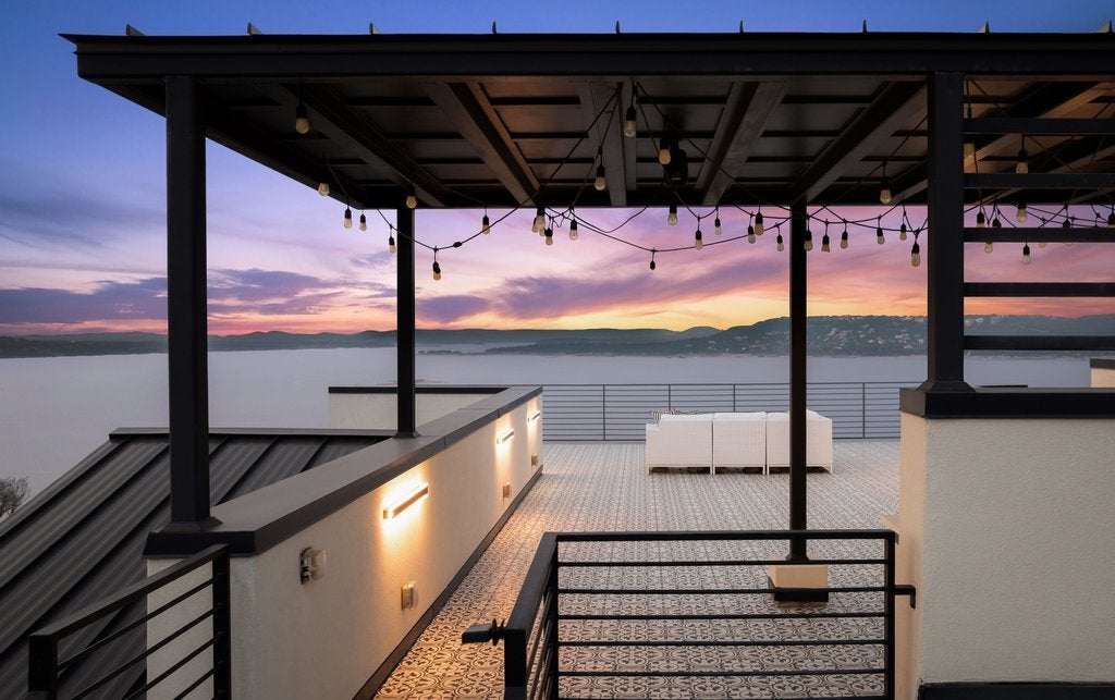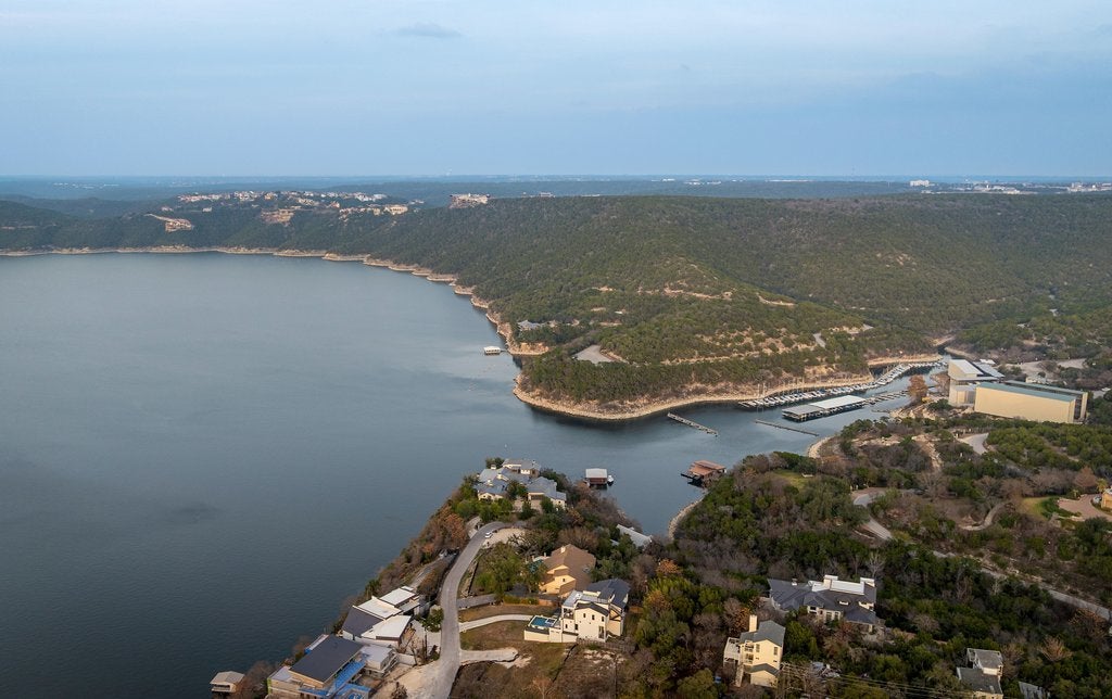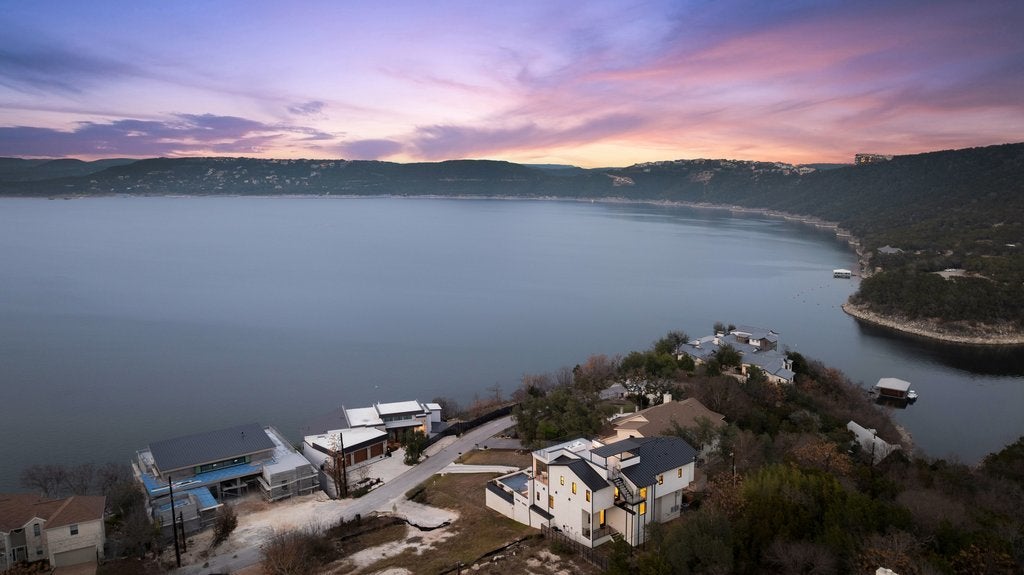 Panoramic Lake Travis and Hill Country views, iconic sunsets, and close proximity to the water. Built in 2022, this contemporary three-level residence is located less than one mile from Marshall Ford Marina and minutes from The Oasis, offering easy access to boating, dining, and lake recreation. Designed for indoor-outdoor living, expansive terraces on multiple levels and a rooftop patio with unobstructed lake views are featured. Floor-to-ceiling windows throughout the main living areas provide natural light and frame the vistas. The main level offers an open-concept layout connecting the living, dining, and kitchen areas, ideal for entertaining. The chef’s kitchen includes a large center island, marble countertops, premium appliances, and a butler’s pantry. A fireplace, glass-enclosed wine room, and wet bar add functionality and architectural interest. A private guest suite with full bath is located on the main level, and a 3-stop elevator provides access to all floors. The primary suite features a private balcony overlooking Lake Travis and a spa-style bath with dual vanities, soaking tub, walk-in shower, and two closets, including an oversized boutique-style walk-in. Additional en-suite bedrooms provide privacy, and a dedicated study offers flexibility as a fifth bedroom and shares access to the primary balcony. Outdoor spaces include multiple covered and open-air terraces for dining and lounging, a pool and spa, and a rooftop deck designed for sunset views and entertaining. Located in Austin’s limited use jurisdiction within the Hughes Park Lake area, the property offers additional flexibility for ownership, including the potential for short-term rental use, subject to buyer verification of current regulations. Public water access, nearby marinas, golf, dining, and shopping are all minutes away, with Downtown Austin and The Domain approximately 20 minutes away—delivering a convenient Lake Travis lifestyle with year-round accessibility.
