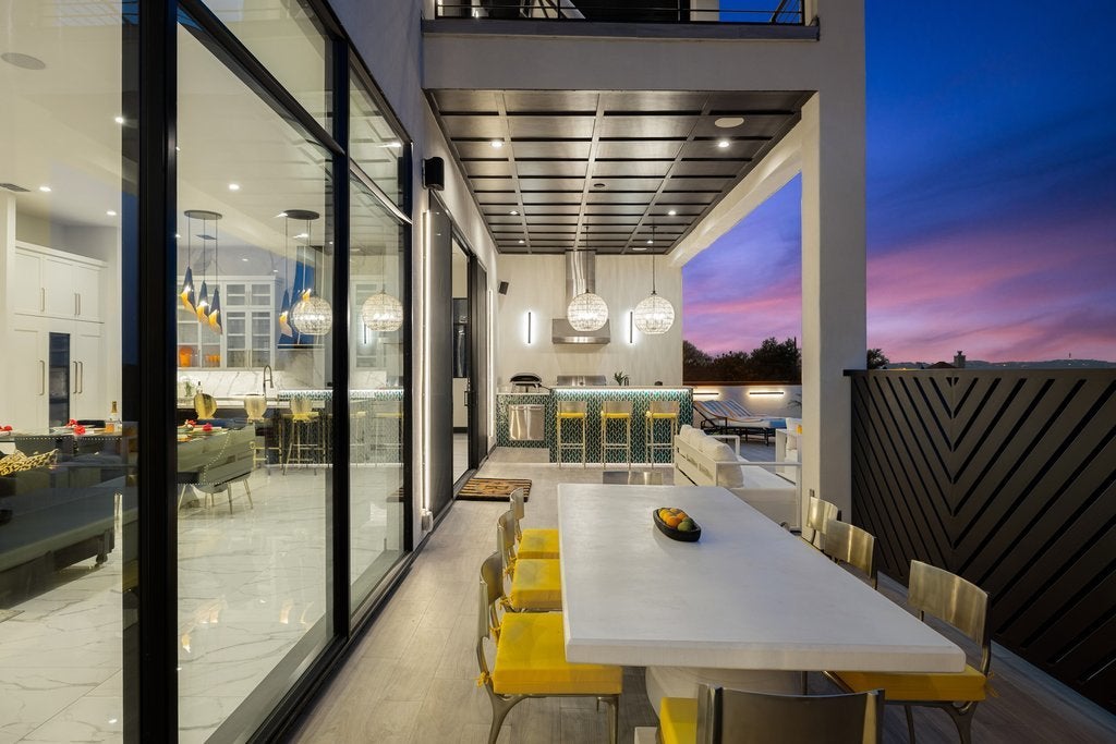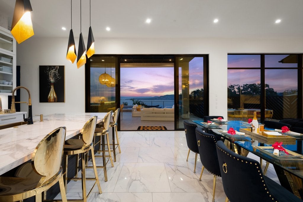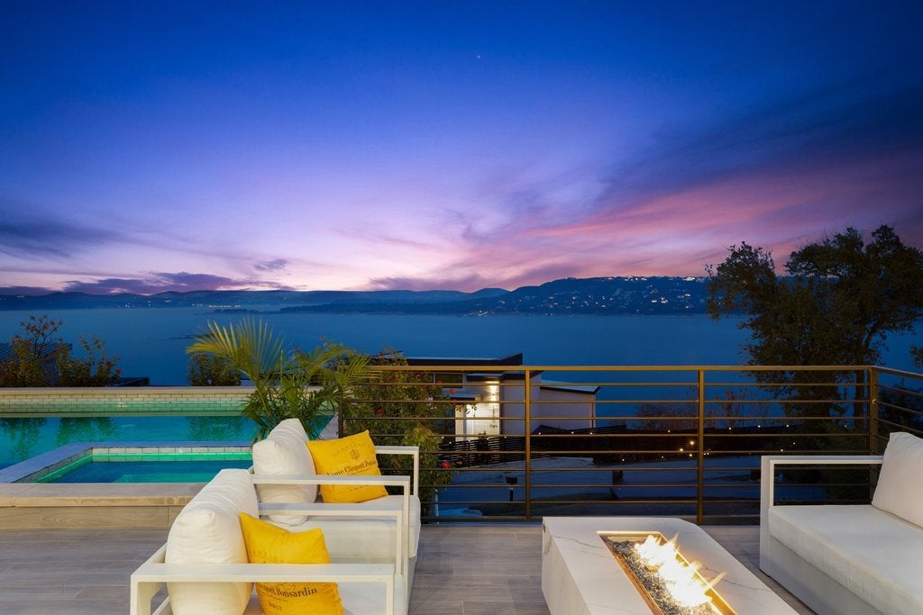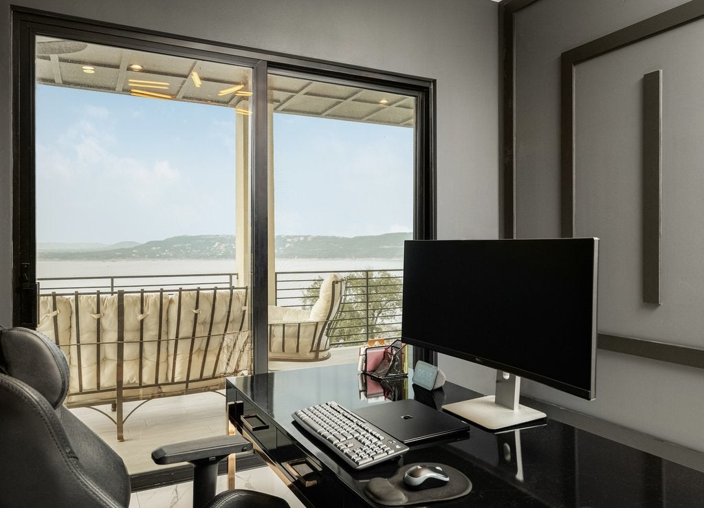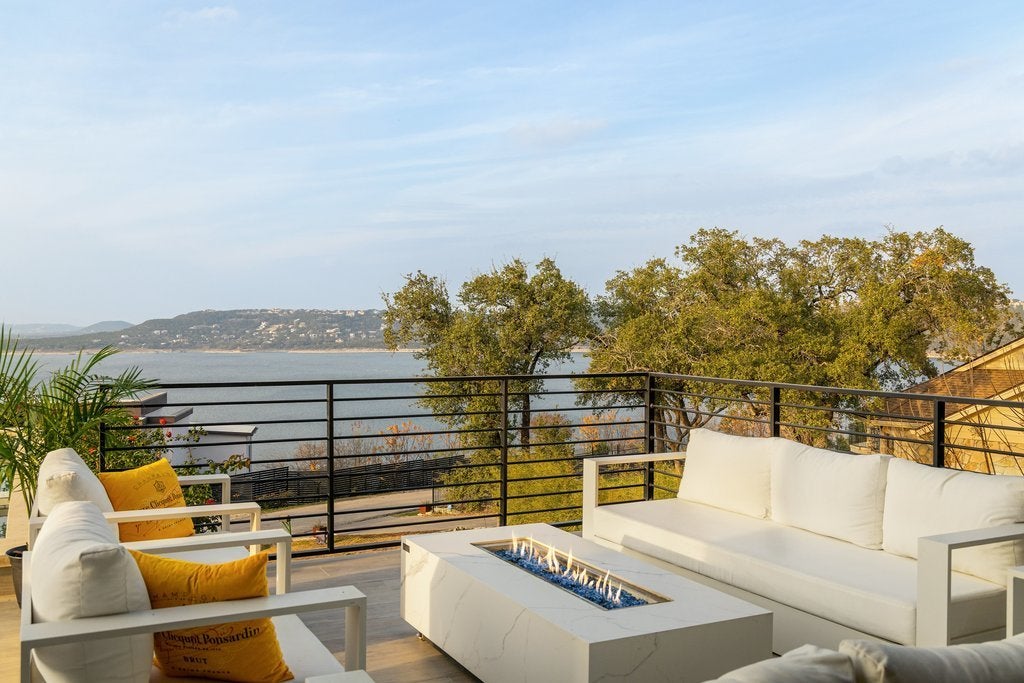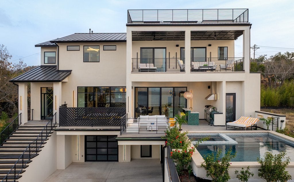 Panoramic Lake Travis and Hill Country views, iconic sunsets, and close proximity to the water. Built in 2022, this contemporary three-level residence is located less than one mile from Marshall Ford Marina and minutes from The Oasis, offering easy access to boating, dining, and lake recreation. Designed for indoor-outdoor living, expansive terraces on multiple levels and a rooftop patio with unobstructed lake views are featured. Floor-to-ceiling windows throughout the main living areas provide natural light and frame the vistas. The main level offers an open-concept layout connecting the living, dining, and kitchen areas, ideal for entertaining. The chef’s kitchen includes a large center island, marble countertops, premium appliances, and a butler’s pantry. A fireplace, glass-enclosed wine room, and wet bar add functionality and architectural interest. A private guest suite with full bath is located on the main level, and a 3-stop elevator provides access to all floors. The primary suite features a private balcony overlooking Lake Travis and a spa-style bath with dual vanities, soaking tub, walk-in shower, and two closets, including an oversized boutique-style walk-in. Additional en-suite bedrooms provide privacy, and a dedicated study offers flexibility as a fifth bedroom and shares access to the primary balcony. Outdoor spaces include multiple covered and open-air terraces for dining and lounging, a pool and spa, and a rooftop deck designed for sunset views and entertaining. Located in Austin’s limited use jurisdiction within the Hughes Park Lake area, the property offers additional flexibility for ownership, including the potential for short-term rental use, subject to buyer verification of current regulations. Public water access, nearby marinas, golf, dining, and shopping are all minutes away, with Downtown Austin and The Domain approximately 20 minutes away—delivering a convenient Lake Travis lifestyle with year-round accessibility.