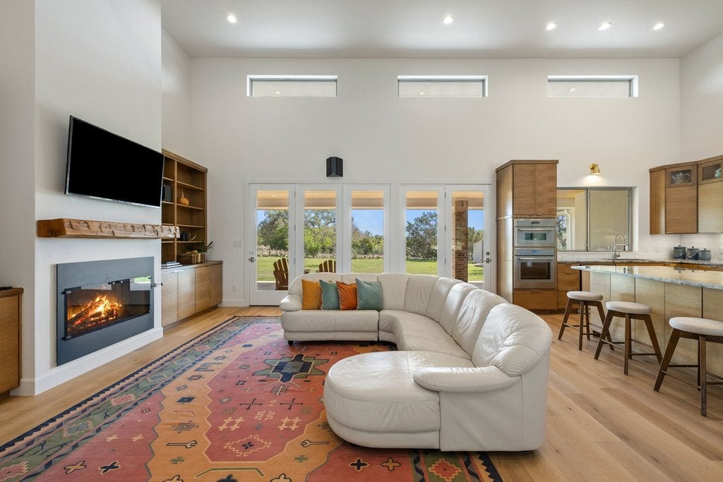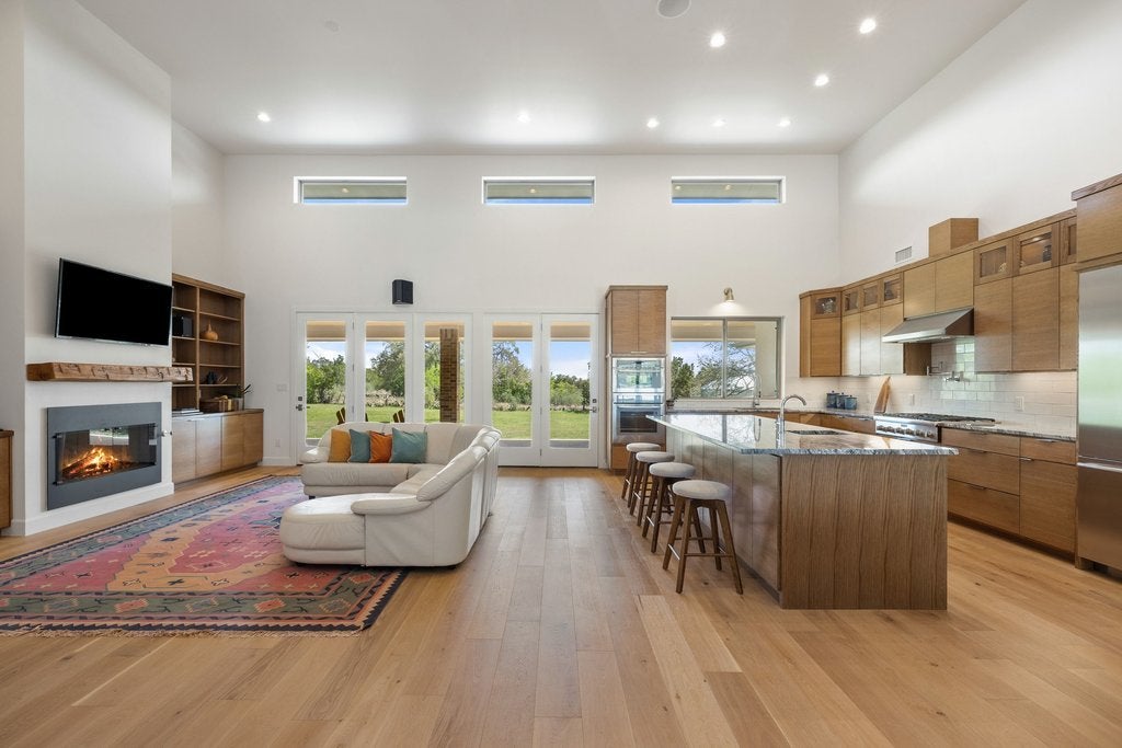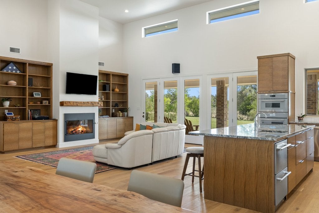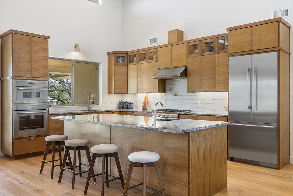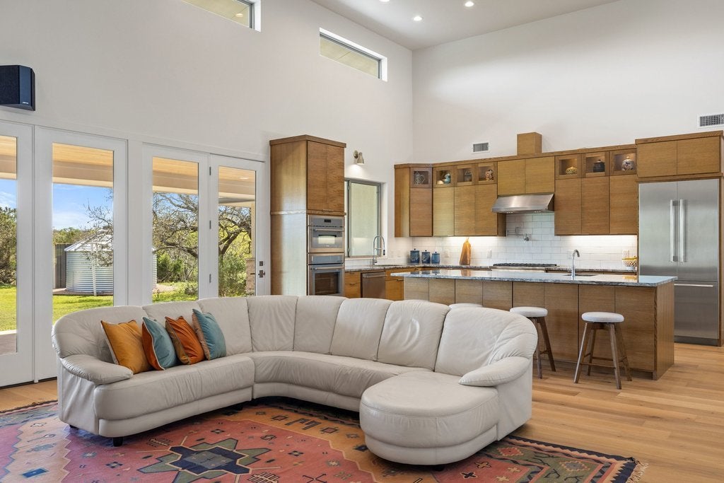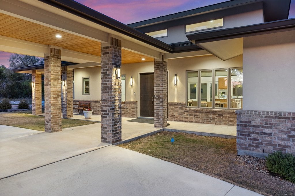 Tucked into the heart of the Texas Hill Country, 405 Spicewood Trails is a striking Frank Lloyd Wright–inspired masterpiece where timeless mid-century modern design meets refined, modern living. Set on a private, tree-filled acre backing to a private ranch, this property offers rare seclusion with no rear neighbors and a true connection to nature. Inside, soaring 16-foot ceilings anchor the great room, where expansive windows, warm hardwood floors, and clean architectural lines create an inviting yet dramatic living space. The chef’s kitchen is thoughtfully designed with premium Thermador appliances, custom rift white oak cabinetry, and sleek finishes that balance beauty and function. The home features three spacious bedrooms, three and a half baths, and a dedicated study, offering both comfort and flexibility. A separate studio with its own private entrance provides endless possibilities—ideal for a guest suite, creative workspace, fitness room, or private office. Every detail has been carefully considered, from level five wall finishes and integrated ceiling speakers to a propane fireplace, security system, and Generac generator for essential services. Energy efficiency is at the forefront with spray foam insulation, solar hot water heater panel, and an 80-gallon hot water collection tank. Step outside to enjoy the natural beauty of the property, where mature live oaks, cedar elms, and fruit trees create a peaceful, park-like setting. This property is a haven for bird watching and quiet mornings immersed in nature. A covered porte-cochere, circular driveway, and epoxy-finished garage floors complete the home’s thoughtful design and functionality. This is a rare opportunity to own a truly distinctive architectural home in one of Spicewood’s most desirable settings.