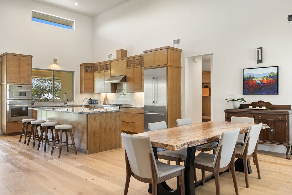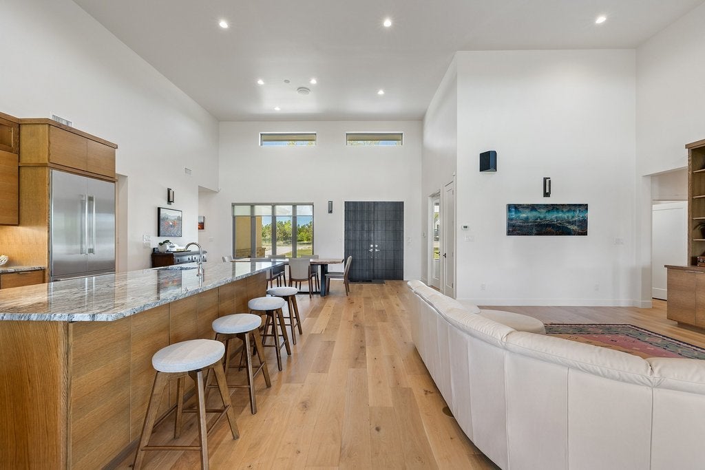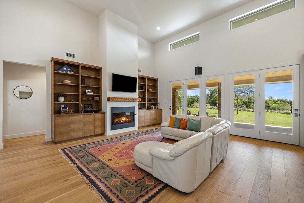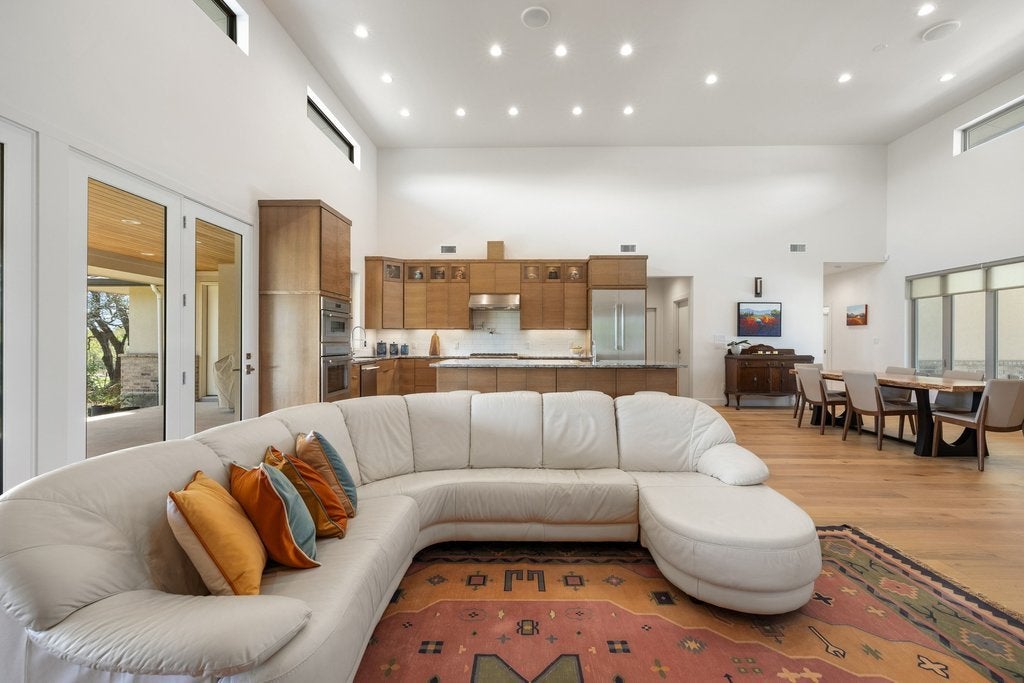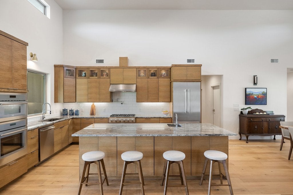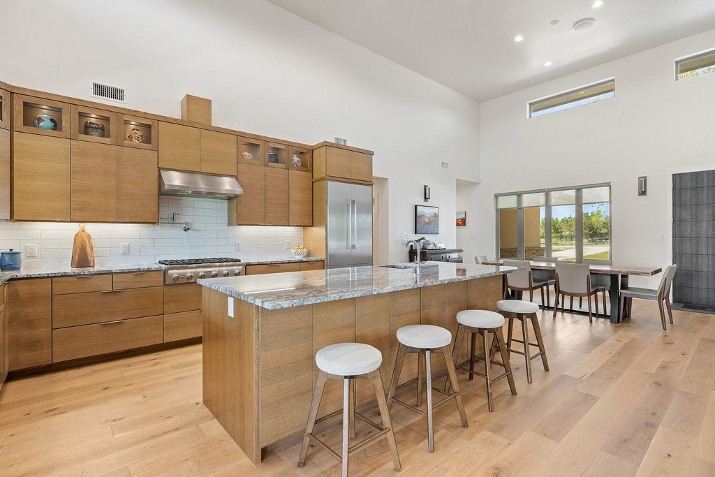 Tucked into the heart of the Texas Hill Country, 405 Spicewood Trails is a striking Frank Lloyd Wright–inspired masterpiece where timeless mid-century modern design meets refined, modern living. Set on a private, tree-filled acre backing to a private ranch, this property offers rare seclusion with no rear neighbors and a true connection to nature. Inside, soaring 16-foot ceilings anchor the great room, where expansive windows, warm hardwood floors, and clean architectural lines create an inviting yet dramatic living space. The chef’s kitchen is thoughtfully designed with premium Thermador appliances, custom rift white oak cabinetry, and sleek finishes that balance beauty and function. The home features three spacious bedrooms, three and a half baths, and a dedicated study, offering both comfort and flexibility. A separate studio with its own private entrance provides endless possibilities—ideal for a guest suite, creative workspace, fitness room, or private office. Every detail has been carefully considered, from level five wall finishes and integrated ceiling speakers to a propane fireplace, security system, and Generac generator for essential services. Energy efficiency is at the forefront with spray foam insulation, solar hot water heater panel, and an 80-gallon hot water collection tank. Step outside to enjoy the natural beauty of the property, where mature live oaks, cedar elms, and fruit trees create a peaceful, park-like setting. This property is a haven for bird watching and quiet mornings immersed in nature. A covered porte-cochere, circular driveway, and epoxy-finished garage floors complete the home’s thoughtful design and functionality. This is a rare opportunity to own a truly distinctive architectural home in one of Spicewood’s most desirable settings.
