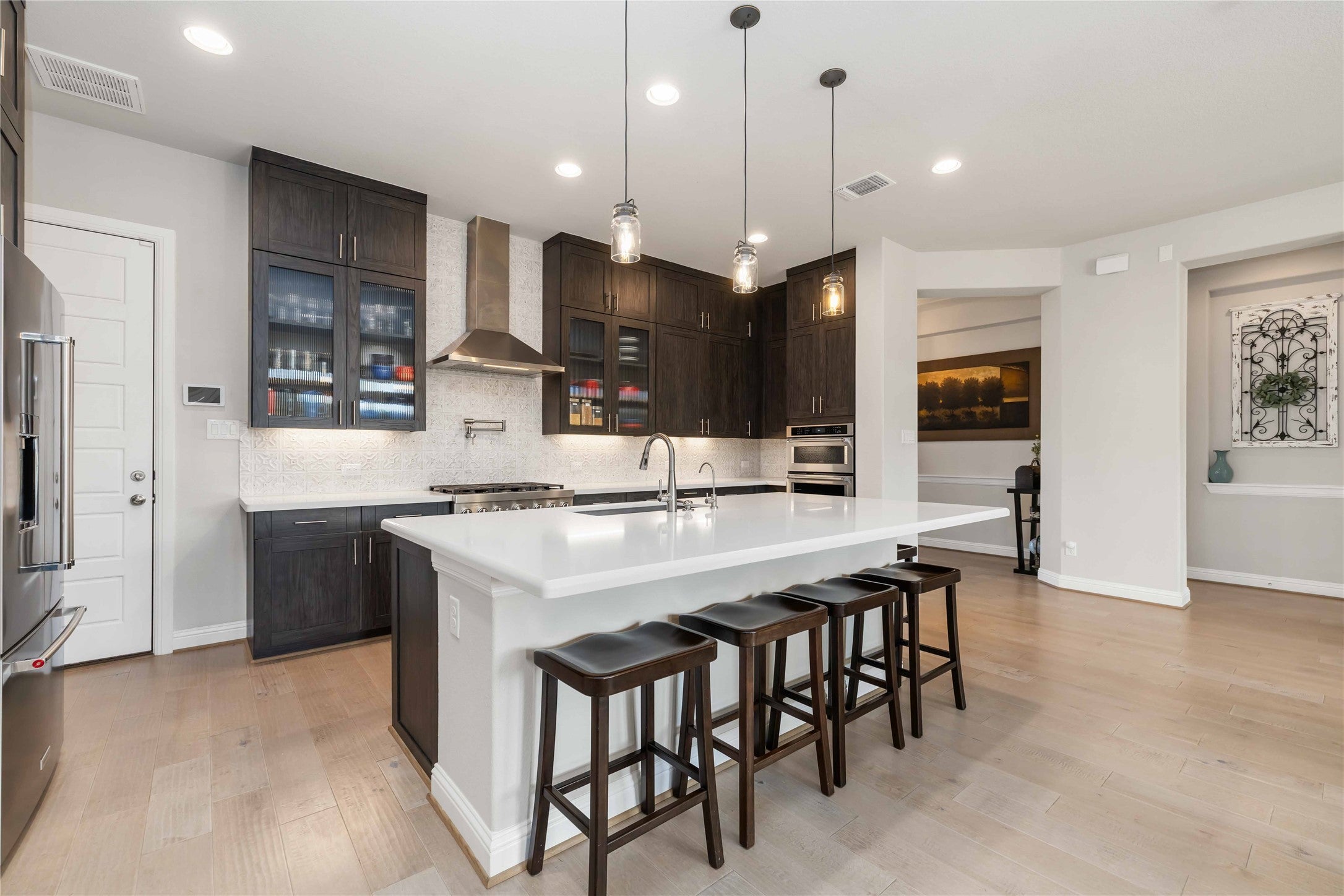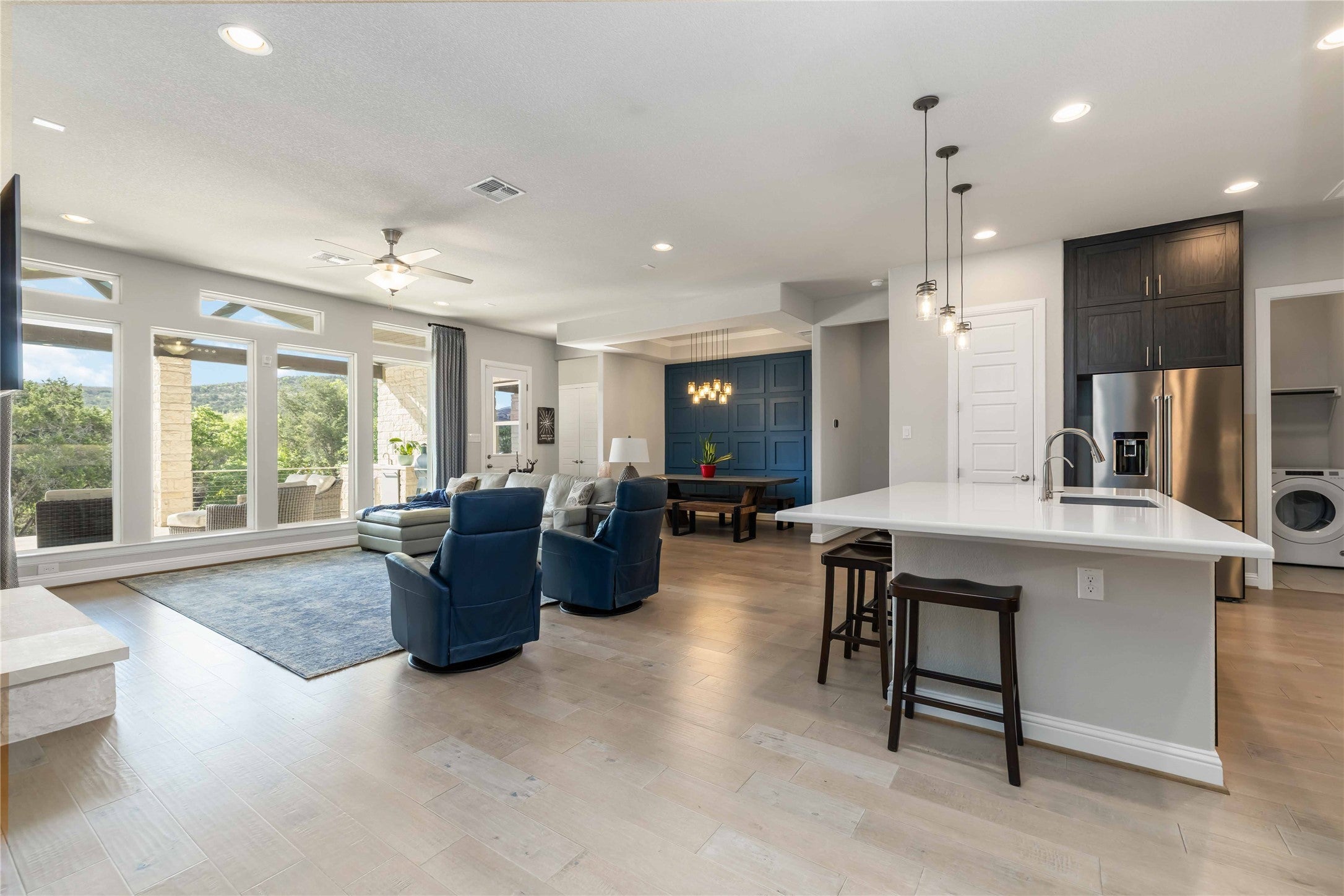 Nestled on a quiet cul-de-sac in the highly sought-after Rough Hollow Lakeway community, this stunning single-story Scott Felder home (built 2019) offers the perfect blend of luxury, functionality, and lifestyle. Situated on a rare ~0.48-acre lot backing to greenbelt, this 4-bedroom, 3.5-bath home with dedicated office provides privacy, space, and Hill Country charm. Step inside to an open-concept floor plan filled with natural light, featuring wood flooring, high ceilings, and a seamless flow between the kitchen, dining, and living areas—ideal for both everyday living and entertaining. The gourmet kitchen is a chef’s dream, complete with quartz countertops, large center island, 6-burner gas range, double ovens, stainless steel appliances, walk-in pantry, and pot filler. The private primary suite offers a true retreat with high ceilings and a spa-like bath featuring dual vanities, soaking tub, oversized walk-in shower, and custom walk-in closet with natural light. Secondary bedrooms are thoughtfully positioned for privacy, offering flexibility on usage. Enjoy outdoor living at its finest with a covered patio, outdoor kitchen, built-in grill, refrigerator, and fireplace, all overlooking a spacious backyard with greenbelt views—perfect for entertaining or relaxing year-round. The yard extends beyond the back fence, allowing a protected space for pets and an additional large park-like retreat for relaxing and getting back to nature. Located in Rough Hollow, residents enjoy resort-style amenities including a yacht club & marina on Lake Travis, multiple pools, fitness center, tennis courts, hike & bike trails, restaurant, dog park, and planned social events. Zoned to Lake Travis ISD and just minutes from shopping, dining, and lake access—this home offers the best of Lakeway luxury living.