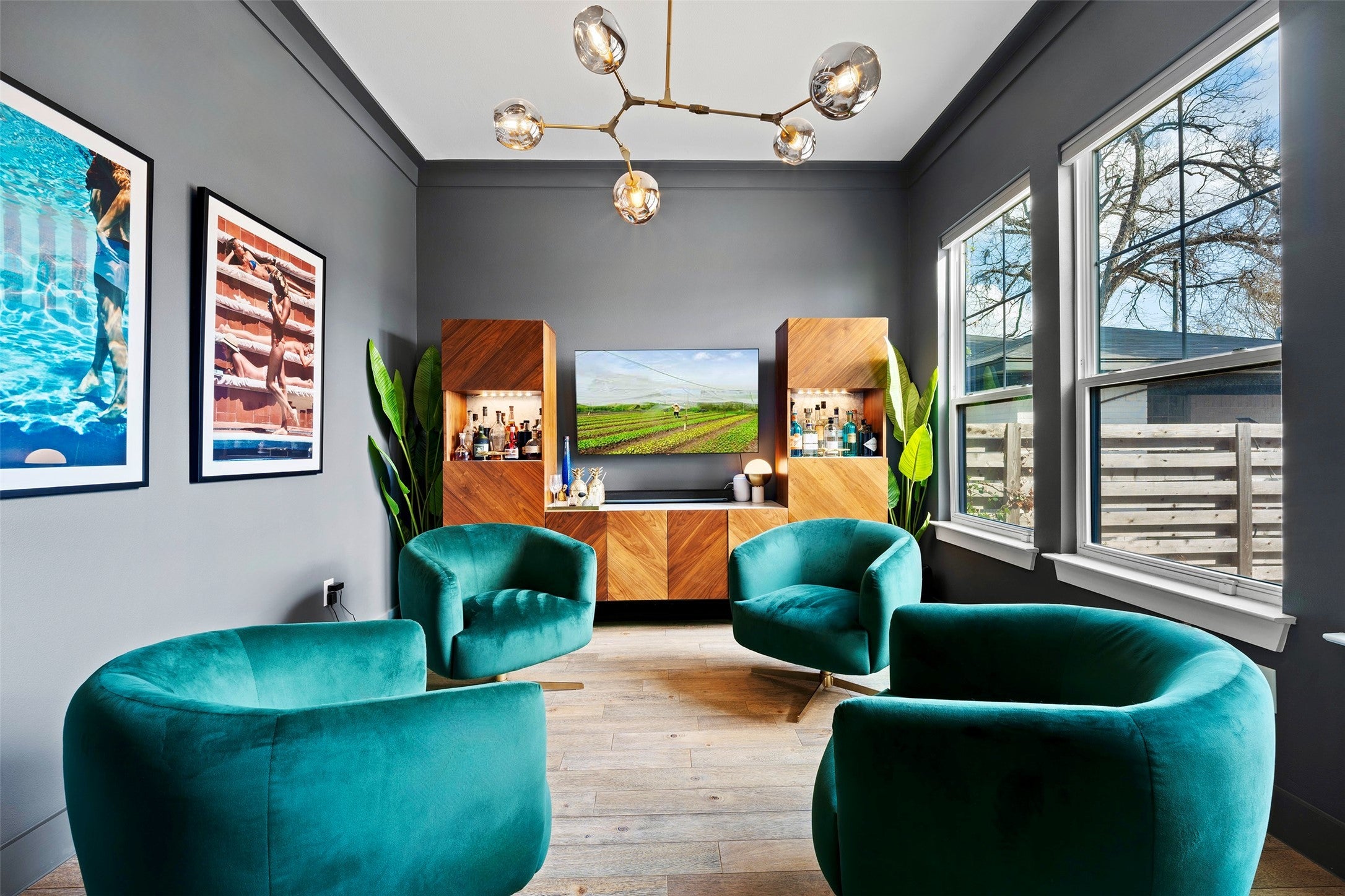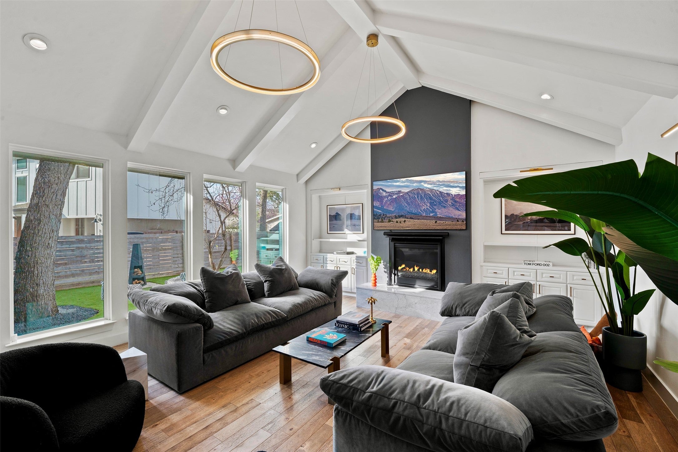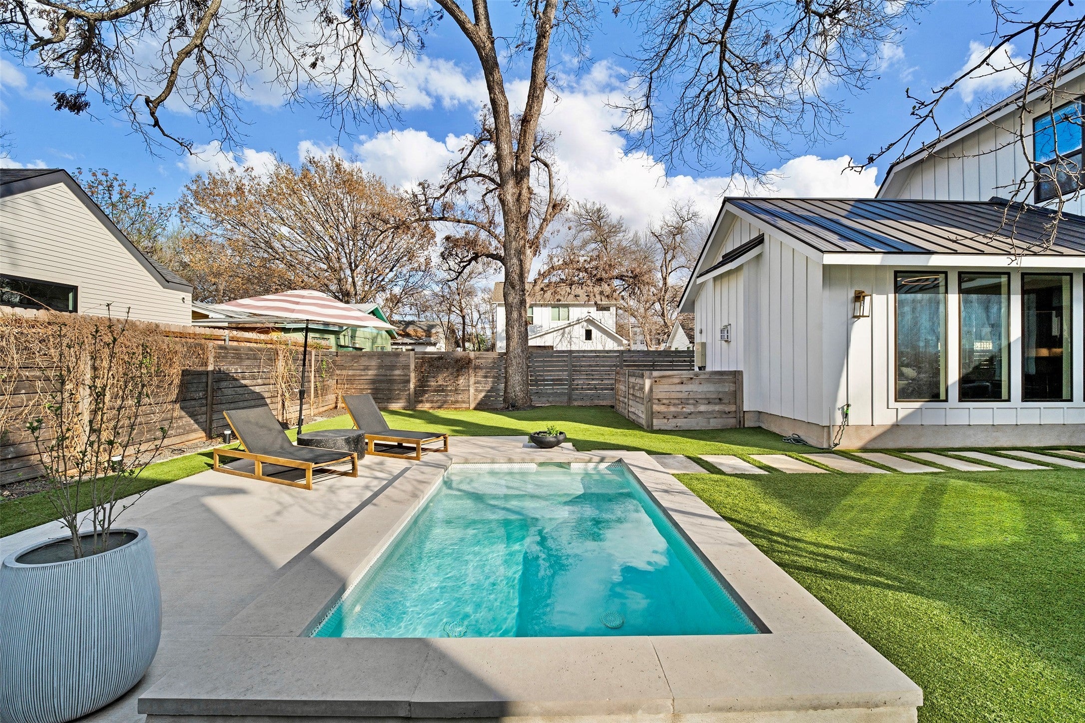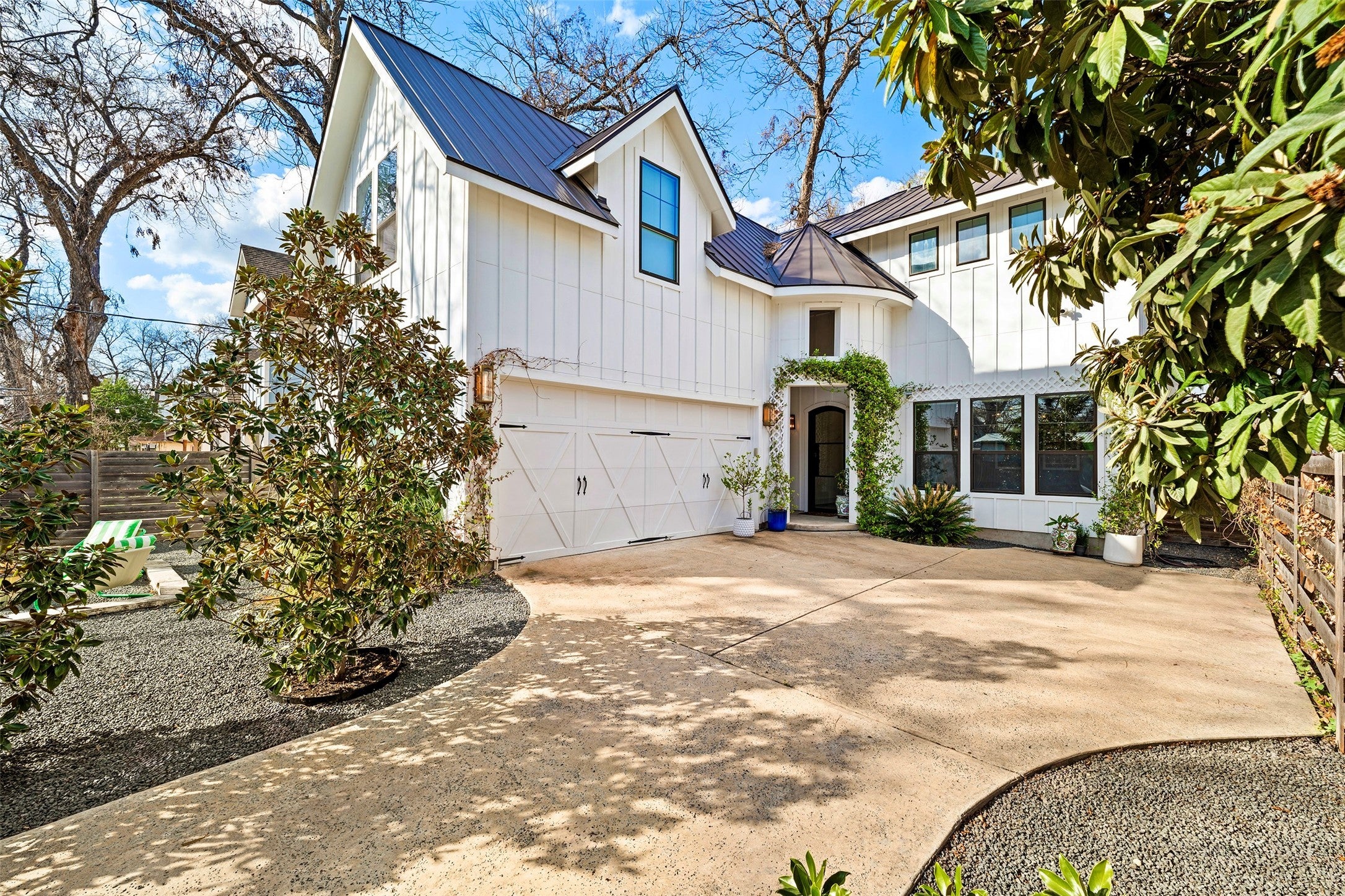 3112 Garwood immediately impresses with clean architectural lines, subtle curved walls, and a striking dark standing seam metal roof contrasted by crisp board and batten siding. A private courtyard drive offers a refined sense of arrival while enhancing privacy from the street. Inside, wide plank wood floors guide you to the central kitchen and continue into a vaulted living room filled with natural light. Exposed beams, oversized windows, and refined marble details add warmth and scale, creating an inviting space for everyday living and entertaining. The kitchen blends thoughtful design with everyday functionality. Custom cabinetry, marble backsplash, quartz countertops, and brass pendants frame an oversized island that naturally becomes the home's social hub. Sleek integrated appliances maintain clean lines while reinforcing the kitchen’s polished, high-end design. Thoughtfully chosen finishes infuse the home with personality and depth. Vibrant, color-rich spaces and a powder bath with striking wallpaper create a sense of artistry that sets this home apart from typical new construction. Upstairs, the primary suite is bright, private, and thoughtfully designed, with smart blinds that let natural light adjust throughout the day. The space flows into a dramatic bathroom with soaring ceilings, crystal chandeliers, double vanities with marble counters, a freestanding soaking tub beneath the window, and a spacious walk-in shower. A custom closet with floor-to-ceiling cabinetry, sculptural millwork, and open display shelving creates a dressing space that feels both elevated and highly functional. A covered patio with patterned tile extends to a landscaped backyard with lush turf and a pool designed for year-round enjoyment with heating and cooling from 40 to 104 degrees. Set among East Austin favorites like Machine Works, De Nada Tacos, East End Ballroom, and Kinda Tropical, this address places you at the heart of the East Side, minutes away from downtown Austin.