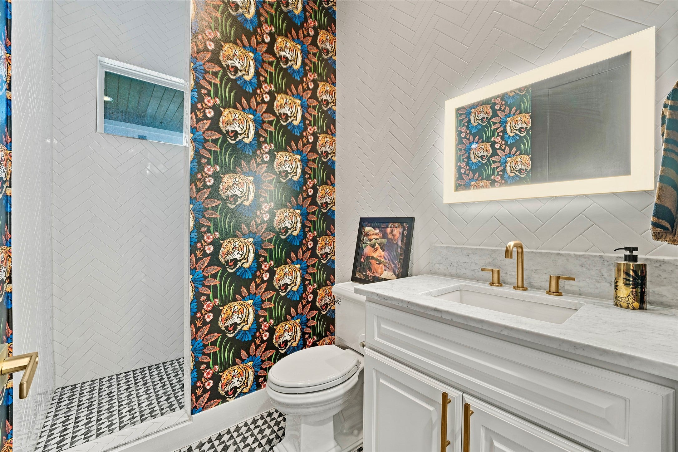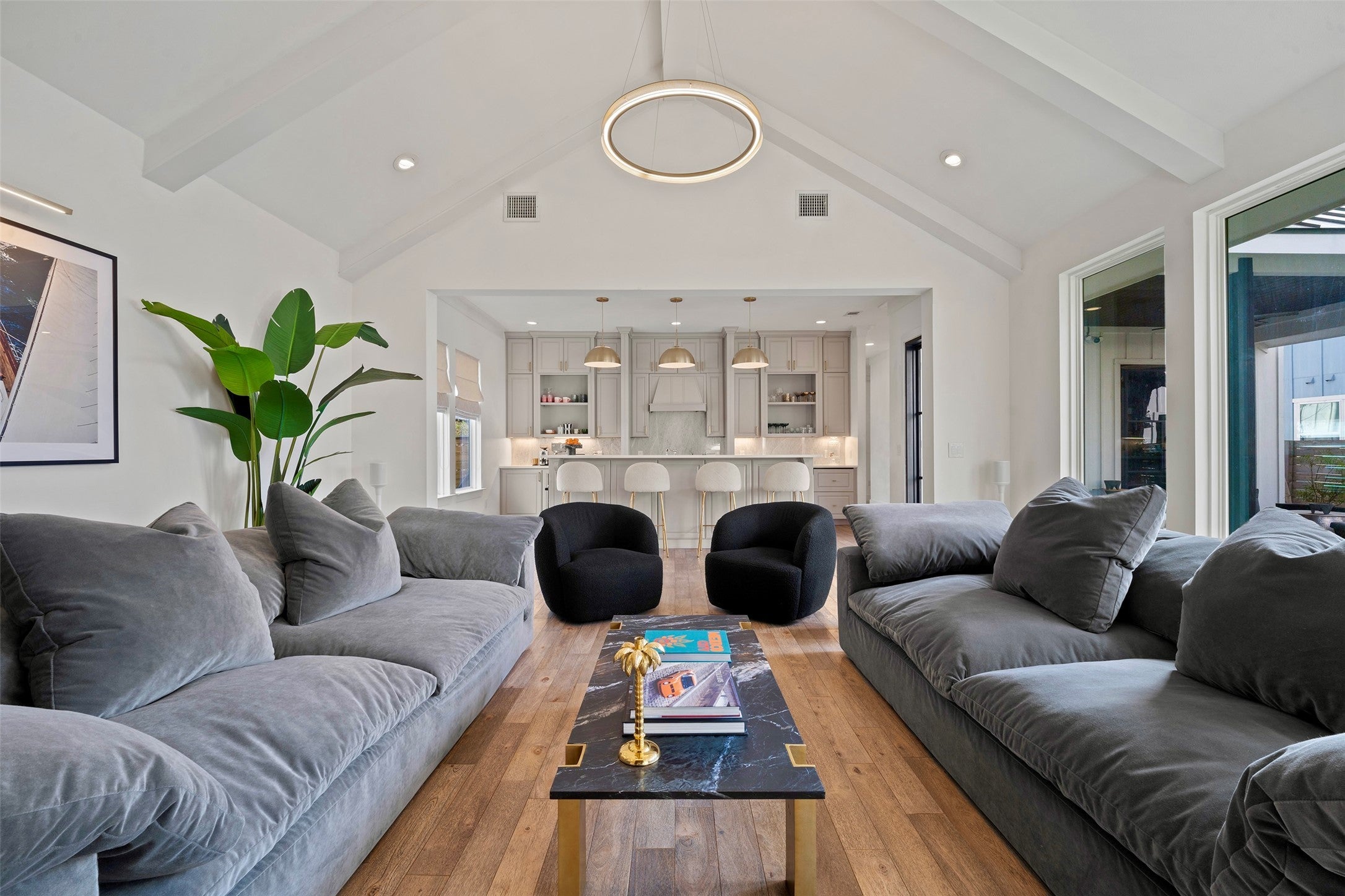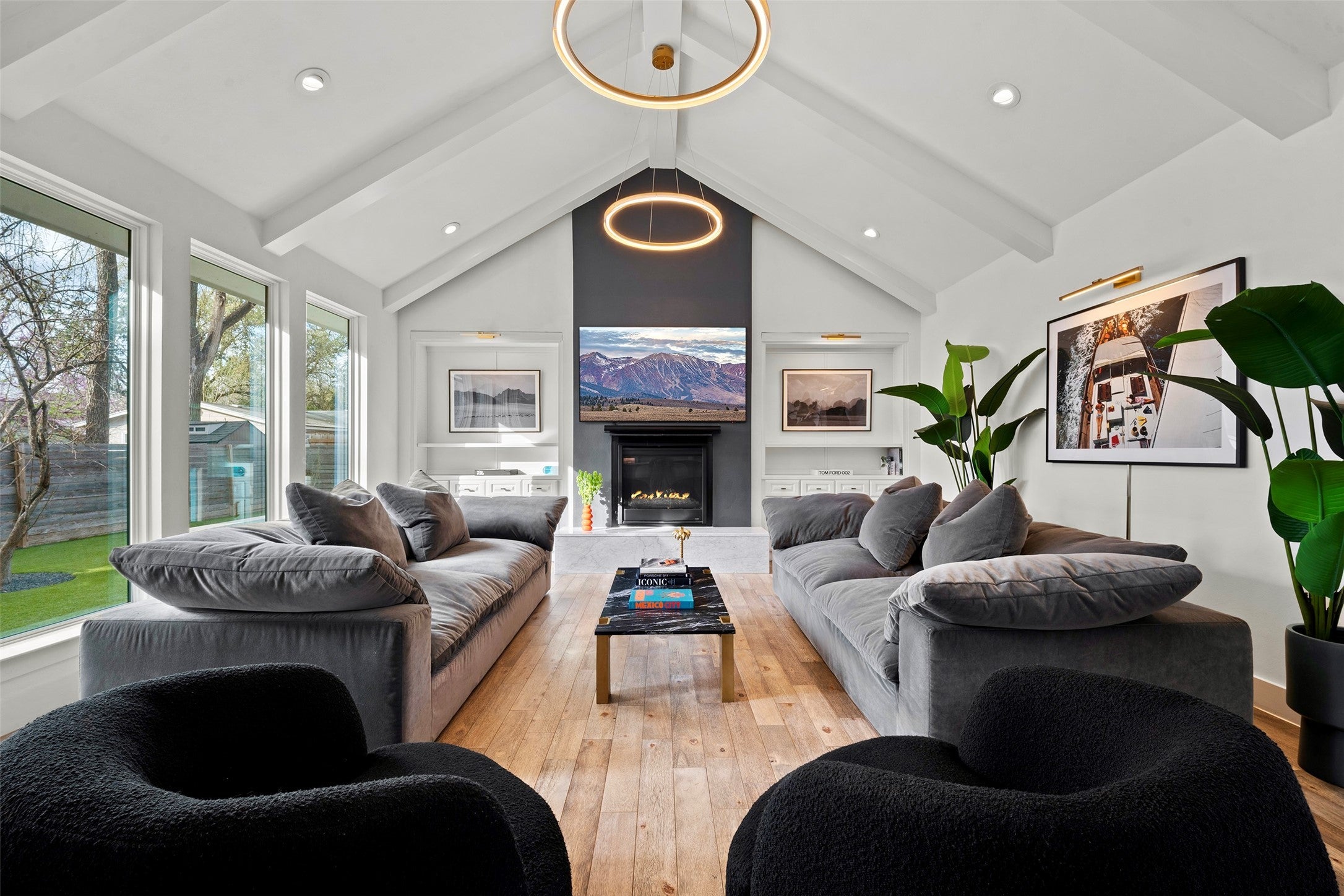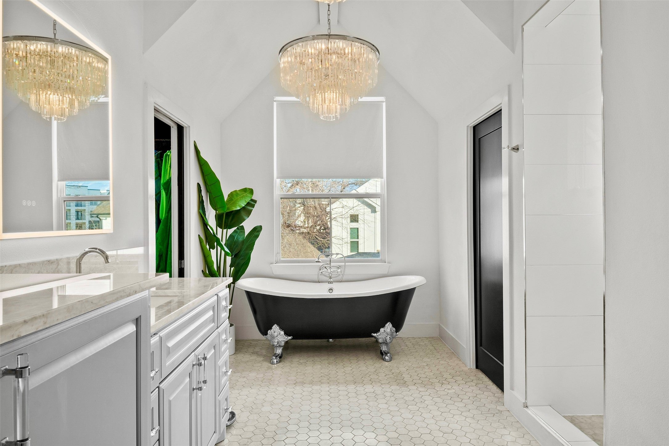 3112 Garwood immediately impresses with clean architectural lines, subtle curved walls, and a striking dark standing seam metal roof contrasted by crisp board and batten siding. A private courtyard drive offers a refined sense of arrival while enhancing privacy from the street. Inside, wide plank wood floors guide you to the central kitchen and continue into a vaulted living room filled with natural light. Exposed beams, oversized windows, and refined marble details add warmth and scale, creating an inviting space for everyday living and entertaining. The kitchen blends thoughtful design with everyday functionality. Custom cabinetry, marble backsplash, quartz countertops, and brass pendants frame an oversized island that naturally becomes the home's social hub. Sleek integrated appliances maintain clean lines while reinforcing the kitchen’s polished, high-end design. Thoughtfully chosen finishes infuse the home with personality and depth. Vibrant, color-rich spaces and a powder bath with striking wallpaper create a sense of artistry that sets this home apart from typical new construction. Upstairs, the primary suite is bright, private, and thoughtfully designed, with smart blinds that let natural light adjust throughout the day. The space flows into a dramatic bathroom with soaring ceilings, crystal chandeliers, double vanities with marble counters, a freestanding soaking tub beneath the window, and a spacious walk-in shower. A custom closet with floor-to-ceiling cabinetry, sculptural millwork, and open display shelving creates a dressing space that feels both elevated and highly functional. A covered patio with patterned tile extends to a landscaped backyard with lush turf and a pool designed for year-round enjoyment with heating and cooling from 40 to 104 degrees. Set among East Austin favorites like Machine Works, De Nada Tacos, East End Ballroom, and Kinda Tropical, this address places you at the heart of the East Side, minutes away from downtown Austin.