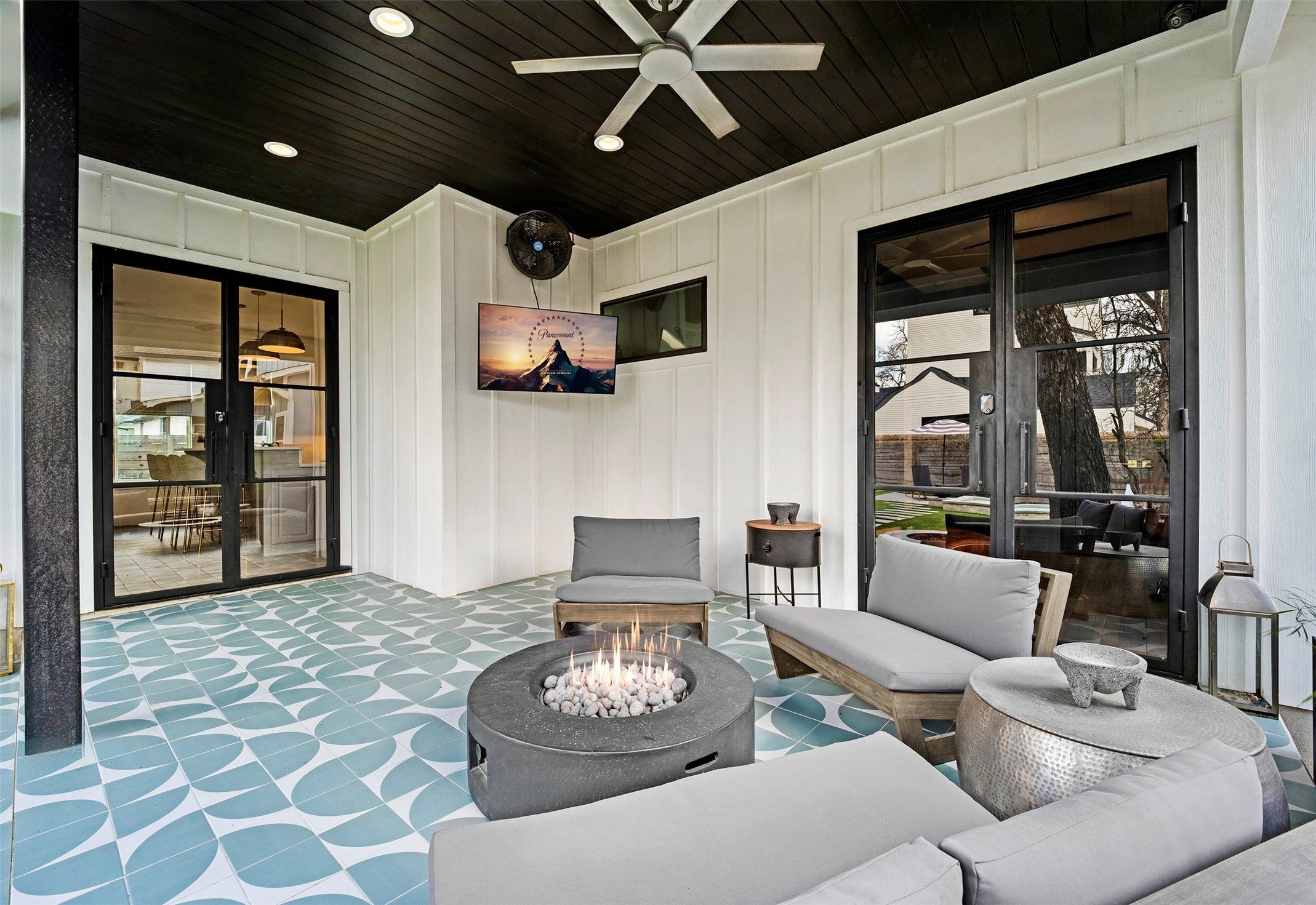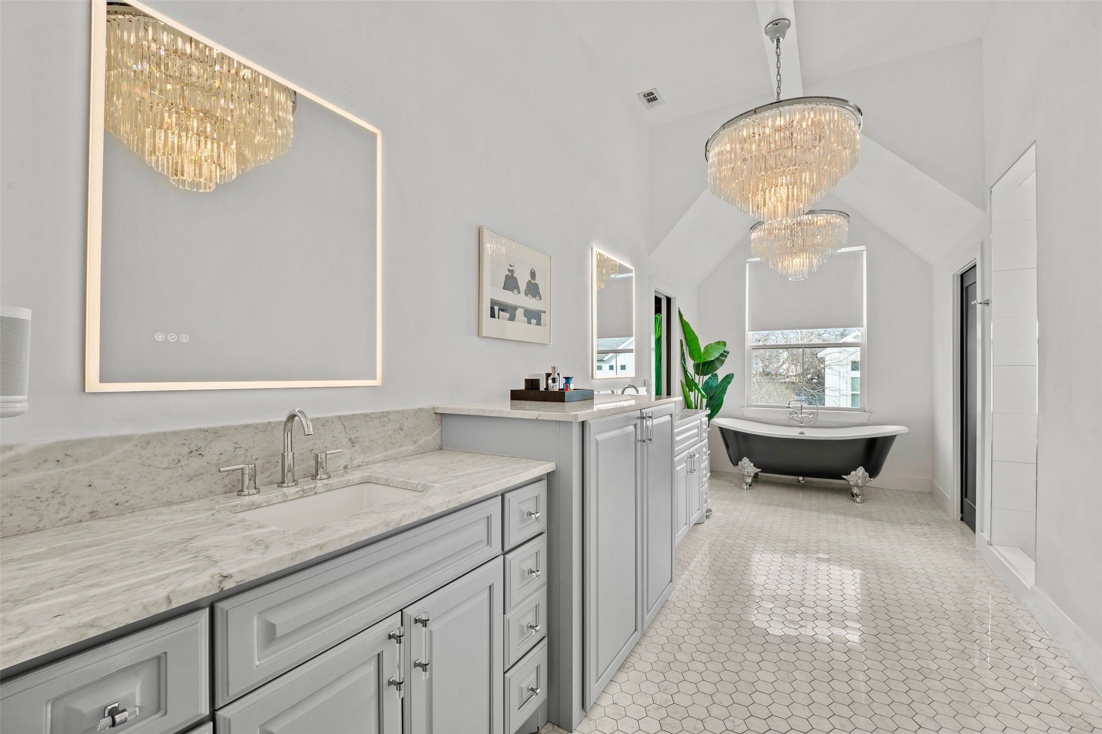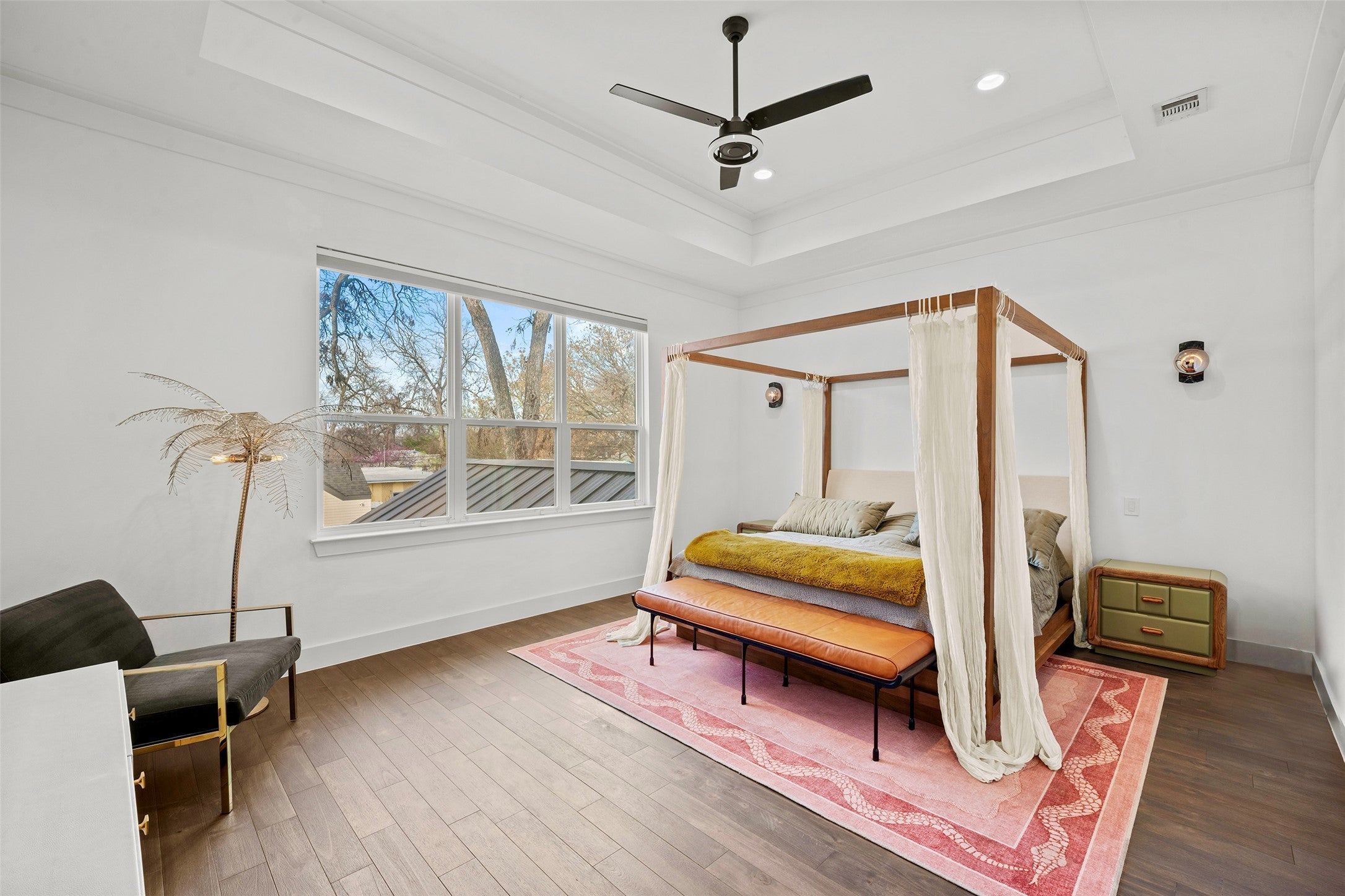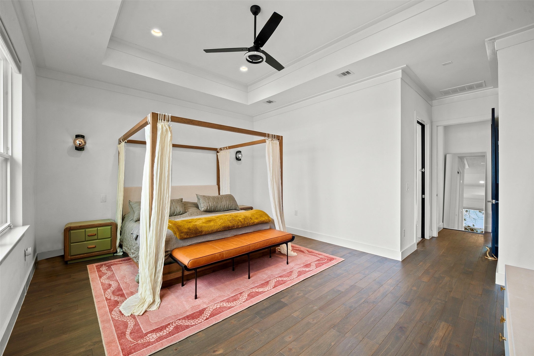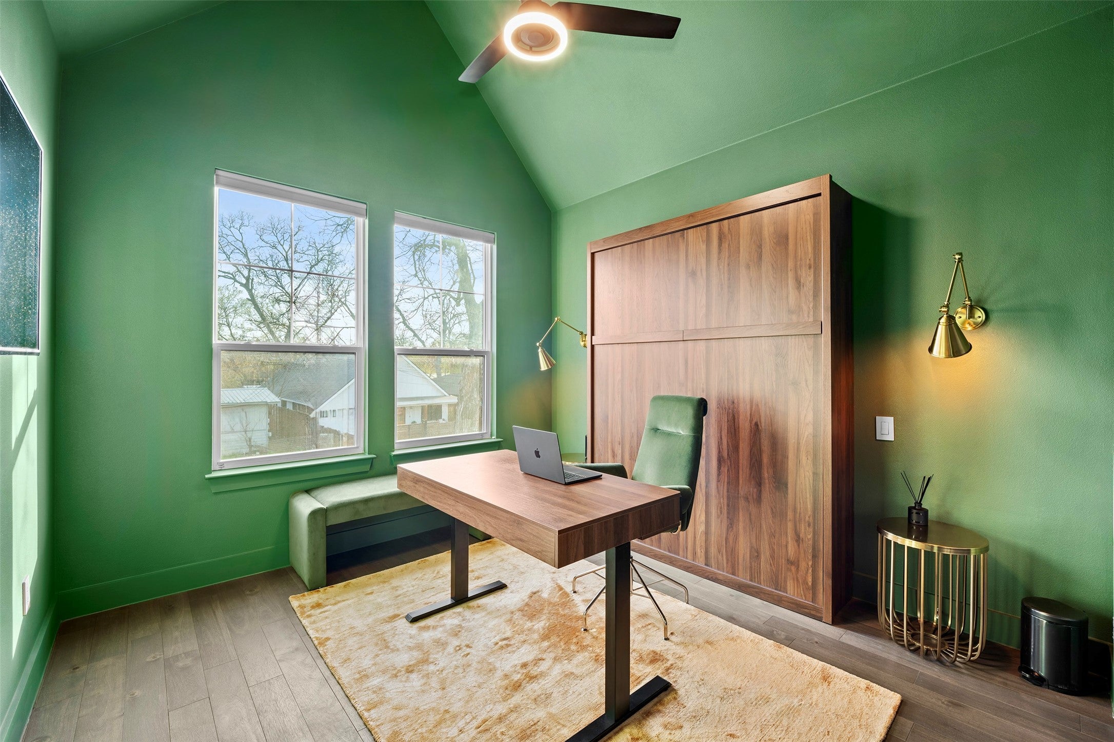 3112 Garwood immediately impresses with clean architectural lines, subtle curved walls, and a striking dark standing seam metal roof contrasted by crisp board and batten siding. A private courtyard drive offers a refined sense of arrival while enhancing privacy from the street. Inside, wide plank wood floors guide you to the central kitchen and continue into a vaulted living room filled with natural light. Exposed beams, oversized windows, and refined marble details add warmth and scale, creating an inviting space for everyday living and entertaining. The kitchen blends thoughtful design with everyday functionality. Custom cabinetry, marble backsplash, quartz countertops, and brass pendants frame an oversized island that naturally becomes the home's social hub. Sleek integrated appliances maintain clean lines while reinforcing the kitchen’s polished, high-end design. Thoughtfully chosen finishes infuse the home with personality and depth. Vibrant, color-rich spaces and a powder bath with striking wallpaper create a sense of artistry that sets this home apart from typical new construction. Upstairs, the primary suite is bright, private, and thoughtfully designed, with smart blinds that let natural light adjust throughout the day. The space flows into a dramatic bathroom with soaring ceilings, crystal chandeliers, double vanities with marble counters, a freestanding soaking tub beneath the window, and a spacious walk-in shower. A custom closet with floor-to-ceiling cabinetry, sculptural millwork, and open display shelving creates a dressing space that feels both elevated and highly functional. A covered patio with patterned tile extends to a landscaped backyard with lush turf and a pool designed for year-round enjoyment with heating and cooling from 40 to 104 degrees. Set among East Austin favorites like Machine Works, De Nada Tacos, East End Ballroom, and Kinda Tropical, this address places you at the heart of the East Side, minutes away from downtown Austin.