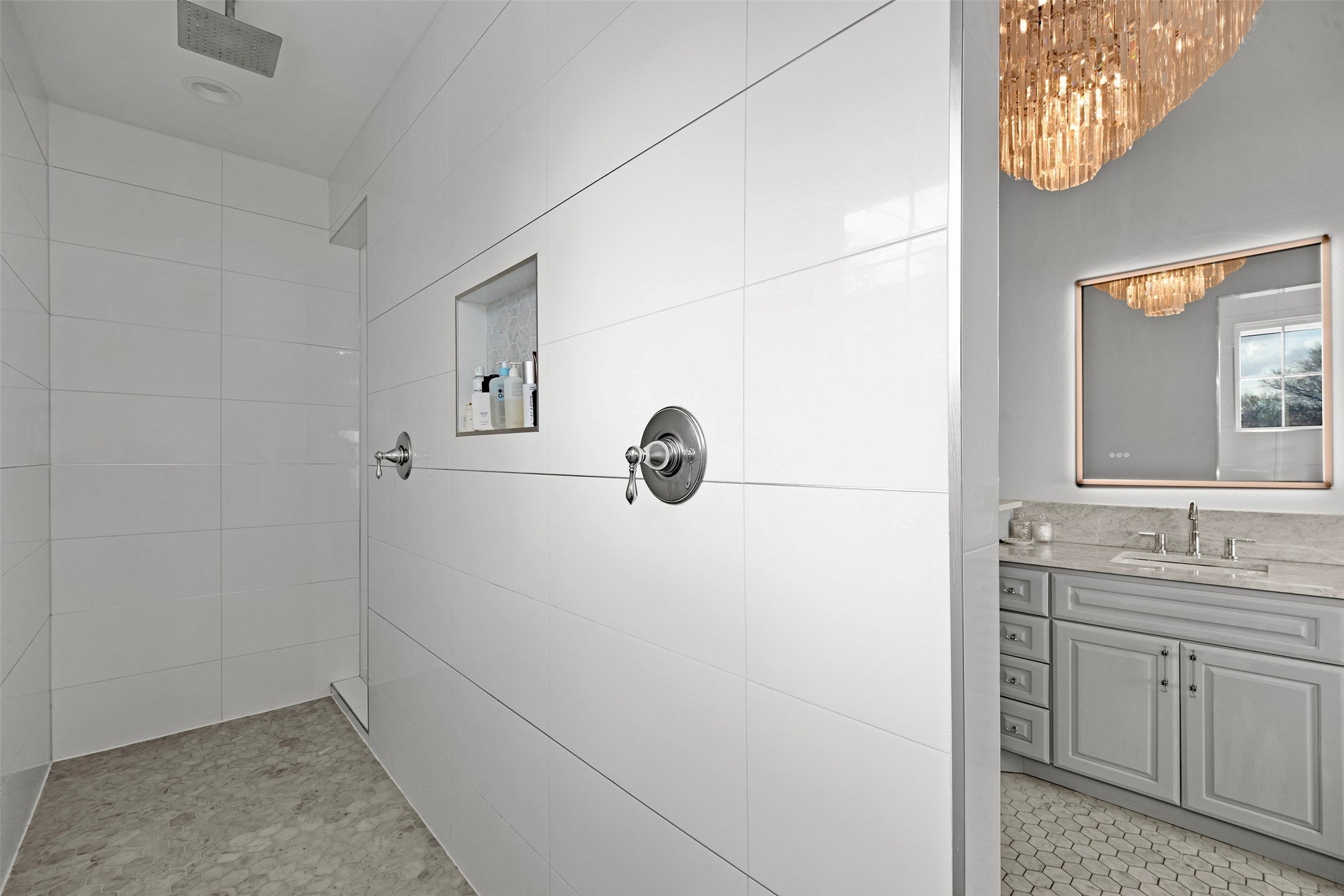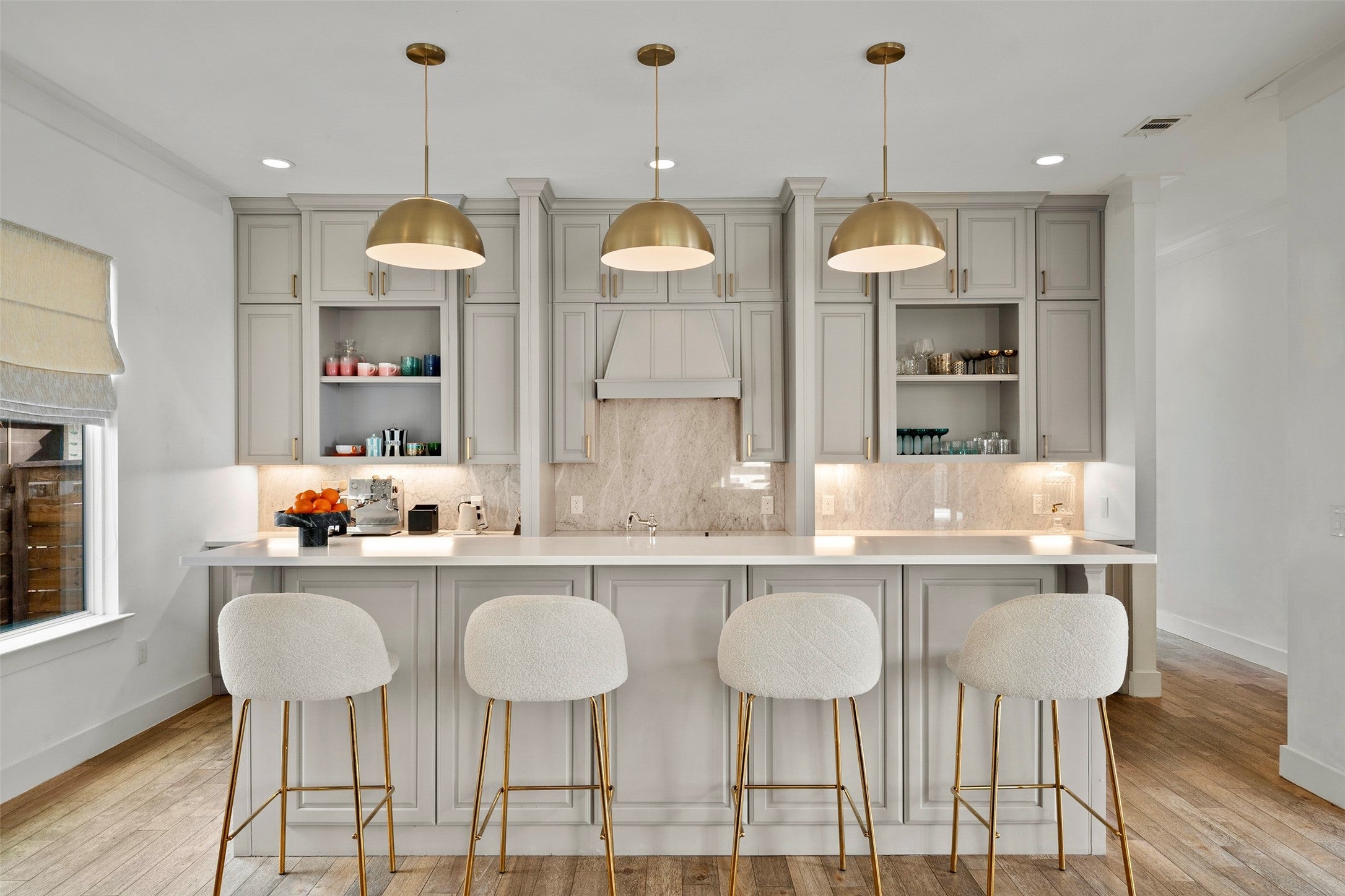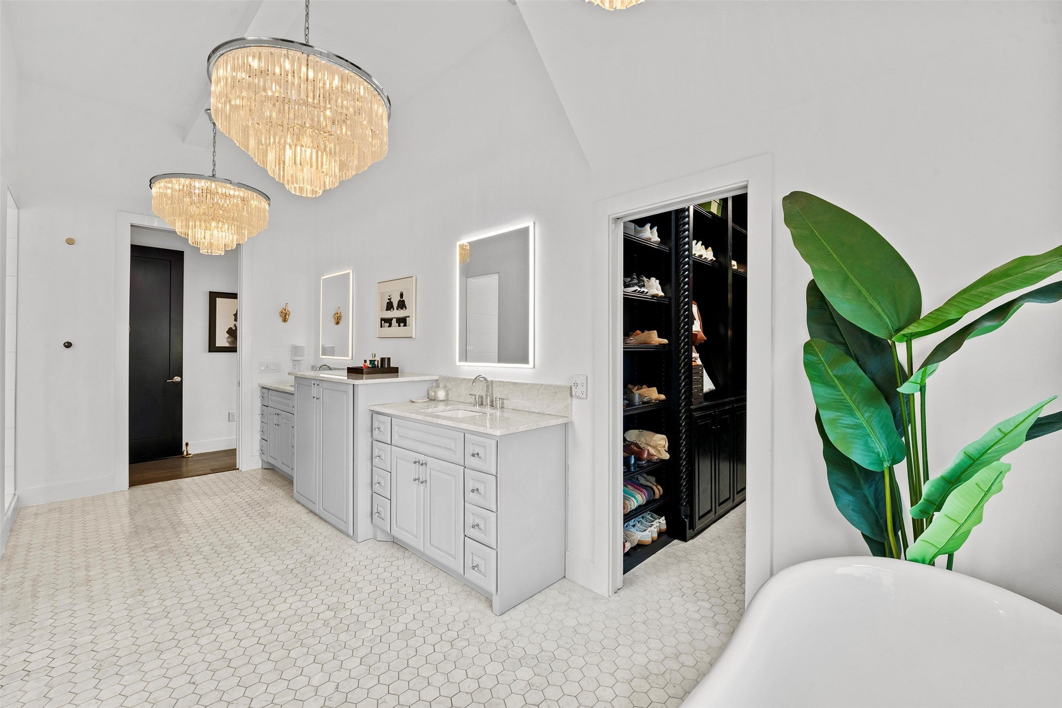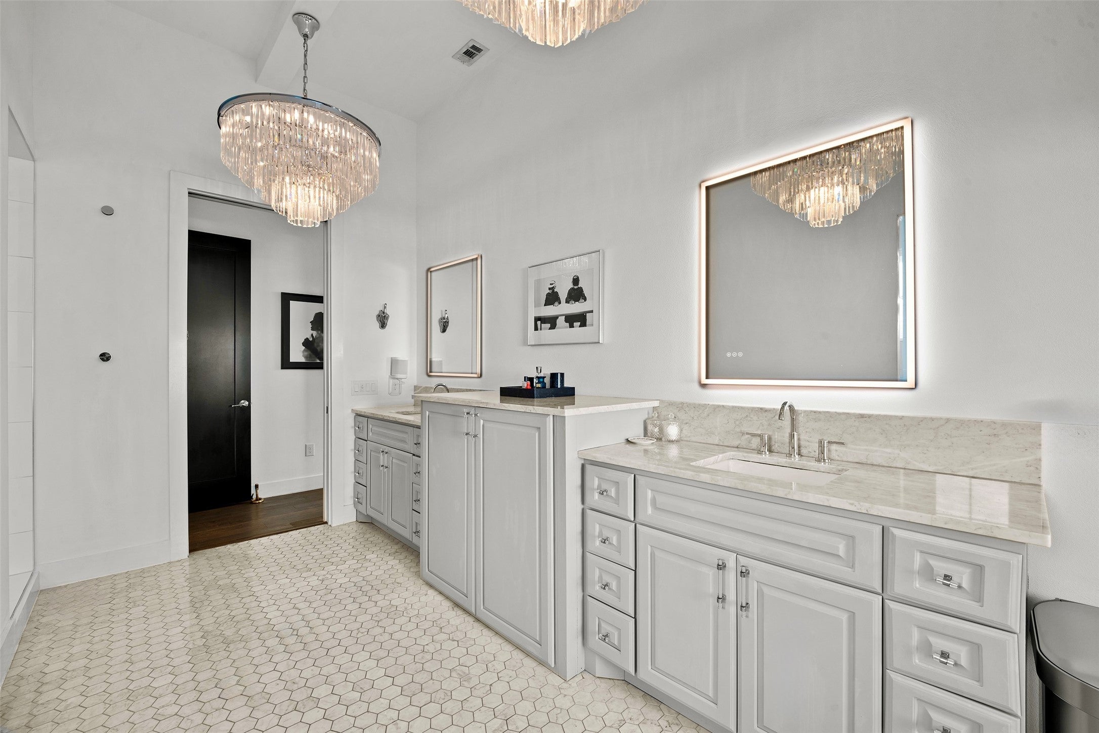3112 Garwood immediately impresses with clean architectural lines, subtle curved walls, and a striking dark standing seam metal roof contrasted by crisp board and batten siding. A private courtyard drive offers a refined sense of arrival while enhancing privacy from the street. Inside, wide plank wood floors guide you to the central kitchen and continue into a vaulted living room filled with natural light. Exposed beams, oversized windows, and refined marble details add warmth and scale, creating an inviting space for everyday living and entertaining. The kitchen blends thoughtful design with everyday functionality. Custom cabinetry, marble backsplash, quartz countertops, and brass pendants frame an oversized island that naturally becomes the home's social hub. Sleek integrated appliances maintain clean lines while reinforcing the kitchen’s polished, high-end design. Thoughtfully chosen finishes infuse the home with personality and depth. Vibrant, color-rich spaces and a powder bath with striking wallpaper create a sense of artistry that sets this home apart from typical new construction. Upstairs, the primary suite is bright, private, and thoughtfully designed, with smart blinds that let natural light adjust throughout the day. The space flows into a dramatic bathroom with soaring ceilings, crystal chandeliers, double vanities with marble counters, a freestanding soaking tub beneath the window, and a spacious walk-in shower. A custom closet with floor-to-ceiling cabinetry, sculptural millwork, and open display shelving creates a dressing space that feels both elevated and highly functional. A covered patio with patterned tile extends to a landscaped backyard with lush turf and a pool designed for year-round enjoyment with heating and cooling from 40 to 104 degrees. Set among East Austin favorites like Machine Works, De Nada Tacos, East End Ballroom, and Kinda Tropical, this address places you at the heart of the East Side, minutes away from downtown Austin.