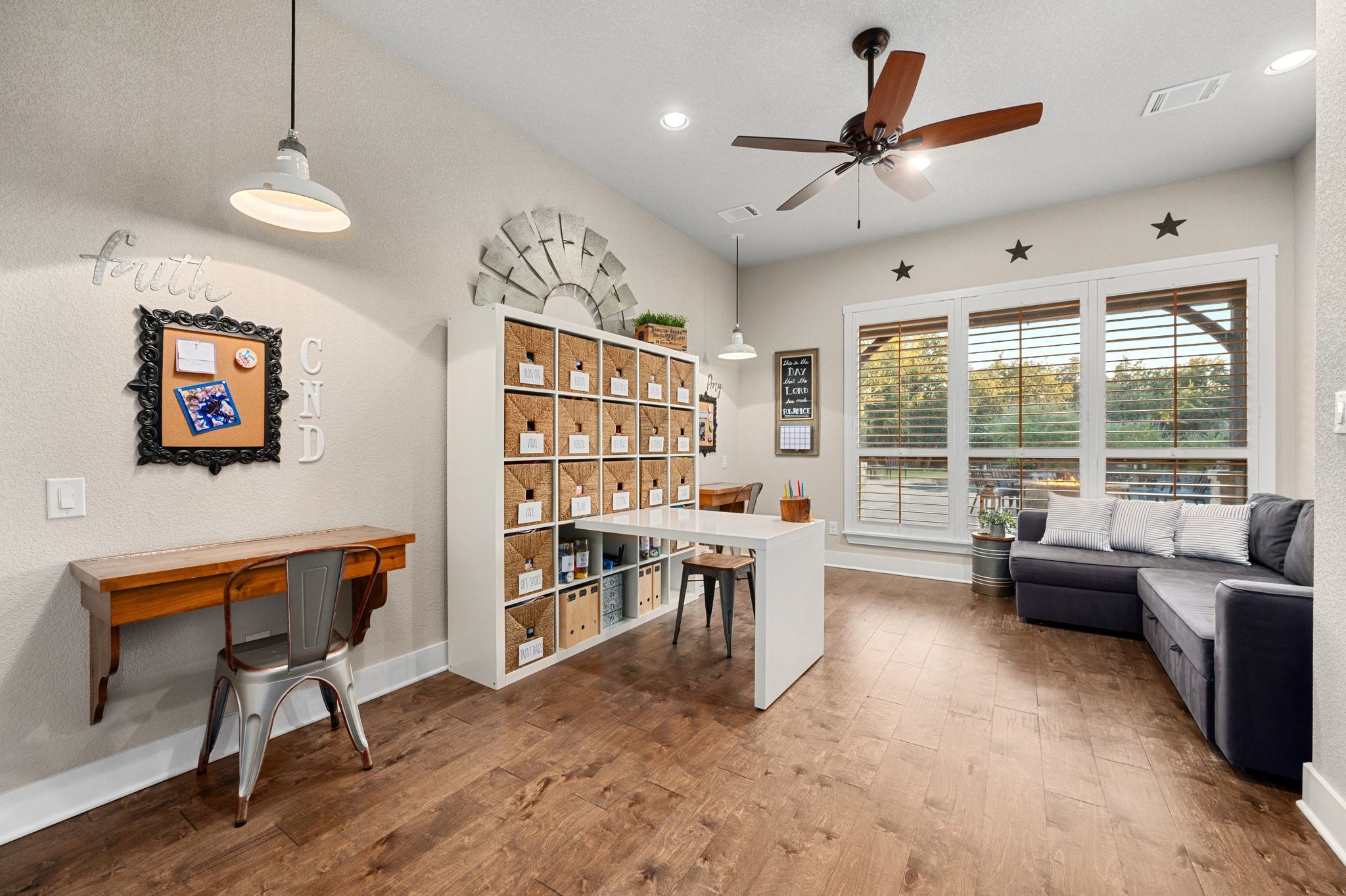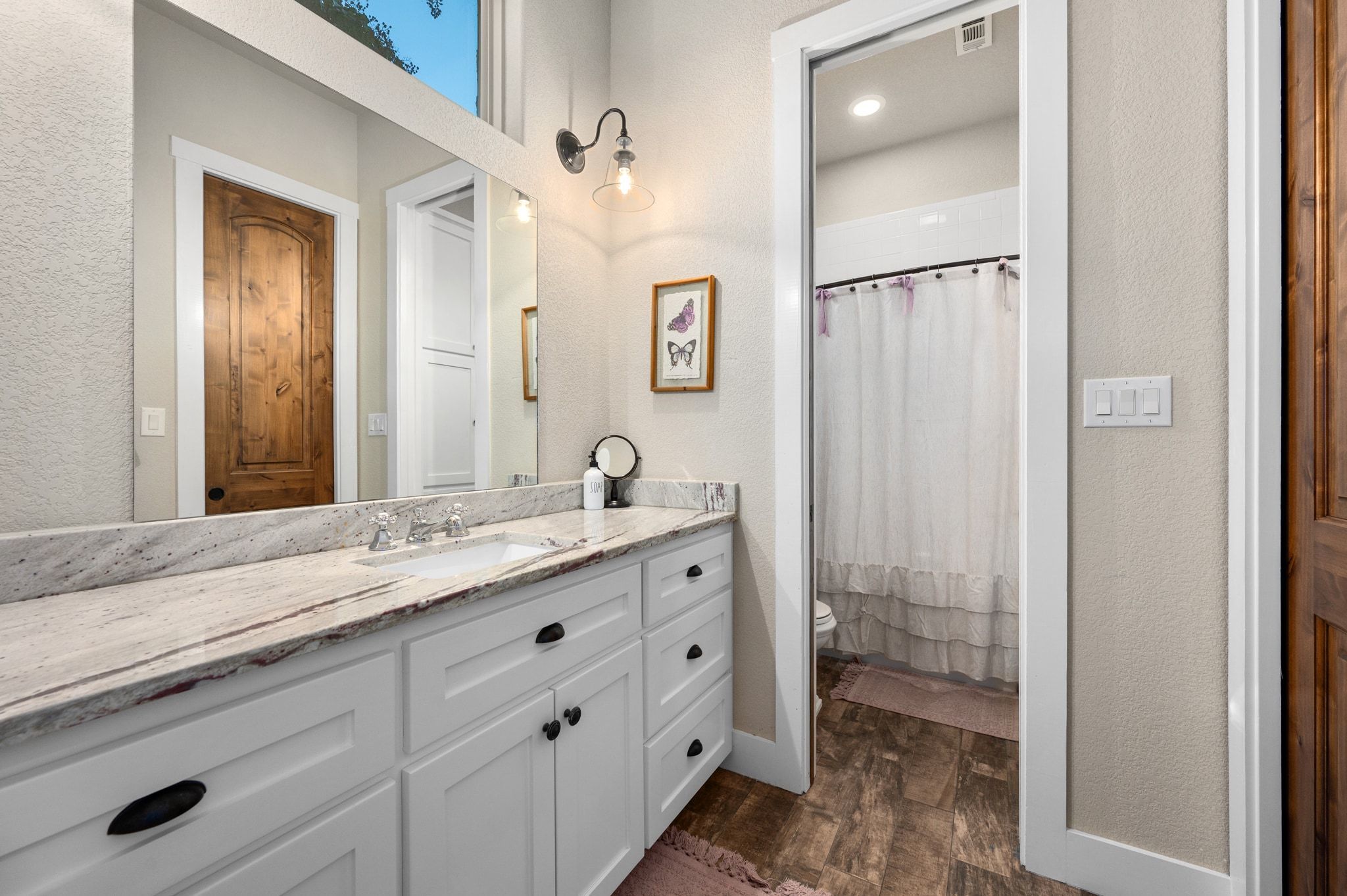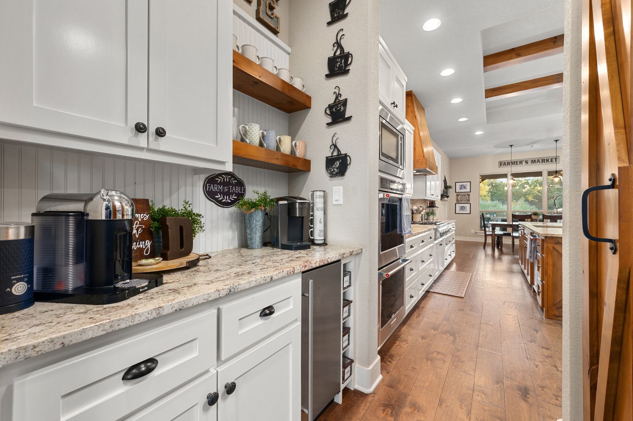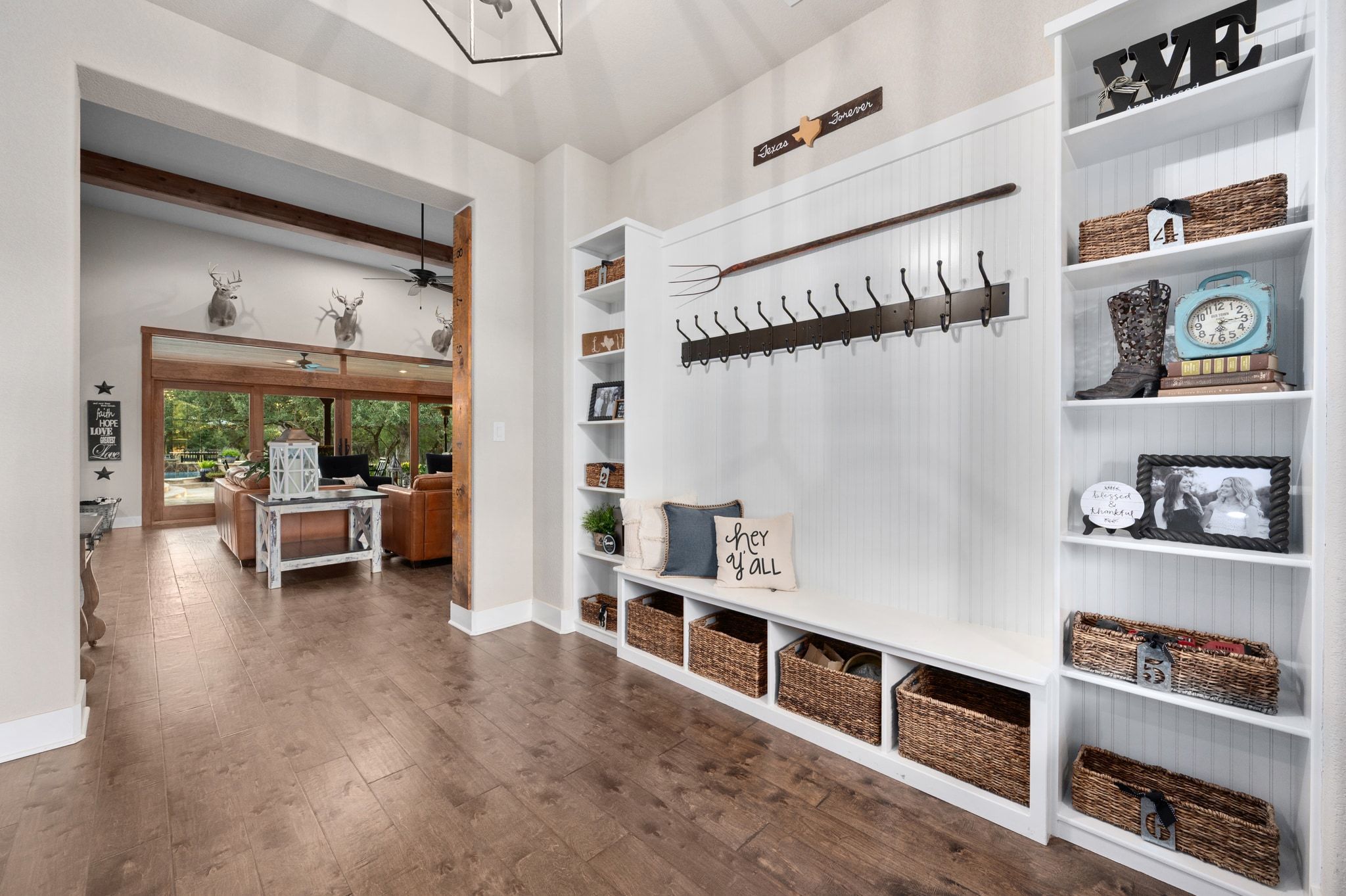 Welcome to this lovely home in the gated community of Spears Ranch in Jarrell, TX. County living at its finest with an elegant feel nestled on 34 + acres. When you enter the home, you are welcomed by soaring w/ 10' ceilings and a custom built-in hall tree; wood beams adorn the ceilings and gorgeous wood flooring. Your living room features a floor to ceiling stone fireplace with a pecan mantle. Built-in storage and open cabinets. Large glass double doors that lead you to your backyard. You have a dedicated office space with a built-in solid desk, shelving, and filing cabinet. The TV/ Game room also serves as an optional formal dining room. This room also features a lovely reclaimed wood wall with 100-year-old barn wood! The room is wired for surround sound & has a dedicated breaker for the TV/ Audio equipment, wood flooring, & plantation shutters. Your kitchen is fit for the resident chef. You immediately notice the amazing seamless granite counters are a single piece of granite! Expansive kitchen island with another solid piece of granite. Kitchen Aid Appliances are top-of-the-line, a gourmet ice machine. Stone backsplash and accent wall tie this space together. Your kitchen features a butler's pantry with a pocket door. Extra large walk-in pantry and dining area. Your master is spacious and serene. It features a custom-built solid wood barn door. Floor-to-ceiling stone fireplace with a pecan mantle. Your ensuite is luxurious. It features wood-like tile, a custom-built solid wood barn door, granite countertops, a freestanding stone tub, a double walk-in shower with two heads, and a third rain shower head. Built-in shelving and storage in the WIC. The highlight of this space is a large dresser on casters that covers a trap door that leads to a 10x10x10 storm shelter with air ducts and electricity. Outside you have your very own tropical oasis complete with a large covered patio, pebble sheen pool, oversized built-in hot tub, outdoor restroom, and storage.