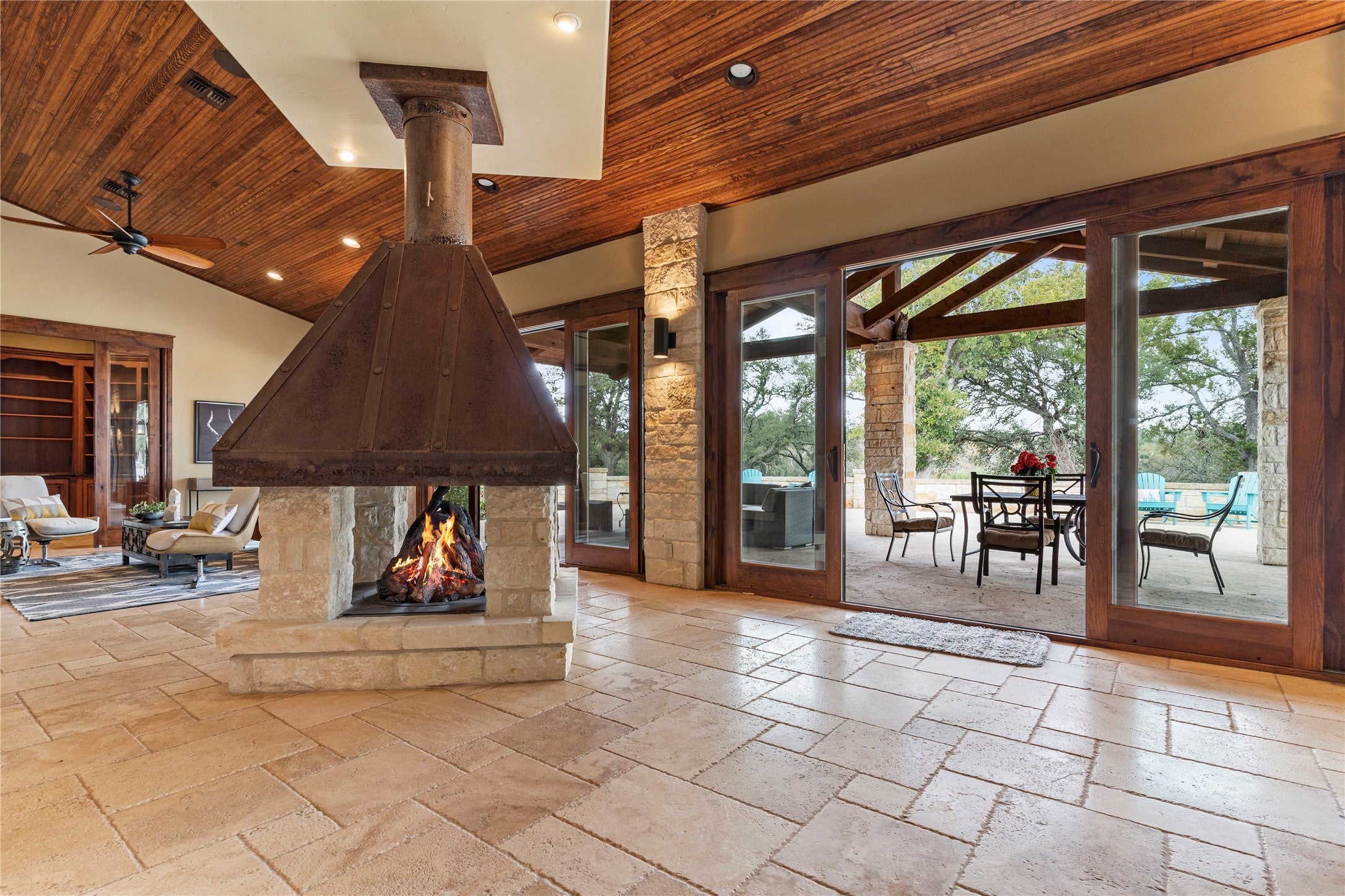 - Den, Double Sided, Family Room, Great Room, Living Room, Propane, Stone, Wood Burning, Bedroom, Dining Room