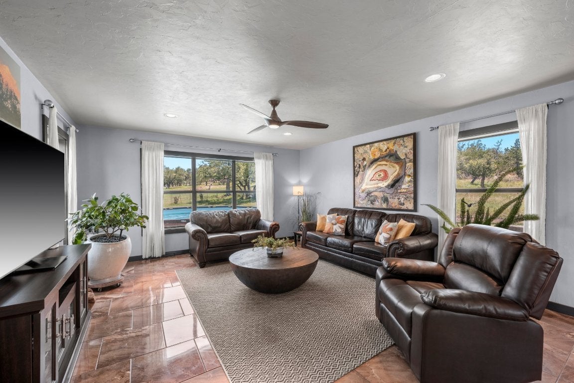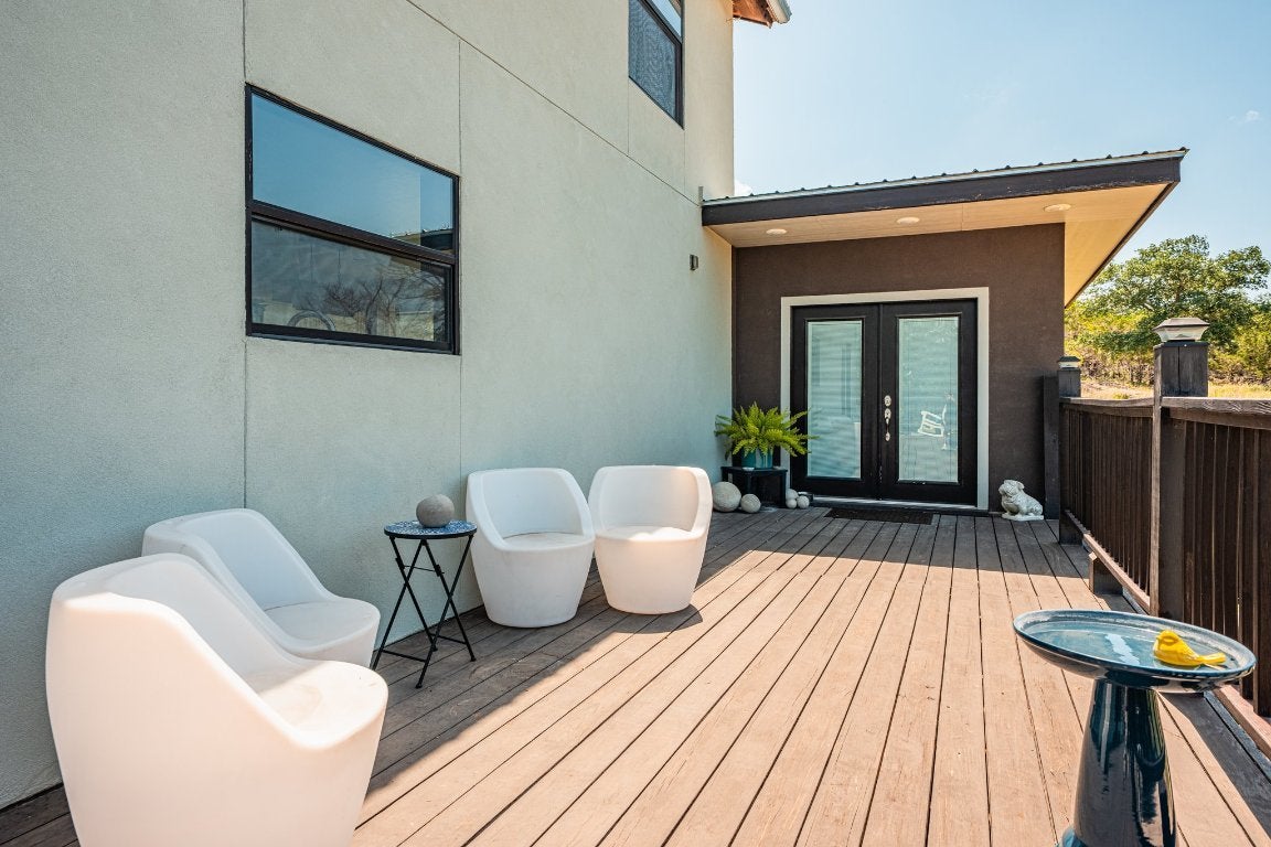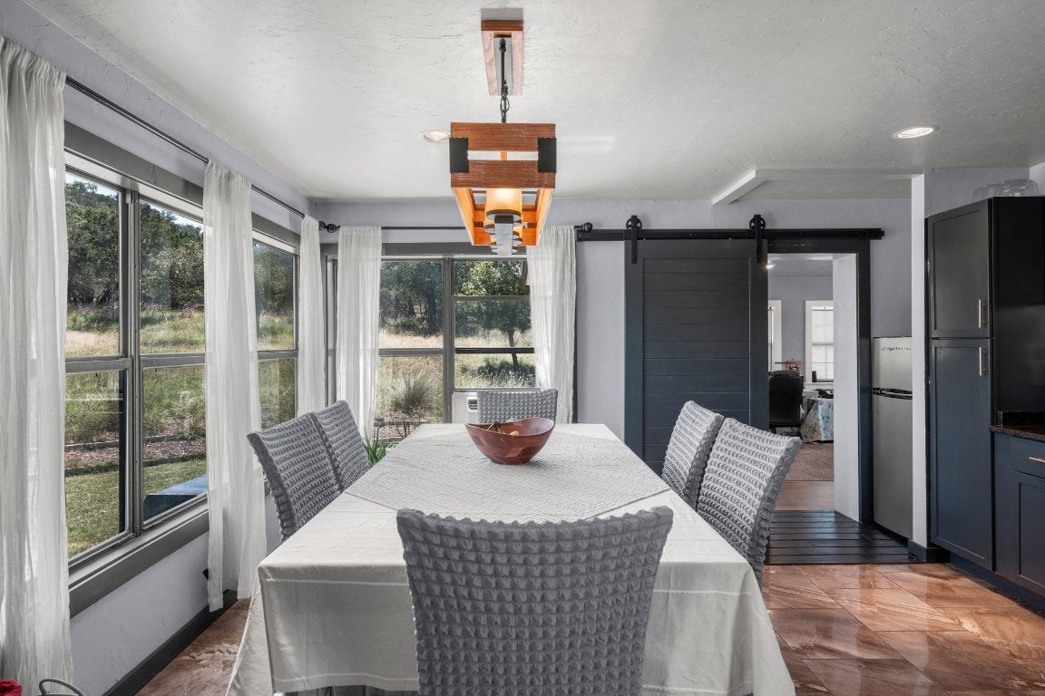 Experience refined Hill Country living in this beautifully reimagined residence blending German Contemporary architecture with timeless elegance. Completely renovated in 2015, the home showcases polished Spanish specialty tile flooring throughout, complemented by a hand-crafted wood staircase as a striking focal point. The light-filled kitchen & dining space feature sleek stainless appliances & clean modern lines designed for both function & beauty. Upstairs, the luxurious primary suite offers a bespoke built-in wall closet, accompanied by two additional guest rooms. A fourth bedroom on the main level serves perfectly as a private office paired with a thoughtfully integrated laundry area. The crowning jewel is the custom-designed third-floor Eagle’s Nest—an intimate retreat ideal for relaxing, reading, or enjoying panoramic Hill Country views & wildlife. Wrapped in an upgraded 7-layer stucco exterior, this home offers superior insulation, durability, & low-maintenance living. Expansive wrap-around decking, a private above-ground pool, & a secluded setting tucked deep within the property complete this exceptional offering—just 10 minutes to Fredericksburg & Enchanted Rock.