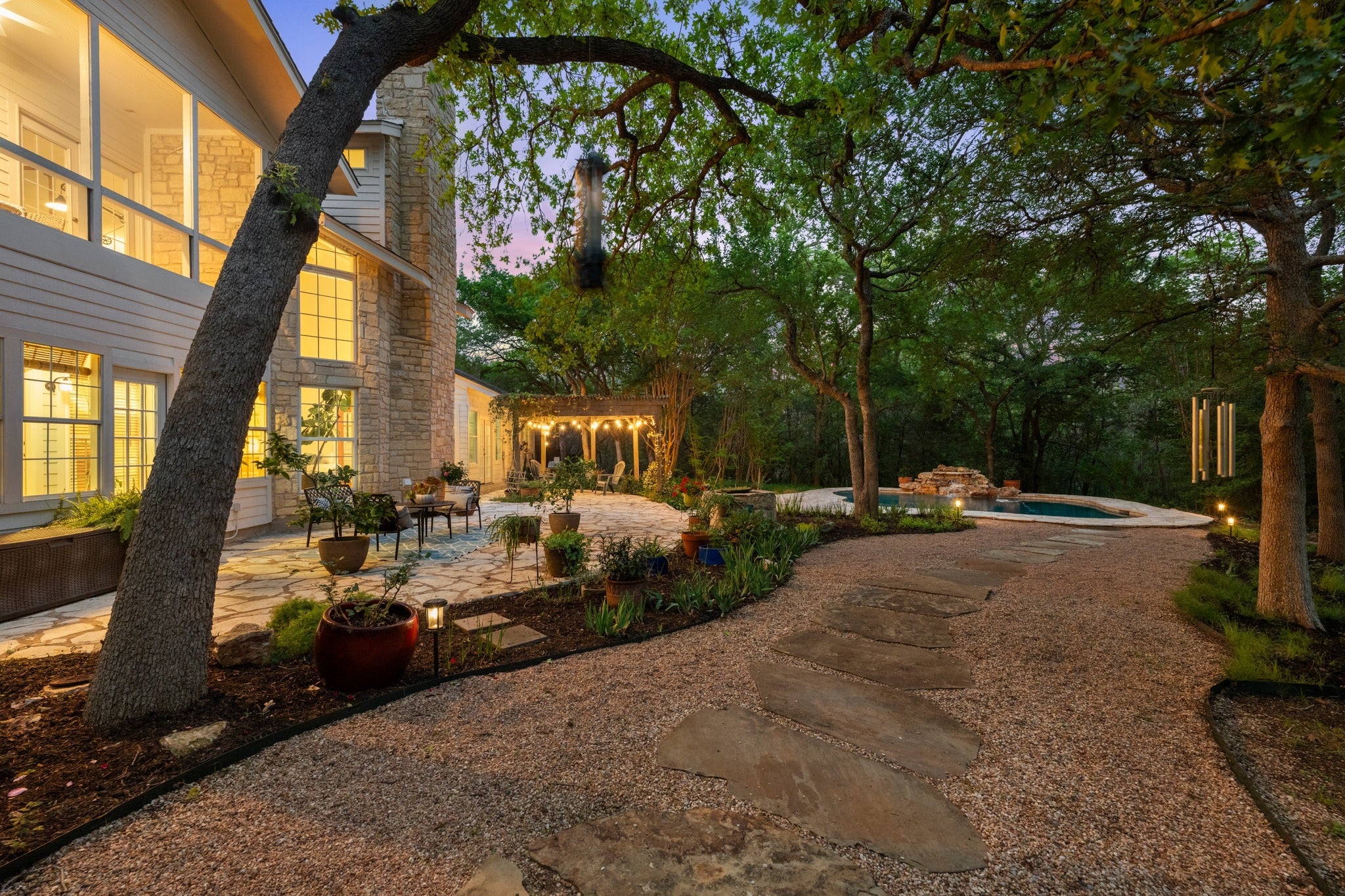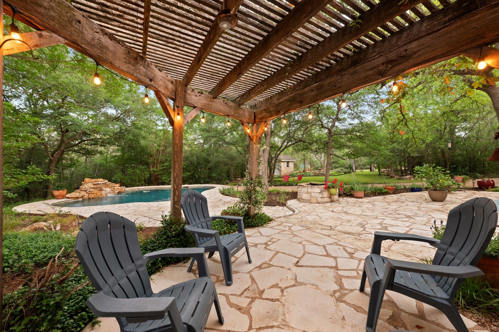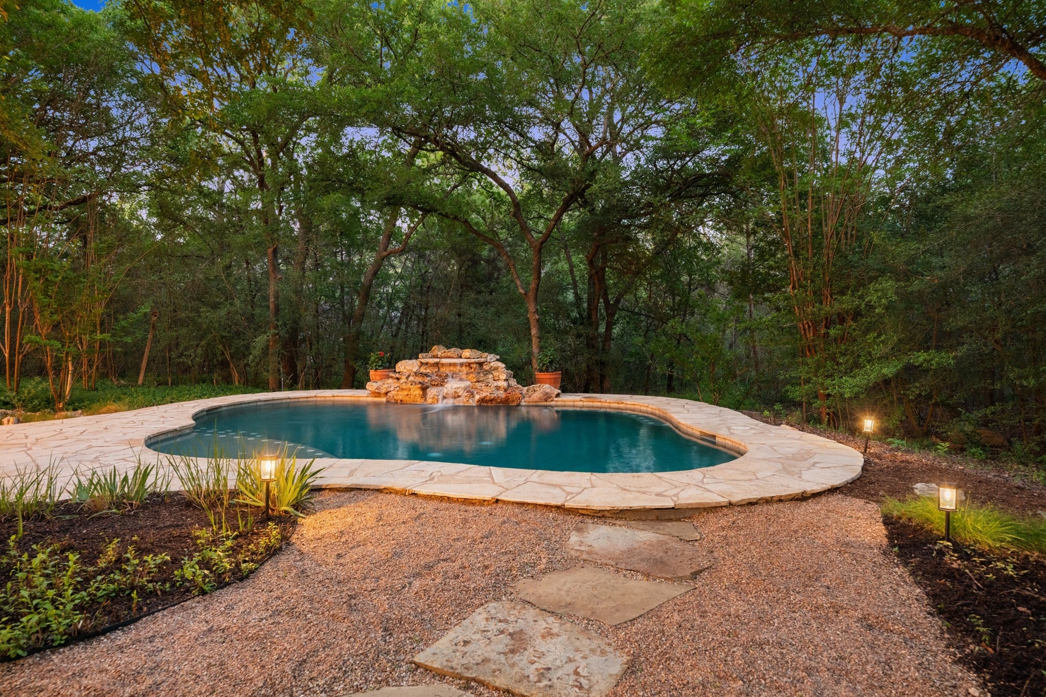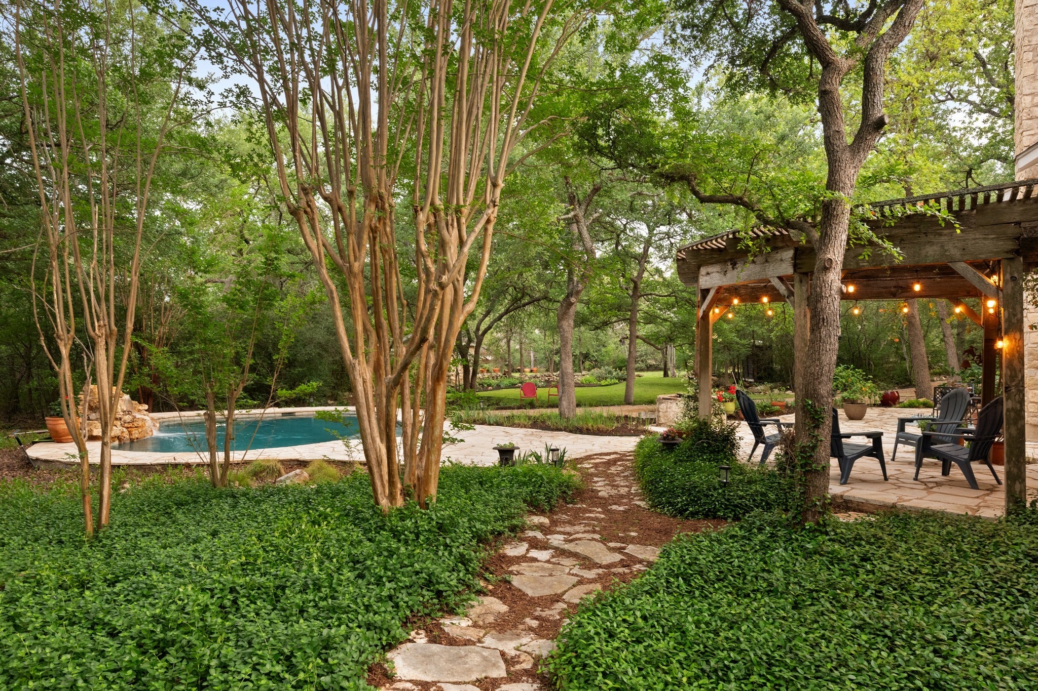 This forever Hill Country home lives like a private, year-round resort. Tucked beneath mature oaks on a serene 2-acre cul-de-sac lot, the beautiful grounds offer both privacy and play—featuring a sparkling pool with a cascading stone waterfall, bocce ball court, treehouse, fire pit, greenhouse, outdoor shower, and a charming stone patio with pergola. The primary suite is a true retreat, complete with a screened-in sun porch overlooking the treetops and the soothing sound of the waterfall. The recently updated chef’s kitchen showcases a custom-built island, six-burner gas cooktop, Sub-Zero refrigerator, farmhouse sink, maple cabinetry, and quartz countertops. The first floor offers two bedrooms plus a dedicated office that can serve as a fourth bedroom by removing the built-ins. Two sunrooms span the back of the home, framing the picturesque yard and offering flexible space for a reading room, art studio, dining area, or additional office. In 2020, a stunning 1,050-square-foot workshop was added—featuring a dramatic roll-up glass door that invites the outdoors in, a built-in desk, 12-feet of custom cabinetry, & a covered patio. Ideal for creative pursuits, a home office, guest house conversion, or game room. The current owner, a talented wood artist, hand-crafted both the custom walk-in closet and the kitchen island, adding a layer of artistry you won’t find elsewhere. Located in one of the area’s lowest tax rate pockets with no city or MUD taxes, low utility costs, and a modest HOA of just $100/year. Zoned to award-winning Dripping Springs Independent School District schools, and near Cypress Springs Elementary School and Sycamore Springs Middle School. Walk to Crowded Barrel Whiskey Co.’s inviting Alchemy Lounge to meet neighbors for dinner and drinks, or explore nearby Hill Country favorites like The Salt Lick BBQ, Trattoria Lisina local wineries, scenic creeks, and the Violet Crown Trail—all while being just minutes from downtown Austin.