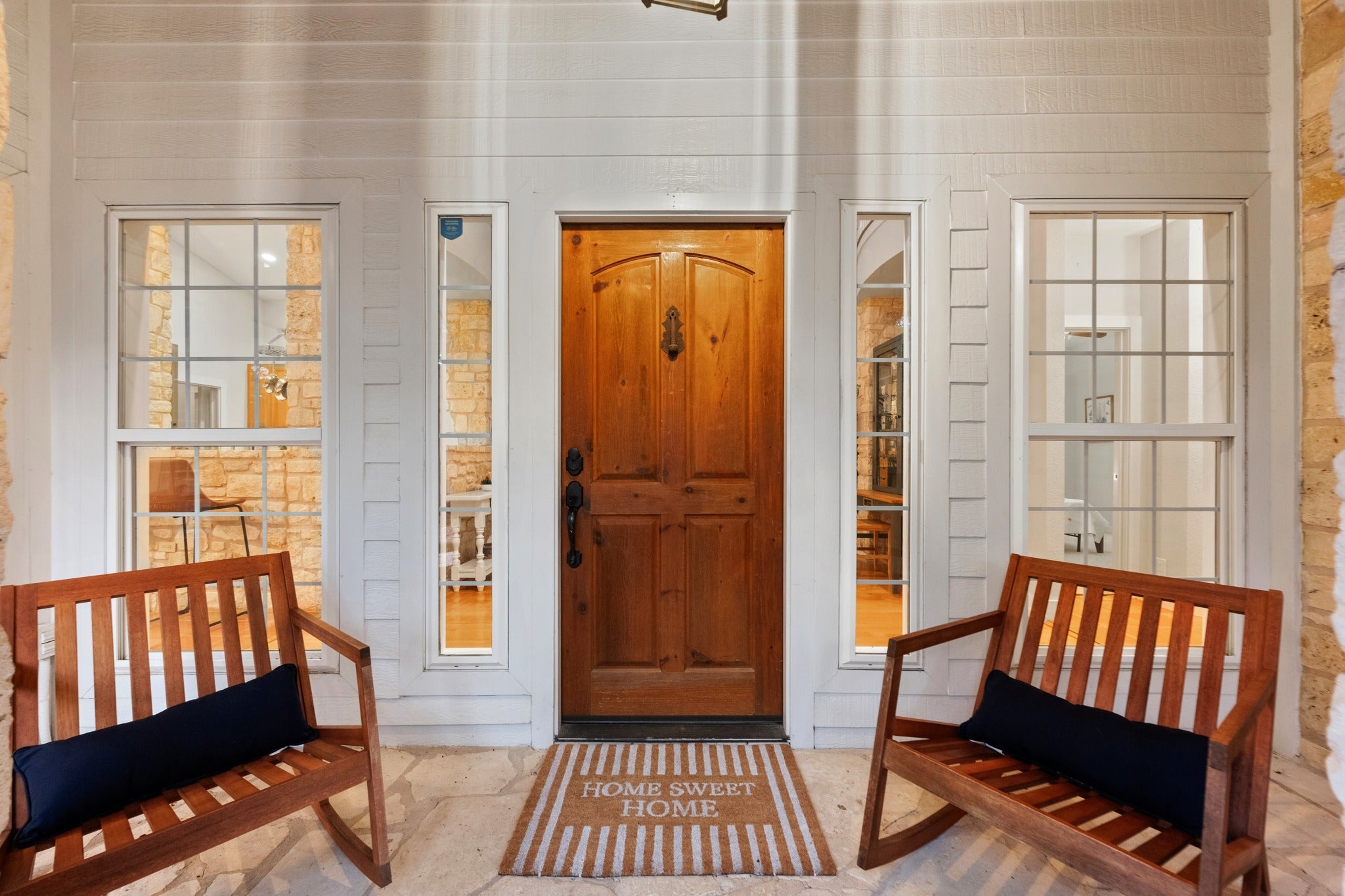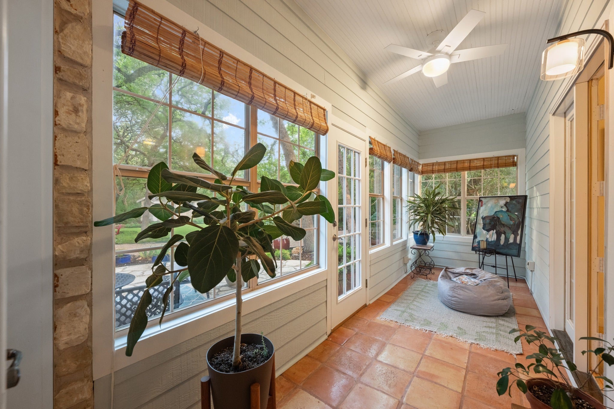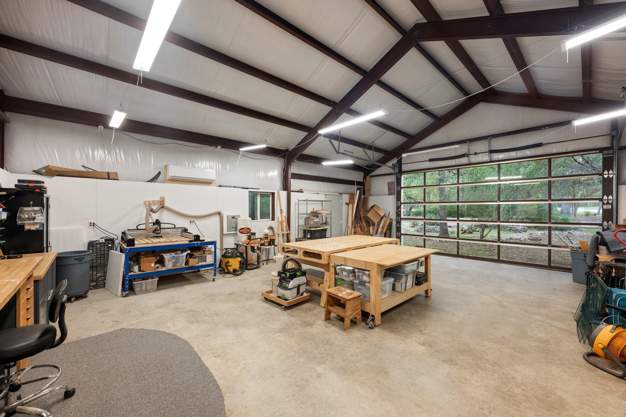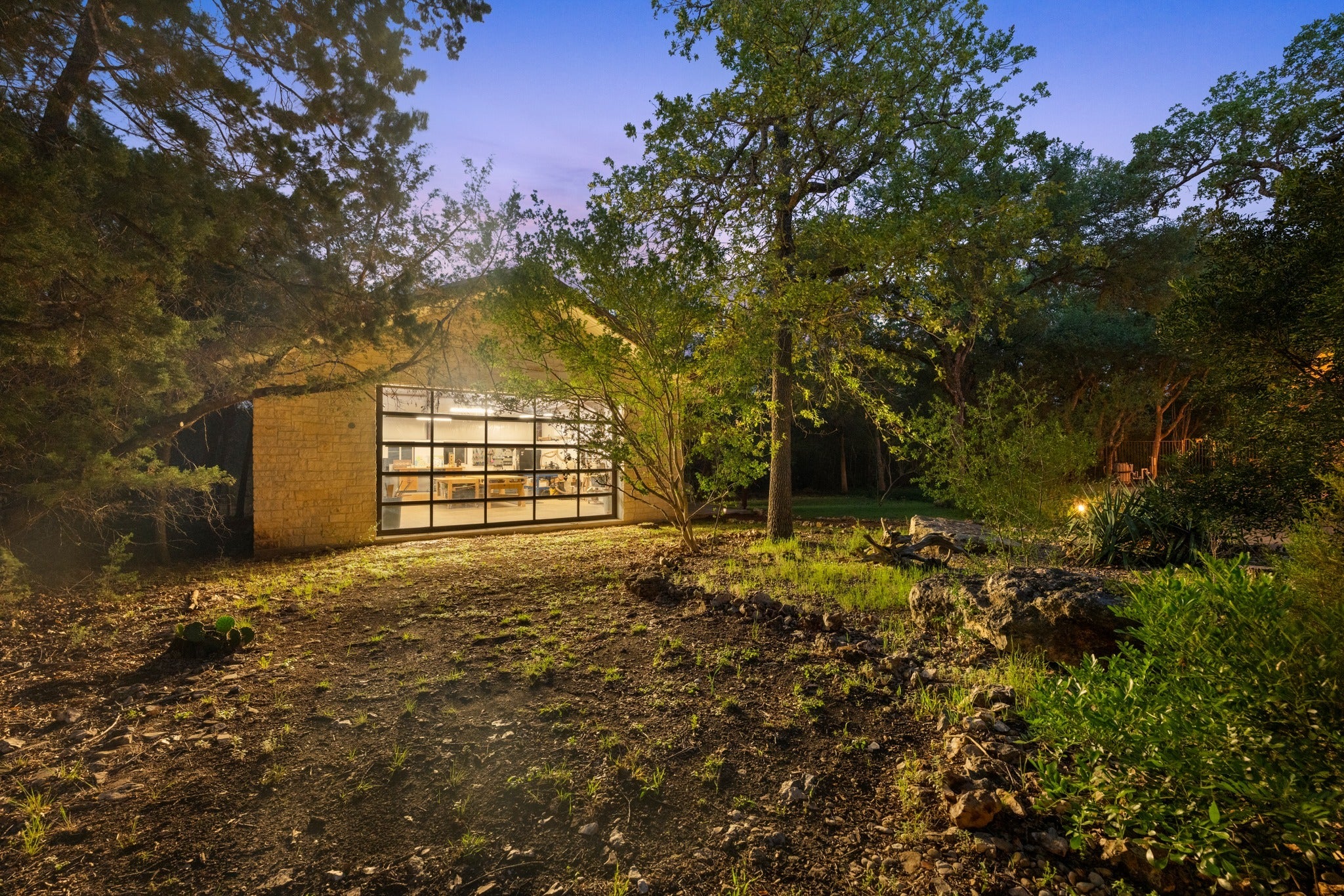 This forever Hill Country home lives like a private, year-round resort. Tucked beneath mature oaks on a serene 2-acre cul-de-sac lot, the beautiful grounds offer both privacy and play—featuring a sparkling pool with a cascading stone waterfall, bocce ball court, treehouse, fire pit, greenhouse, outdoor shower, and a charming stone patio with pergola. The primary suite is a true retreat, complete with a screened-in sun porch overlooking the treetops and the soothing sound of the waterfall. The recently updated chef’s kitchen showcases a custom-built island, six-burner gas cooktop, Sub-Zero refrigerator, farmhouse sink, maple cabinetry, and quartz countertops. The first floor offers two bedrooms plus a dedicated office that can serve as a fourth bedroom by removing the built-ins. Two sunrooms span the back of the home, framing the picturesque yard and offering flexible space for a reading room, art studio, dining area, or additional office. In 2020, a stunning 1,050-square-foot workshop was added—featuring a dramatic roll-up glass door that invites the outdoors in, a built-in desk, 12-feet of custom cabinetry, & a covered patio. Ideal for creative pursuits, a home office, guest house conversion, or game room. The current owner, a talented wood artist, hand-crafted both the custom walk-in closet and the kitchen island, adding a layer of artistry you won’t find elsewhere. Located in one of the area’s lowest tax rate pockets with no city or MUD taxes, low utility costs, and a modest HOA of just $100/year. Zoned to award-winning Dripping Springs Independent School District schools, and near Cypress Springs Elementary School and Sycamore Springs Middle School. Walk to Crowded Barrel Whiskey Co.’s inviting Alchemy Lounge to meet neighbors for dinner and drinks, or explore nearby Hill Country favorites like The Salt Lick BBQ, Trattoria Lisina local wineries, scenic creeks, and the Violet Crown Trail—all while being just minutes from downtown Austin.