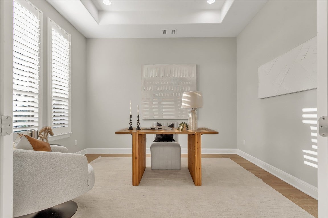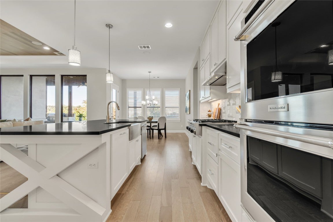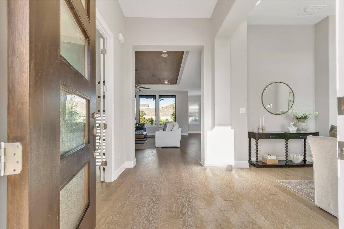 Situated within the gated Cap Rock Estates section of Crystal Falls, this modern residence combines thoughtful design, refined finishes, and exceptional functionality. Set on a desirable corner lot, the home offers four bedrooms, three and a half bathrooms, a dedicated office, and a versatile flex room well suited for a gym, playroom, or media retreat. Roof shingle replacement JANUARY 2026! The main living area is defined by a wood-clad tray ceiling, hardwood flooring, and expansive windows that frame views of the home’s private garden and rose bushes. In the evenings, the stone-surround gas fireplace becomes a warm architectural focal point. At the center of the home, the kitchen features Cosentino countertops, a large island, two wall ovens, a six-burner cooktop, and a breakfast bar that opens to the covered patio. The layout supports both everyday living and effortless entertaining. The owners’ suite offers a quiet retreat with plantation shutters, an ample walk-in closet, and a spa-inspired bath with separate vanities and an oversized shower. The well-appointed laundry room provides extensive custom storage, dual workstations, a utility sink, and space for a second refrigerator. Outdoor amenities include a built-in gas grill with rotisserie and a three-car garage. Recent upgrades add meaningful value, including a new Tesla charger, electrical installation for a large Jacuzzi, in-ceiling speakers in the living room, a Toto toilet and Washlet, and a recent A/C system with a transferable warranty. The neighborhood is known for its peaceful atmosphere and welcoming environment. Residents enjoy access to Crystal Falls’ extensive community offerings: multiple pools, parks, playgrounds, tennis and pickleball courts, walking trails, a golf course, and more.