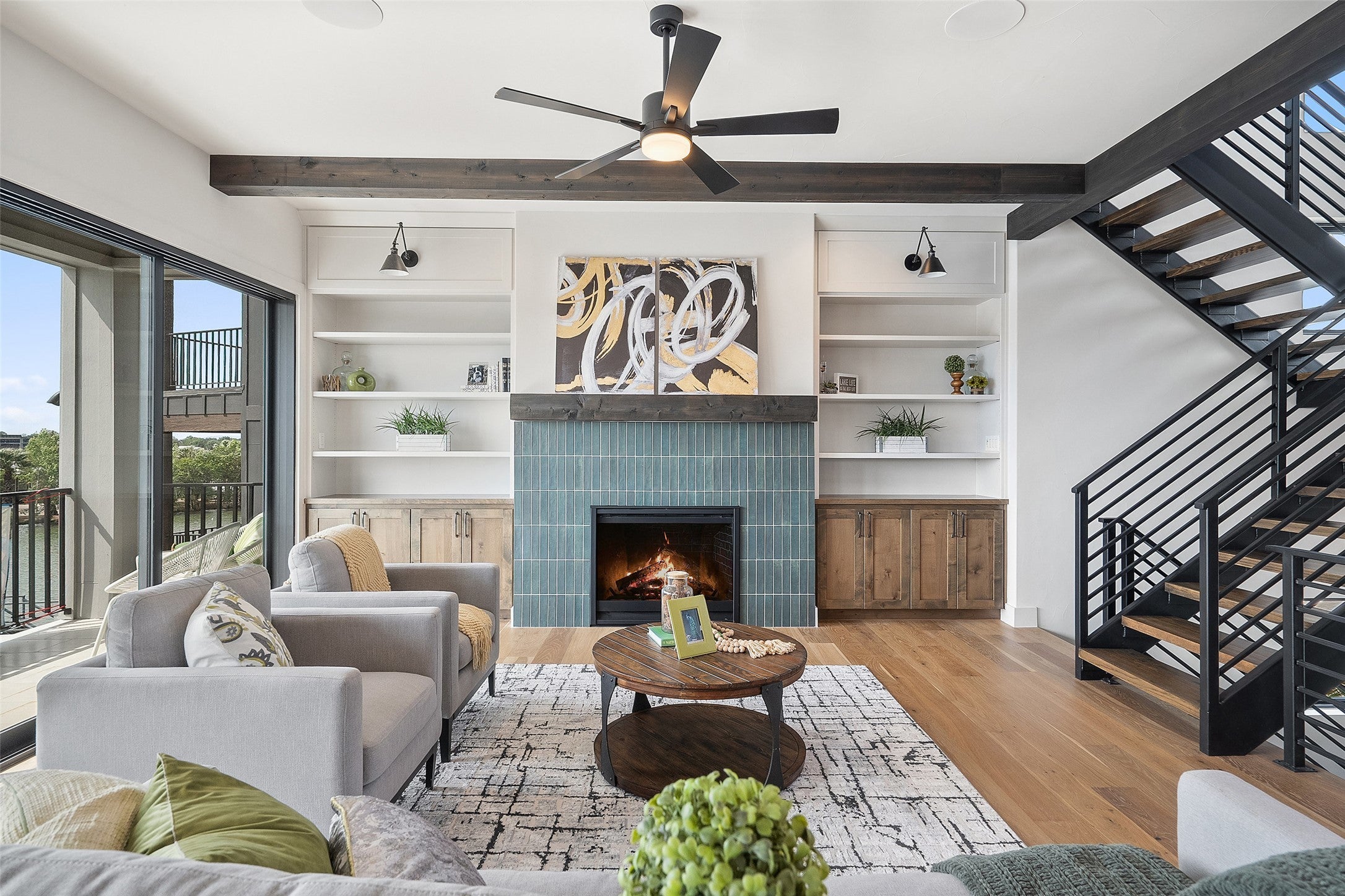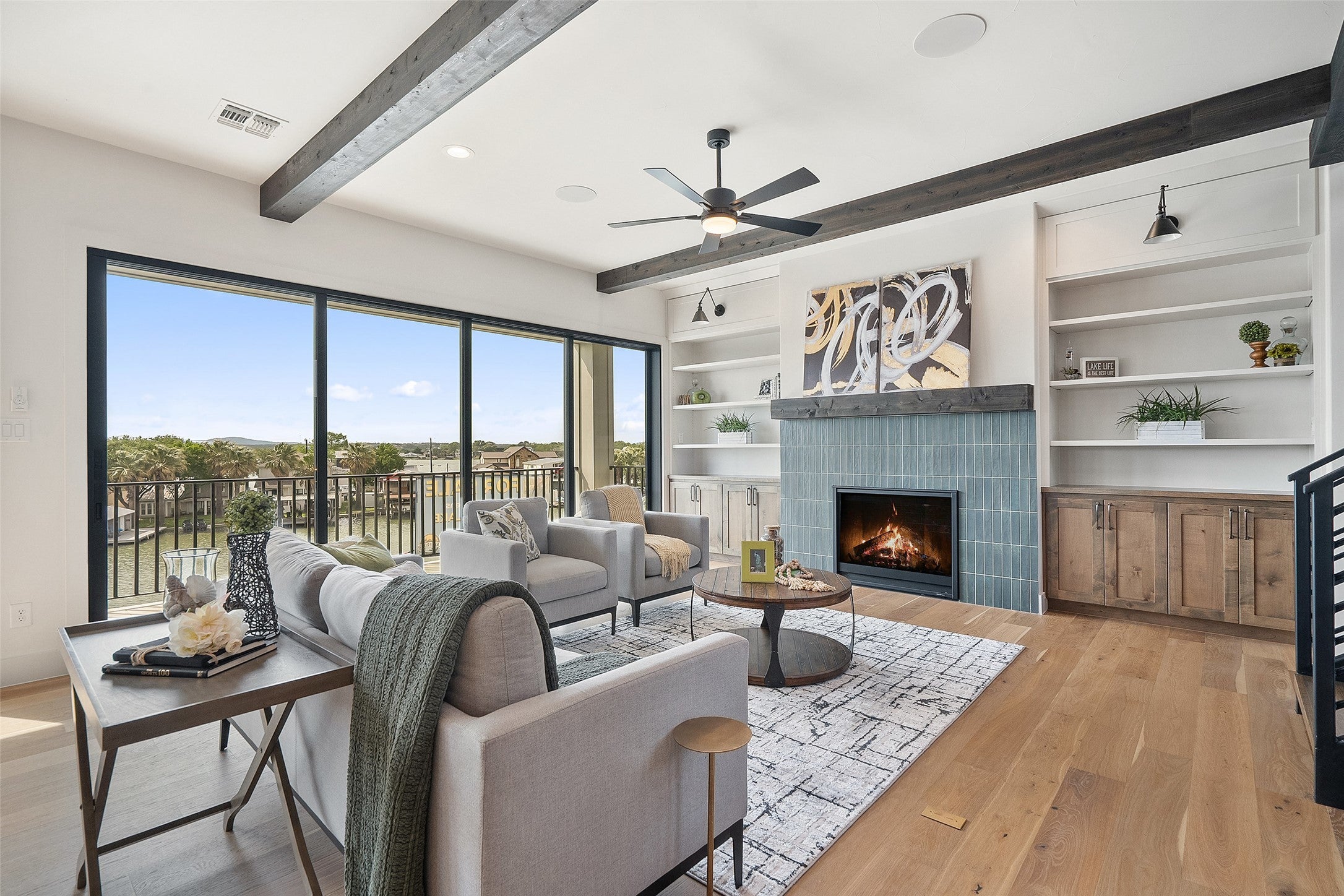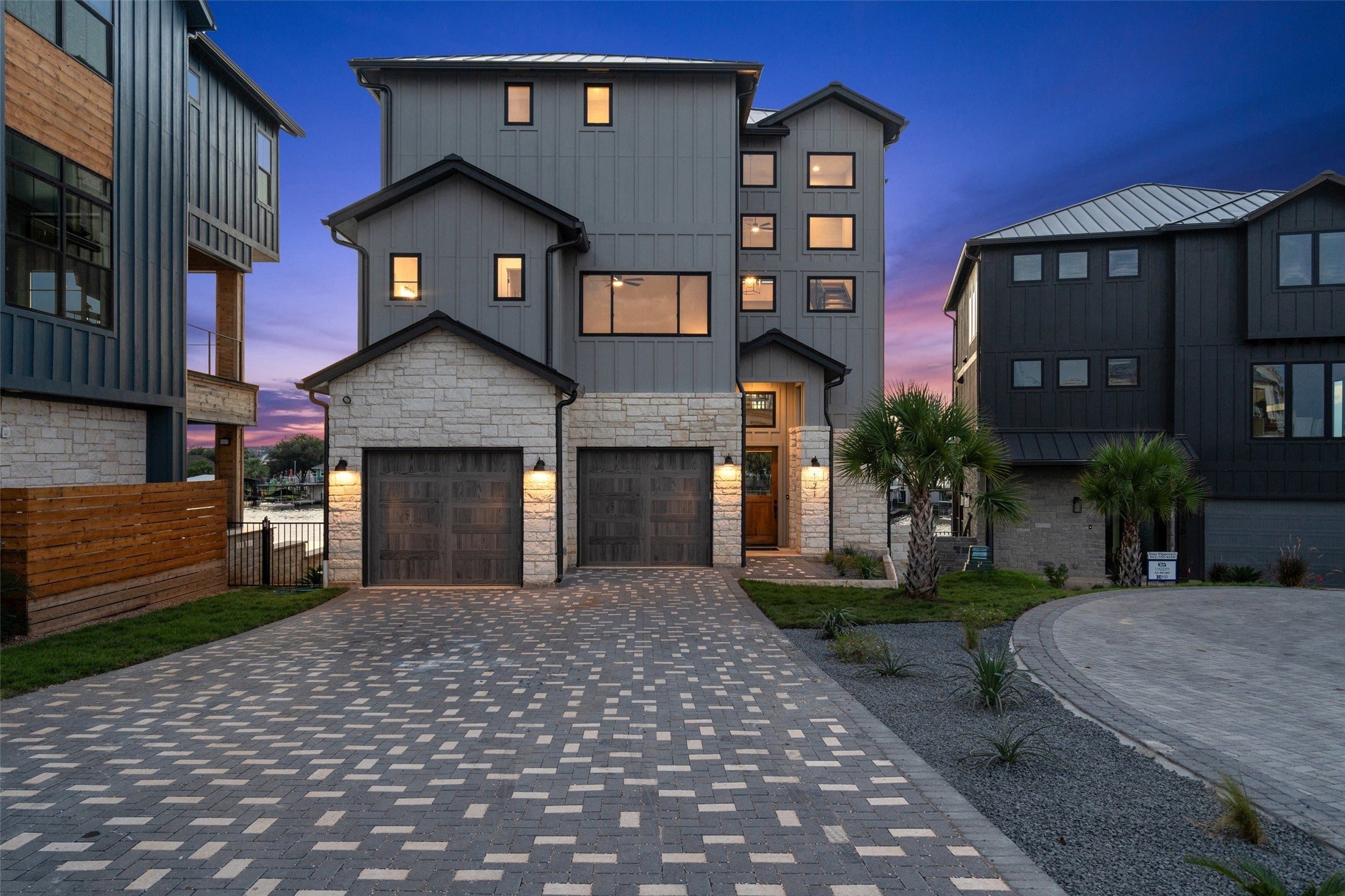 New construction on Lake LBJ by Keith Wing Custom Builders. This waterfront home pairs modern lake living with high-quality construction and a layout built for entertaining. The outdoor setup centers around the water. A spacious lakeside deck provides wide views of Lake LBJ and easy access down to the private boathouse with electric boat lift and dual jet ski slips. Just steps from the water, a heated pool and spa create a resort-style setting along the shoreline. Inside, the main living area is designed to keep the lake views front and center. A gas fireplace with custom built-ins, integrated sound system, and large windows overlooking the water create a comfortable space for gathering. The kitchen features Michael Edwards Signature custom cabinetry, marble countertops, JennAir appliances, and a large center island, combining high-end finishes with everyday function. Additional spaces add flexibility for guests and entertaining, including a bunk room with built-in beds and lake views and a secondary family room with balcony access that extends the living space outdoors. The top-level owner’s suite, accessible by residential elevator, offers a private retreat with French doors opening to elevated views across Lake LBJ. Located minutes from a public boat ramp and lakeside park, this property delivers new construction, premium finishes, and a fully equipped Lake LBJ waterfront lifestyle.