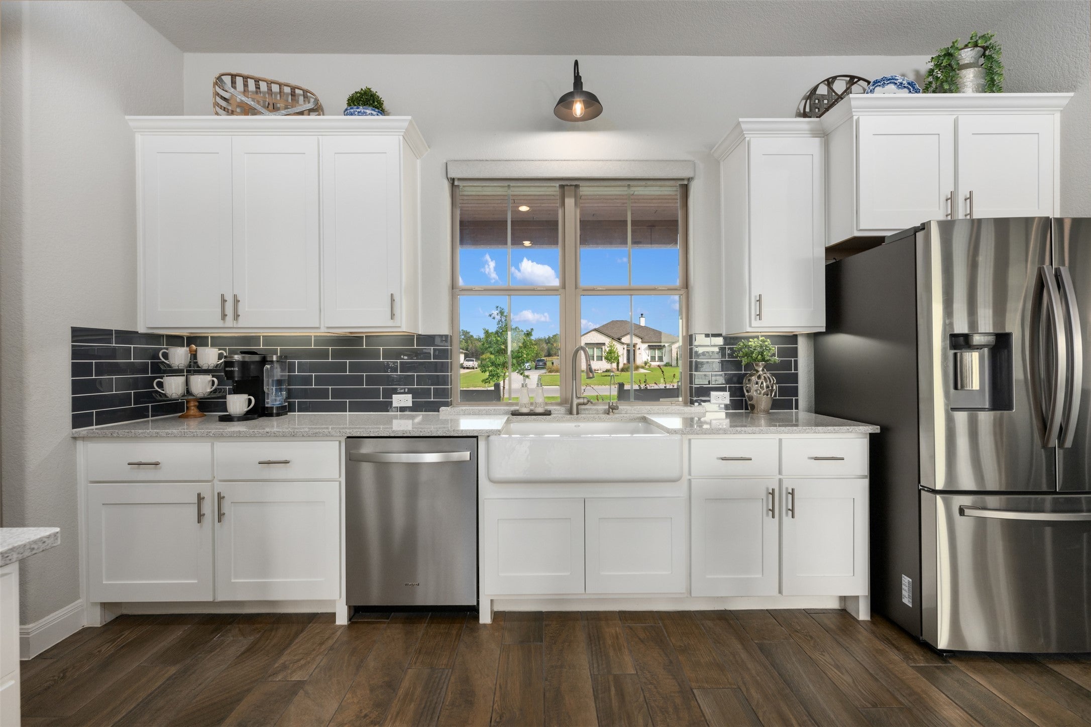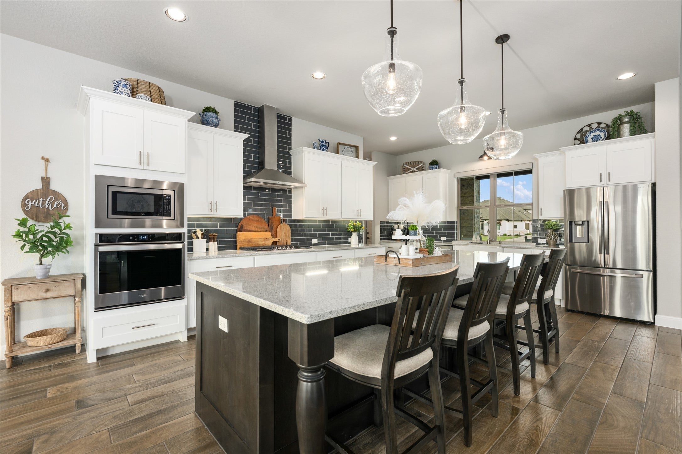 NOTHING LIKE IT!! BEAUTIFUL HOME WITH ATTACHED APARTMENT STYLE (separate living for inlaw suite) LIVING AND DETACHED CASITA! Experience elevated living at its finest in Liberty Hill, TX! TRUE MULT-GEN! ATTACHED AND Detached casita with it's own entrance/patio and full kitchen! This exceptional estate on a corner lot and an acre features a stunning main residence, private multi-gen suite, AND a detached full casita complete with full bath perfect as a man cave, hobby room, guest quarters, or office! Behind the handsome double door entry, step inside to rich wood-look tile floors that lead you through a sophisticated open-concept layout marked by exposed beam ceilings, a floor to-ceiling stone fireplace with hearth, and sun-drenched living spaces that blend comfort and style. The heart of the home is a chef’s dream: an oversized Silestone island, a charming farmhouse sink with front lawn views, a gas cooktop, and ample cabinetry and large pantry ideal for hosting or daily life. Dining room to seat all with walls of windows! Retreat to a spa inspired primary bath with dual vanities makeup vanity, a large walk-in shower with designer tile, niches, bench, two primary walk in closets and designer finishes. Secondary bedroom offers an ensuite bath, while the others have Jack and Jill like bathrooms with ensuite vanities. The home offers multiple indoor-outdoor living zones, including several covered patios made for relaxing evenings or weekend entertaining. A rare 4-car garage, thoughtful landscaping, landscape lighting and expansive driveway add to the property’s appeal blending beauty and functionality for the way we live. Whether you need room for extended family, have guests, or simply want room to breathe, 340 Bold Sundown delivers all within the sought after Liberty Hill ISD. Easy access to the newly expanded 183A Toll Road and Costco and Target that are underway will be a short commute! There's room for everyone here!