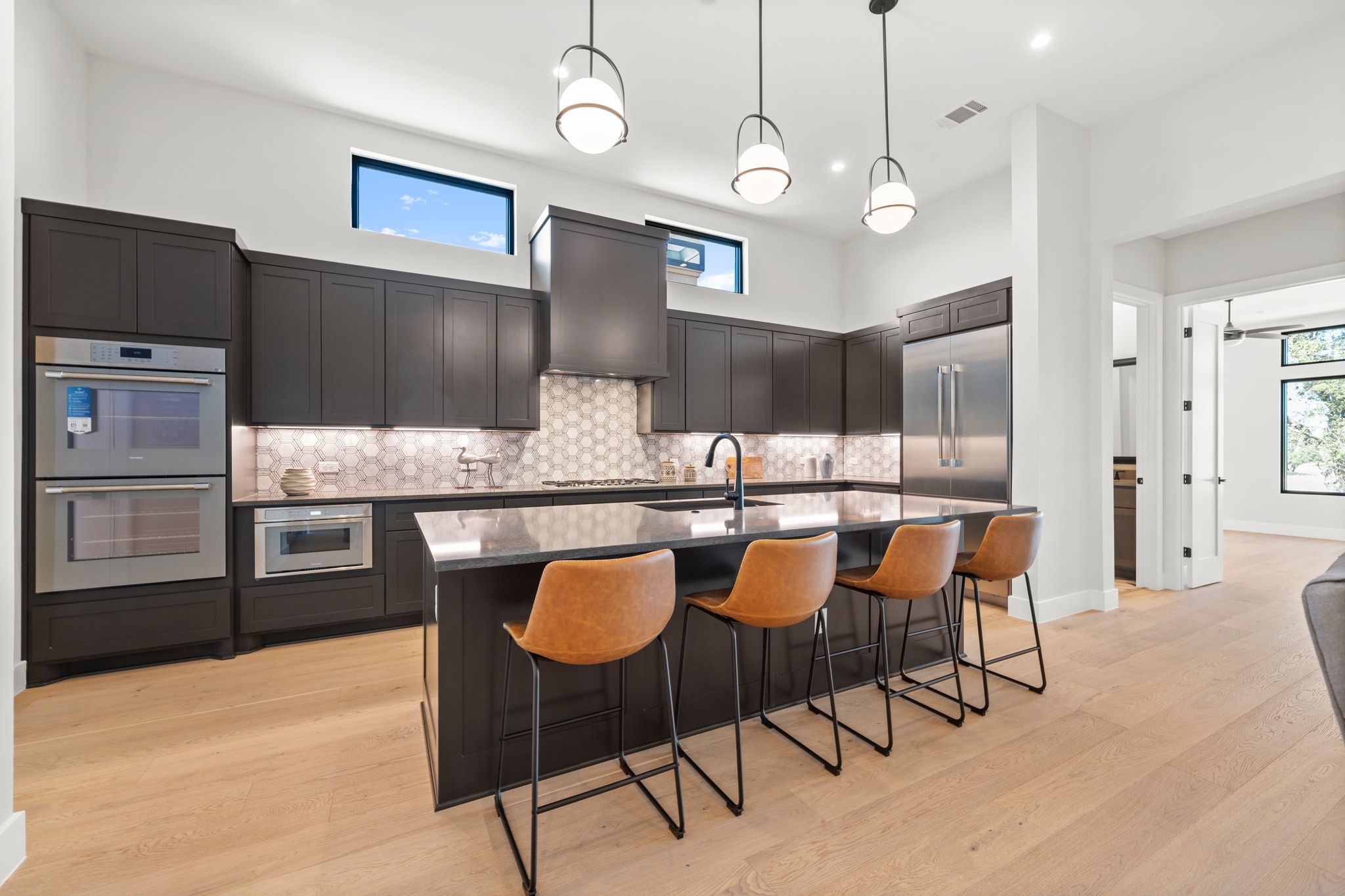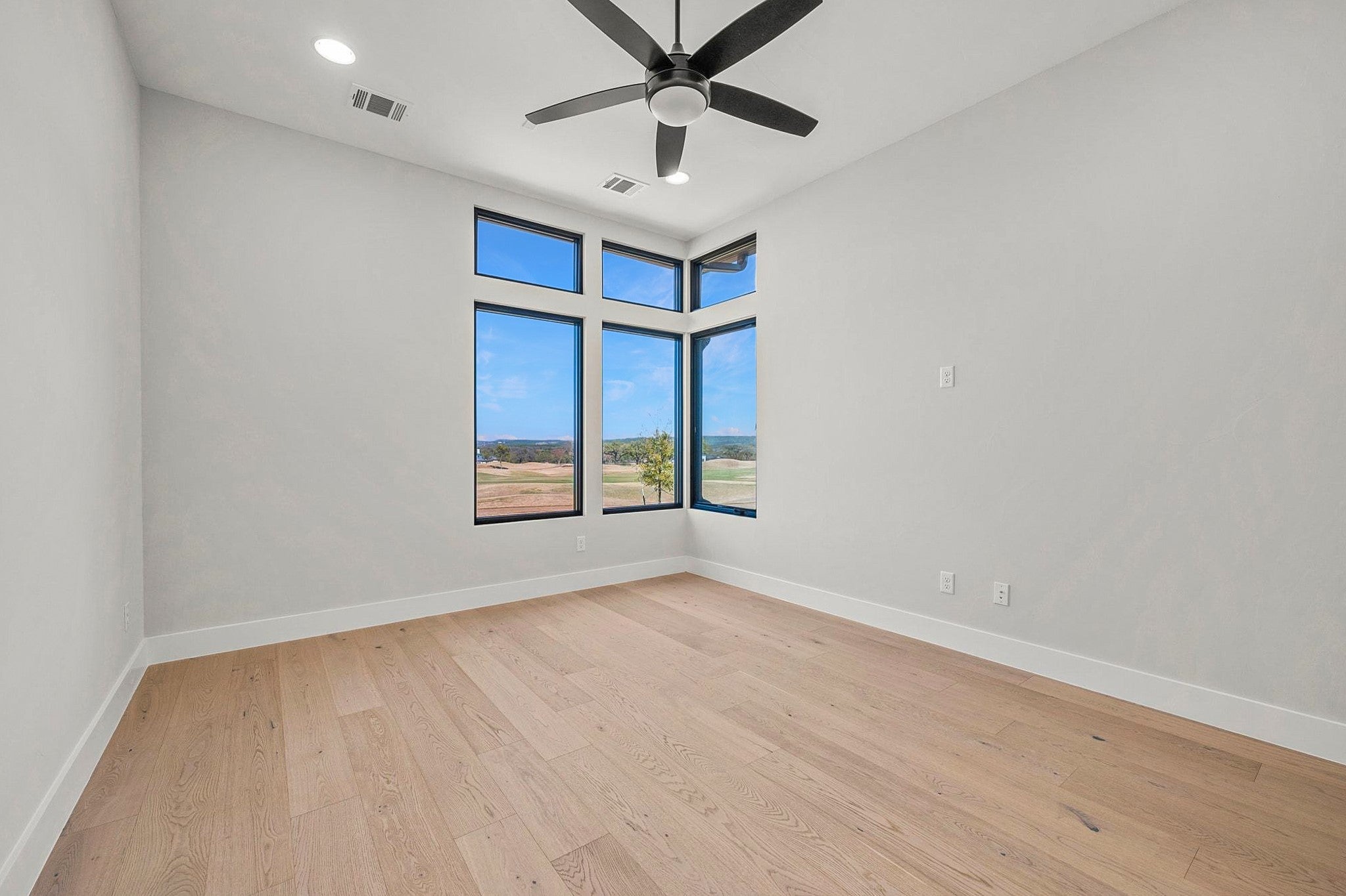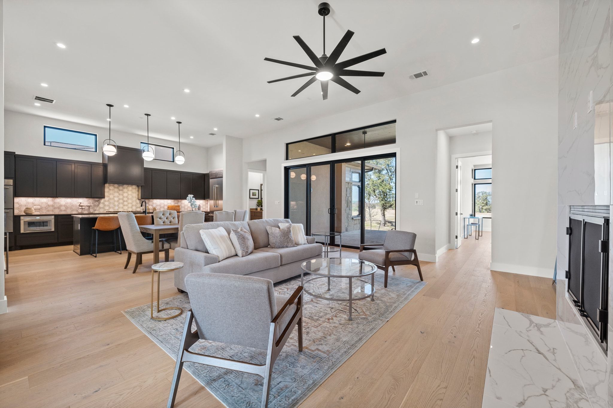 Where Hill Country Luxury Meets the Fairway! Located within the gated golf and racquet community of Lakecliff in Spicewood, this newly constructed residence offers an effortless blend of modern design and resort living along the Arnold Palmer designed course on the #1 hole! Cross the Pedernales River and leave the pace of the city behind as you enter a setting defined by bent grass greens, twelve man-made lakes, scenic waterfalls, and sweeping Hill Country views…a place where quality of life takes center stage. Designed for both comfort and entertaining, the thoughtfully planned layout includes 3.5 baths, 3 bedrooms plus a dedicated office or flex space, with soaring ceilings and expansive windows that invite in natural light. Floor-to-ceiling custom bath tile, warm oak flooring, and refined finishes create a clean, sophisticated aesthetic throughout. The kitchen is anchored by Thermador appliances and seamlessly opens to the main living areas, making everyday living and hosting feel equally effortless. Walls of windows frame the golf course views and bathe the open-concept living spaces in natural light, enhancing the airy, expansive feel of the home. High-end finishes and a flowing, open layout create a seamless connection between the kitchen, dining, and living areas, ideal for both relaxed daily living and entertaining guests. A wet bar or butler’s pantry adds sophistication, while the oversized 2.5-car garage offers ample space for a golf cart and additional storage to embrace the Lakecliff lifestyle. Enjoy golf course VIEWS with the #1 hole as your backdrop, along with access to Lakecliff’s club amenities including golf, racquet facilities, swimming, dining, and an active calendar of social events-all within a secure, gated Hill Country setting. Approved for short-term rental use, this property offers flexibility whether as a full-time residence, second home, or investment opportunity. Quality like this cannot be duplicated anywhere near this price point!