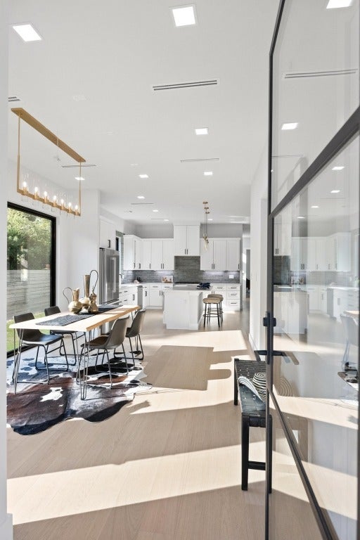Experience elevated living in this newly constructed 4-bedroom, 3.5-bath masterpiece, ideally situated in the heart of Austin’s coveted 78704. Spanning 2,973 square feet, this thoughtfully designed residence blends modern sophistication with resort-style comfort. The main level hosts a spacious primary suite with serene views of the pool and sun deck. Its spa-like bath features a dual vanity, expansive steam shower with a soaking tub inside, and a generous walk-in closet. The living room is an entertainer’s dream, complete with built-in bookcases, a dry bar, recessed lighting, smart thermostat, and floor-to-ceiling sliding glass doors that blur the line between indoor elegance and outdoor leisure. The chef’s kitchen is outfitted with quartz countertops, a butler’s pantry, and seamlessly opens to the family room for easy entertaining. Additional highlights on the main floor include a stylish powder room, laundry room with utility sink, and extra storage tucked neatly beneath the stairs. Upstairs, you’ll find three additional bedrooms—two with en-suite baths—along with a versatile loft area perfect for a media room, playroom, or home office. Step out onto the rooftop deck and take in the treetop views and Austin skyline. Smart home features, refined finishes, and designer details throughout make this home a true retreat in one of Austin’s most vibrant neighborhoods.