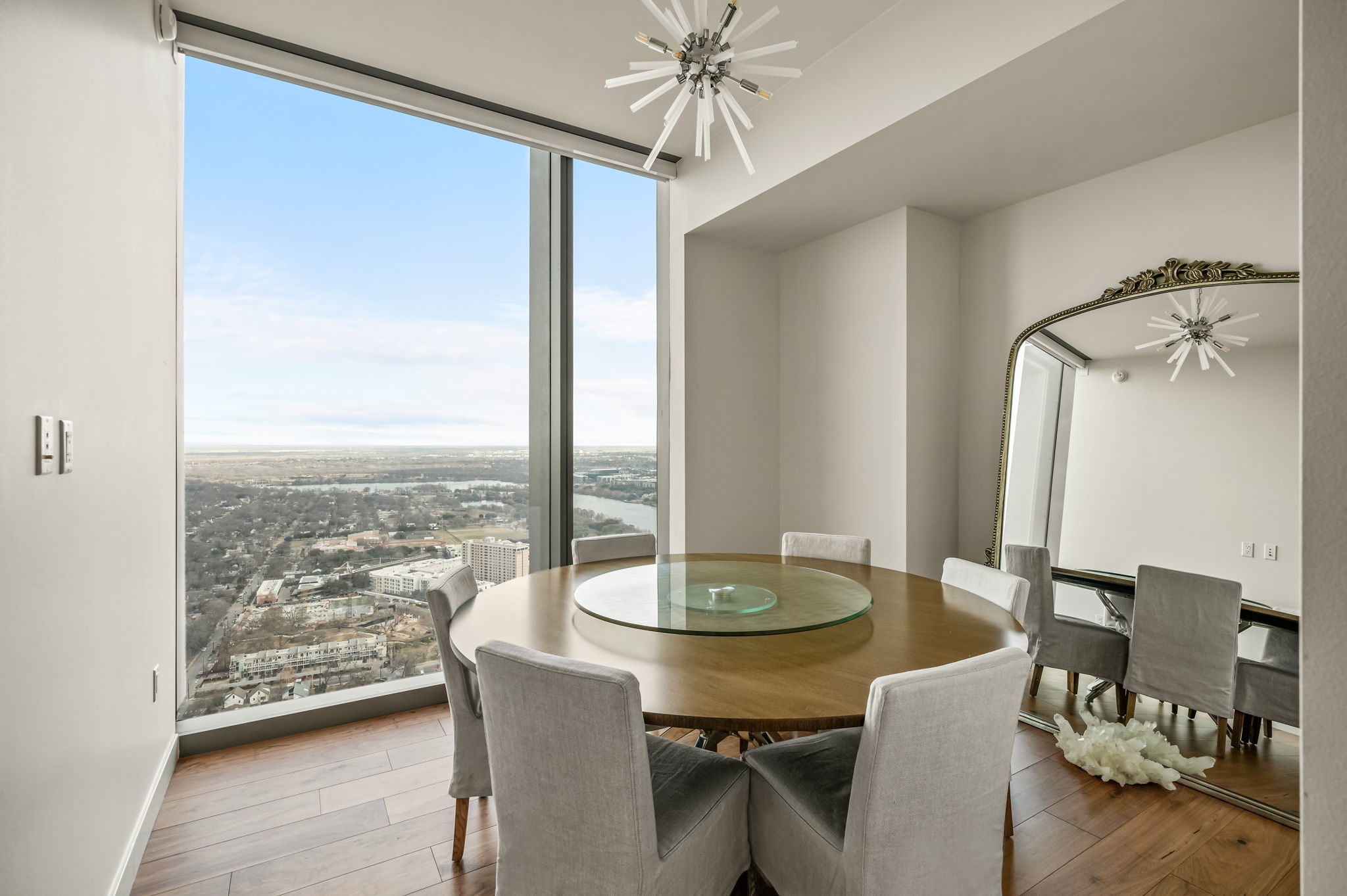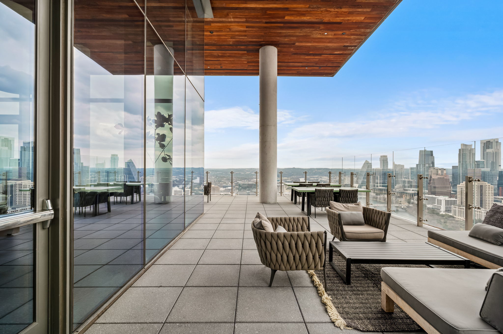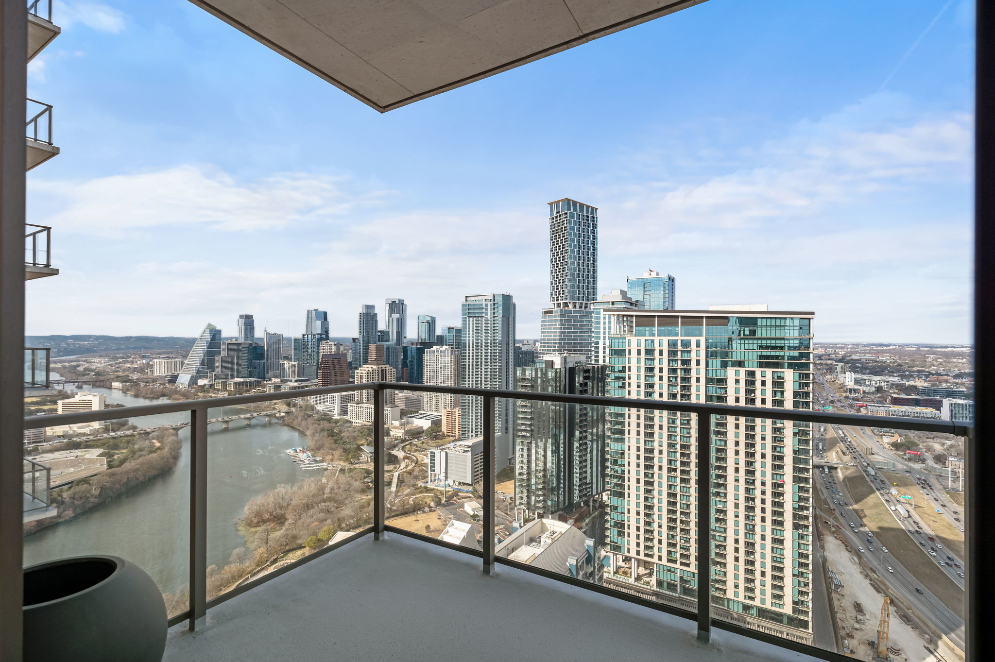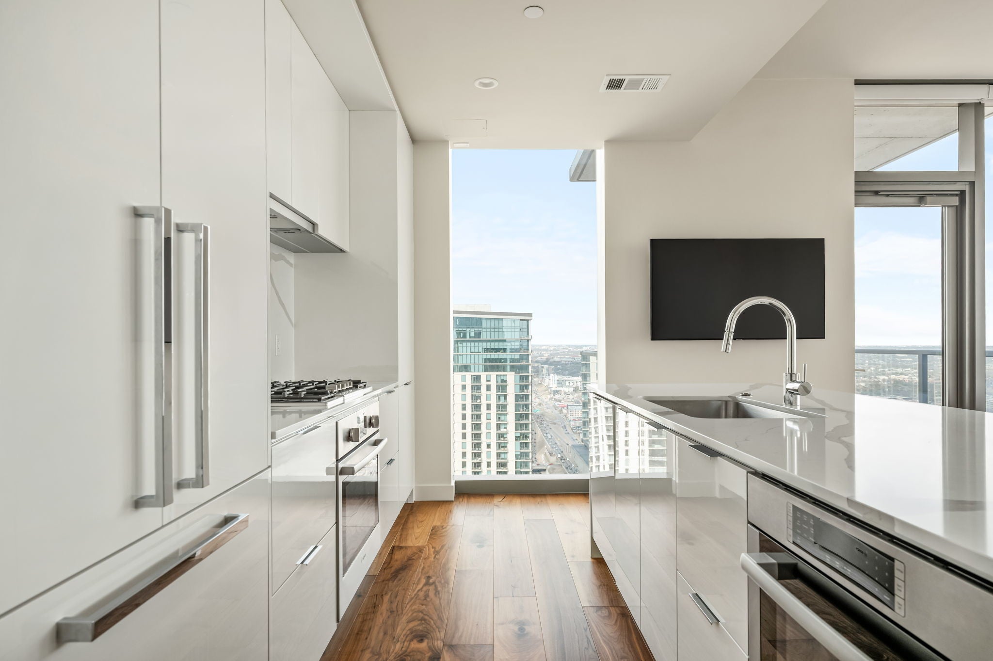 Experience elevated high-rise living at 44 East Ave #4104 in the heart of Rainey Street Historic District. Perched on the 41st floor, this sleek 2-bedroom, 2-bath residence showcases breathtaking panoramic city views through dramatic floor-to-ceiling windows that flood the home with natural light. The open-concept living space blends modern sophistication with warm finishes, featuring wide-plank wood floors and a seamless flow from the living area into a designer kitchen. The kitchen is outfitted with custom cabinetry, quartz countertops with waterfall edge, a striking marble backsplash, built-in appliances, gas cooktop, and an oversized island with bar seating—perfect for entertaining against a stunning skyline backdrop. The spacious primary suite is a true retreat, framed by incredible views and filled with natural light. The spa-inspired en suite bath offers a double vanity, large walk-in shower, and a separate soaking tub for ultimate relaxation. A well-appointed secondary bedroom and full bath provide flexibility for guests or a home office. Step outside and enjoy everything luxury living at 44 East Avenue has to offer, including a resort-style pool, state-of-the-art fitness center, stylish resident lounge, and premium concierge amenities. Located in the vibrant Austin core, just steps from Rainey Street’s renowned dining and nightlife, Lady Bird Lake hike-and-bike trails, and minutes to Downtown hotspots, this residence delivers the ultimate blend of sophistication, convenience, and iconic city living.