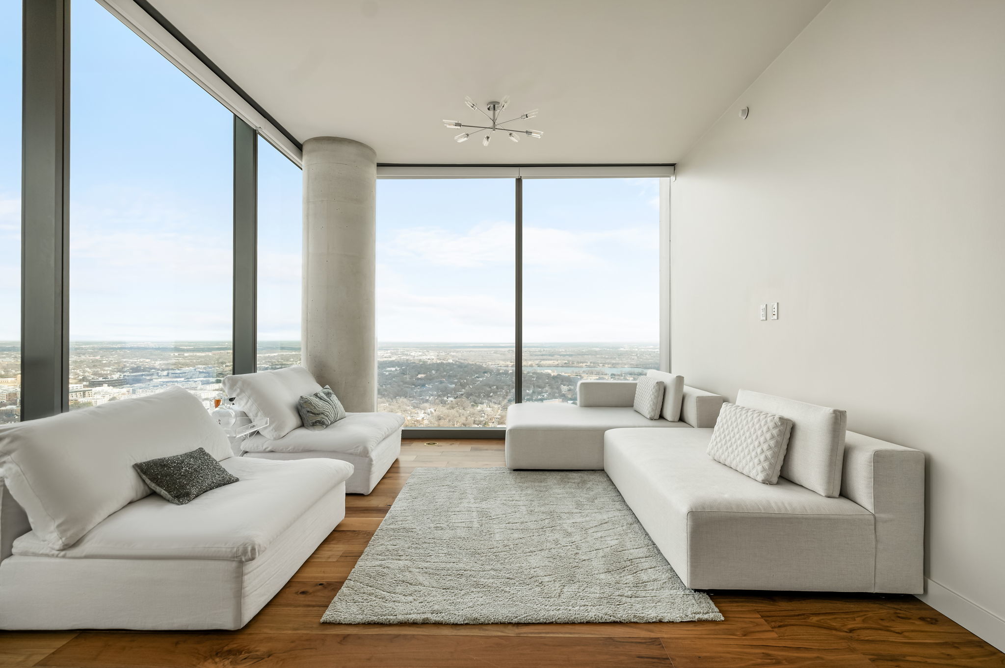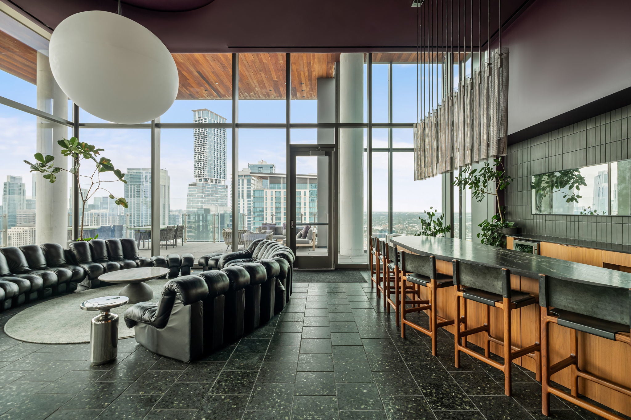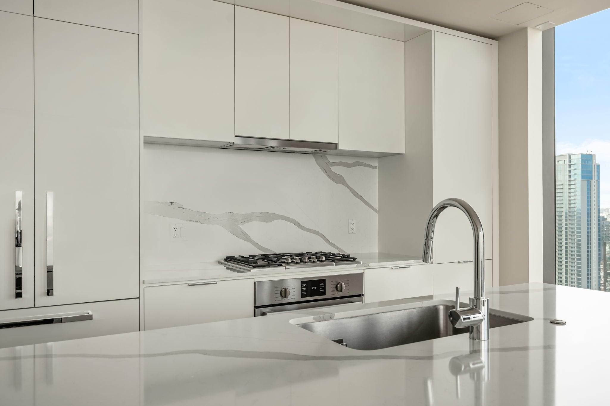 Experience elevated high-rise living at 44 East Ave #4104 in the heart of Rainey Street Historic District. Perched on the 41st floor, this sleek 2-bedroom, 2-bath residence showcases breathtaking panoramic city views through dramatic floor-to-ceiling windows that flood the home with natural light. The open-concept living space blends modern sophistication with warm finishes, featuring wide-plank wood floors and a seamless flow from the living area into a designer kitchen. The kitchen is outfitted with custom cabinetry, quartz countertops with waterfall edge, a striking marble backsplash, built-in appliances, gas cooktop, and an oversized island with bar seating—perfect for entertaining against a stunning skyline backdrop. The spacious primary suite is a true retreat, framed by incredible views and filled with natural light. The spa-inspired en suite bath offers a double vanity, large walk-in shower, and a separate soaking tub for ultimate relaxation. A well-appointed secondary bedroom and full bath provide flexibility for guests or a home office. Step outside and enjoy everything luxury living at 44 East Avenue has to offer, including a resort-style pool, state-of-the-art fitness center, stylish resident lounge, and premium concierge amenities. Located in the vibrant Austin core, just steps from Rainey Street’s renowned dining and nightlife, Lady Bird Lake hike-and-bike trails, and minutes to Downtown hotspots, this residence delivers the ultimate blend of sophistication, convenience, and iconic city living.