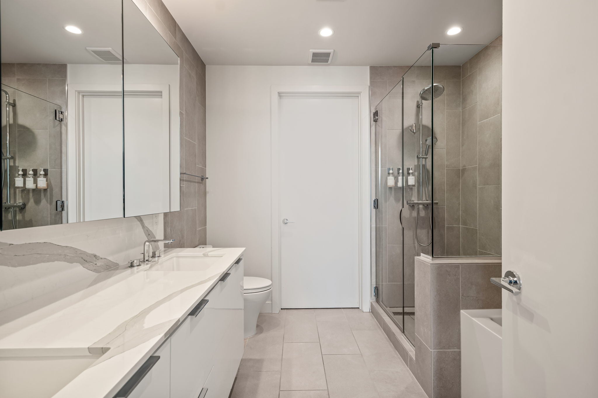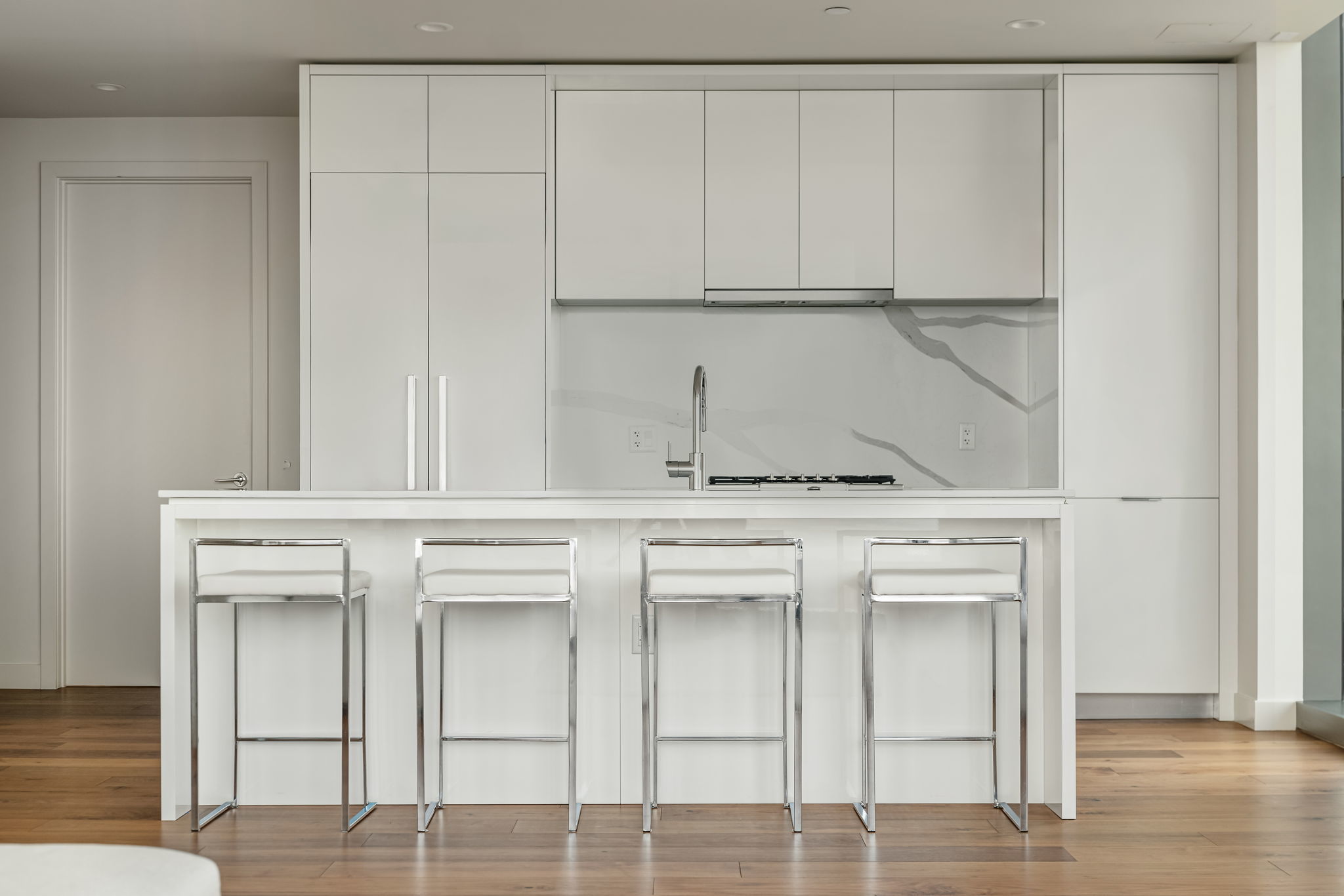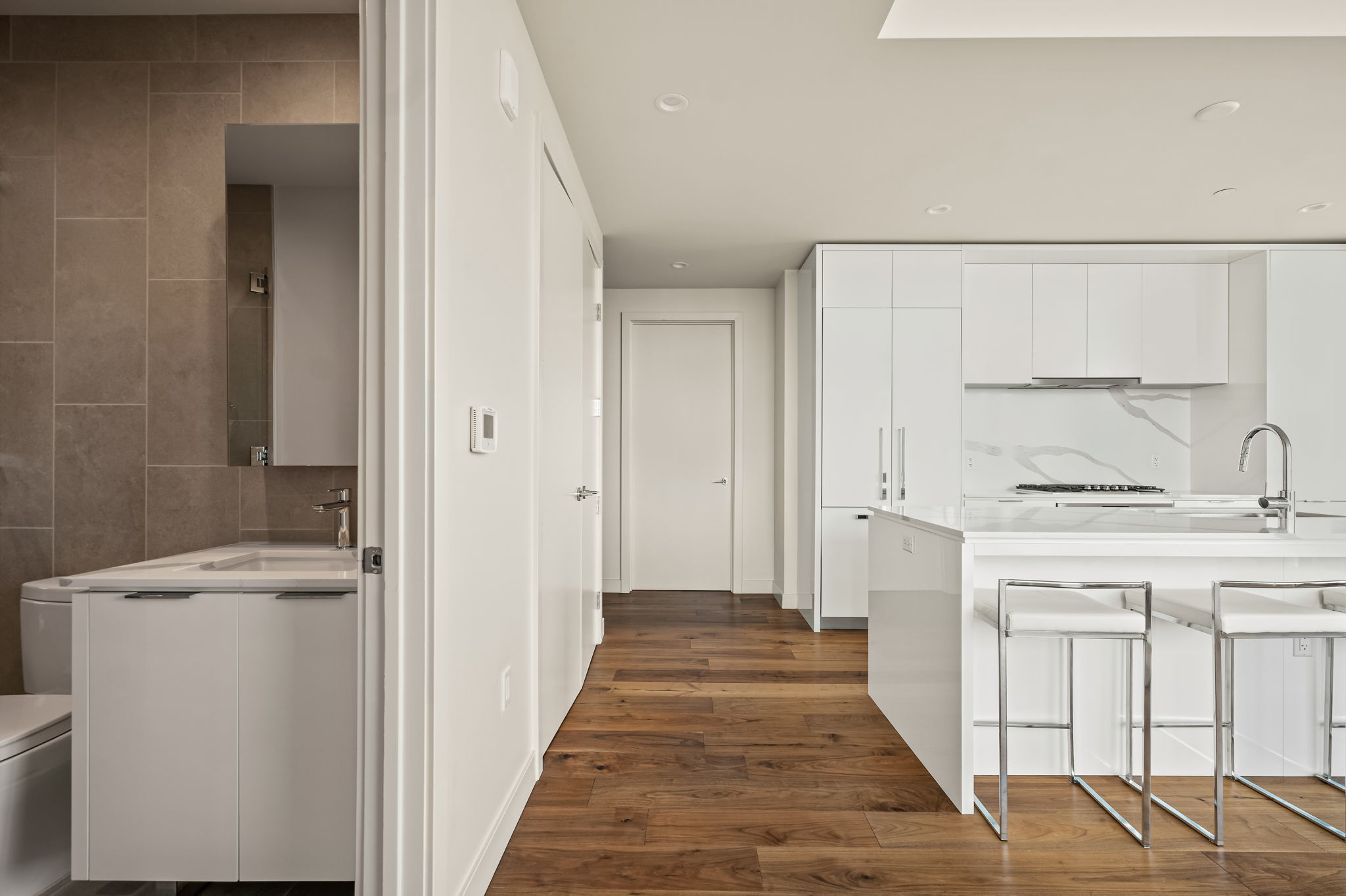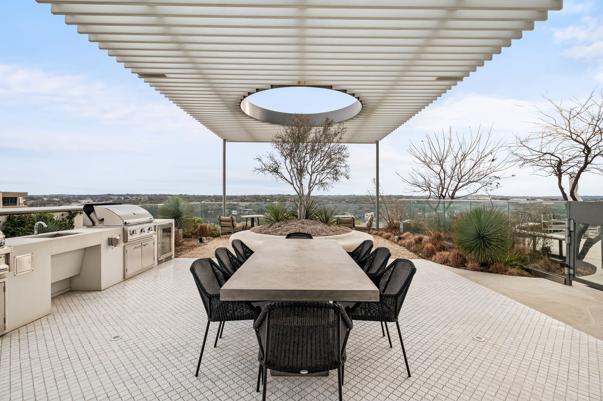 Experience elevated high-rise living at 44 East Ave #4104 in the heart of Rainey Street Historic District. Perched on the 41st floor, this sleek 2-bedroom, 2-bath residence showcases breathtaking panoramic city views through dramatic floor-to-ceiling windows that flood the home with natural light. The open-concept living space blends modern sophistication with warm finishes, featuring wide-plank wood floors and a seamless flow from the living area into a designer kitchen. The kitchen is outfitted with custom cabinetry, quartz countertops with waterfall edge, a striking marble backsplash, built-in appliances, gas cooktop, and an oversized island with bar seating—perfect for entertaining against a stunning skyline backdrop. The spacious primary suite is a true retreat, framed by incredible views and filled with natural light. The spa-inspired en suite bath offers a double vanity, large walk-in shower, and a separate soaking tub for ultimate relaxation. A well-appointed secondary bedroom and full bath provide flexibility for guests or a home office. Step outside and enjoy everything luxury living at 44 East Avenue has to offer, including a resort-style pool, state-of-the-art fitness center, stylish resident lounge, and premium concierge amenities. Located in the vibrant Austin core, just steps from Rainey Street’s renowned dining and nightlife, Lady Bird Lake hike-and-bike trails, and minutes to Downtown hotspots, this residence delivers the ultimate blend of sophistication, convenience, and iconic city living.
