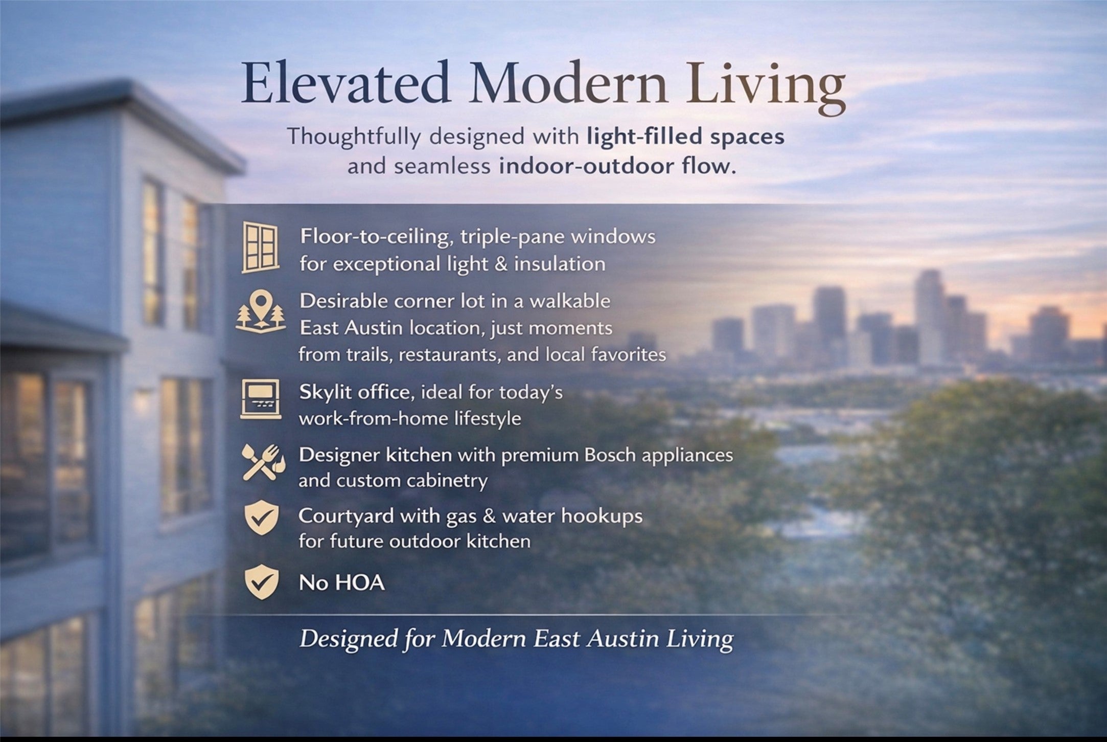 New renderings are in! Introducing 111 Mildred St #3 - a thoughtfully designed new construction home located on a corner lot in Austin’s vibrant East Side. This residence reflects a shared focus on quality, comfort, and smart design. The home offers 3 bedrooms and 3.5 bathrooms, with an open-concept floor plan that is elevated by soaring ceilings and floor-to-ceiling, triple-pane windows, creating a bright, quiet interior that feels both expansive and refined The layout is intentionally designed for modern living, featuring a skylit office retreat ideal for today’s work-from-home lifestyle, seamless hardwood floors throughout, and a designer kitchen with integrated Bosch appliances and custom cabinetry, including a built-in media cabinet and dedicated pantry with appliance counter. Spa-inspired baths with dual shower and curbless entries reinforce the home’s clean, contemporary aesthetic. Outdoor spaces are equally curated, with a private terrace finished in warm wood accents, Trex decking, and gas and water connections for effortless indoor-outdoor living, all thoughtfully designed and without the constraints of an HOA. Located just two blocks from trails, restaurants and shopping, this rare carefully planned home offers walkability, convenience, and easy access to the energy and character that define East Austin living. Estimated for spring 2026 completion. Listing agent is a licensed real estate agent in Texas and has an ownership interest in the property.