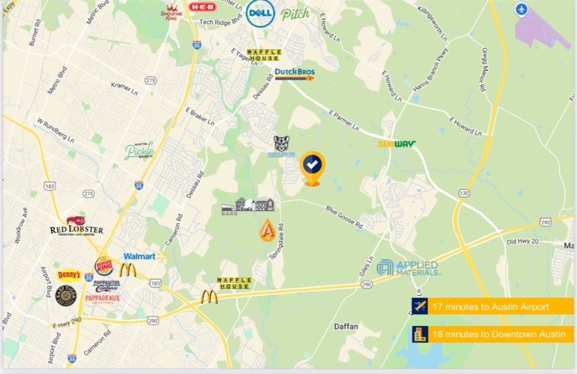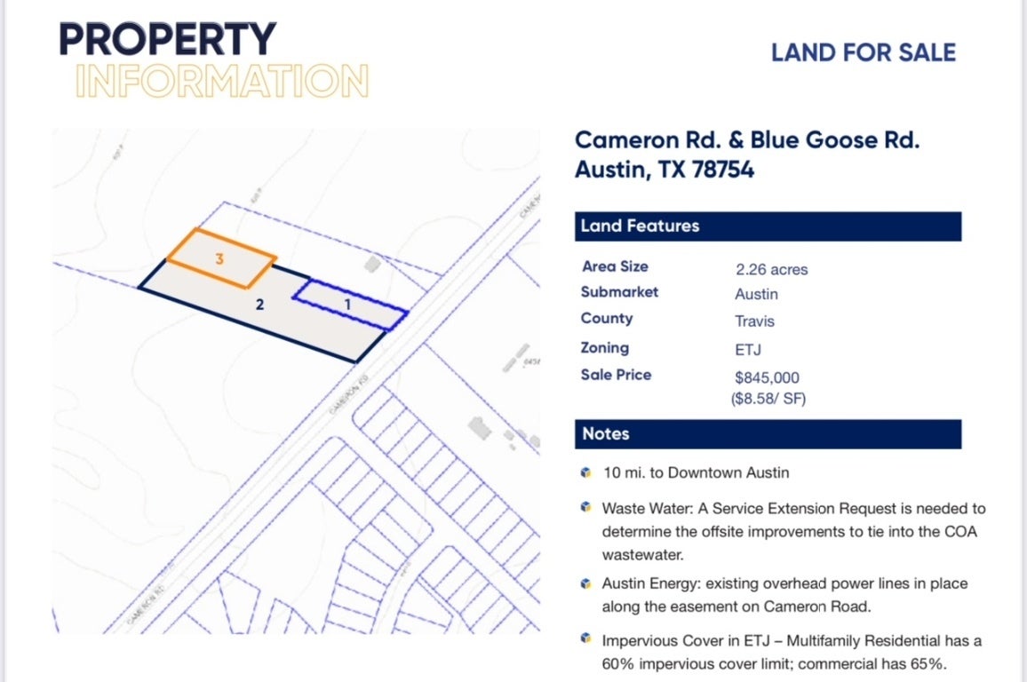 10 mi. to Downtown Austin. Waste Water: A Service Extension Request is needed to determine the offsite improvements to tie into the COA wastewater. Austin Energy: existing overhead power lines in place along the easement on Cameron Road. Impervious Cover in ETJ – Multifamily Residential has a 60% impervious cover limit; commercial has 65%. Because it is in the ETJ, we think this can be an apartment or Industrial development as well. Or, it could be a housing development or ranch. There is a fence and gate. Most groups can just go drive by or look at it from Google Earth. If you want to walk the land, we recommend boots and we can get them on it.