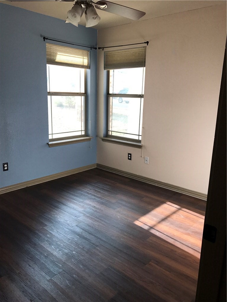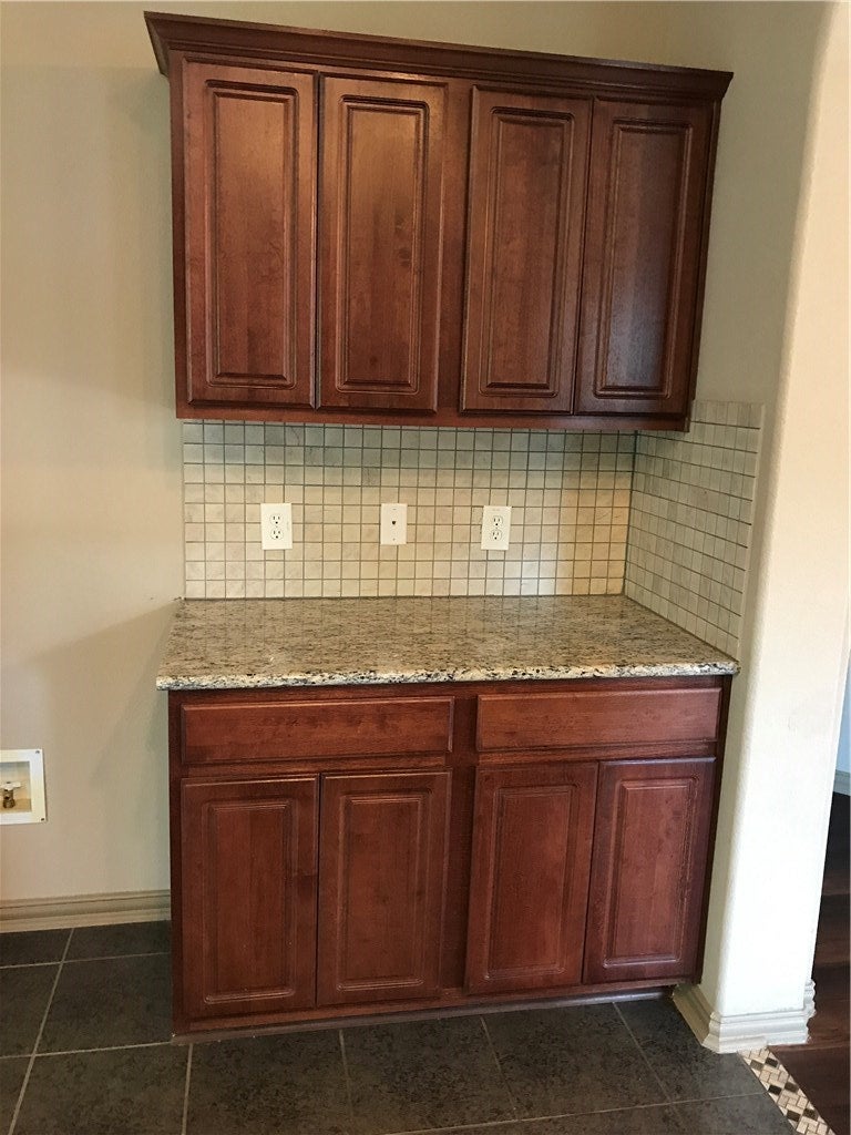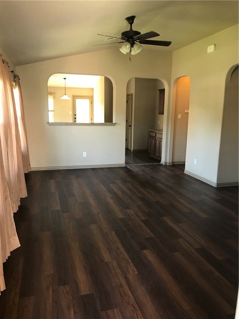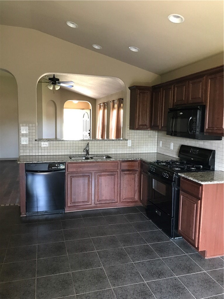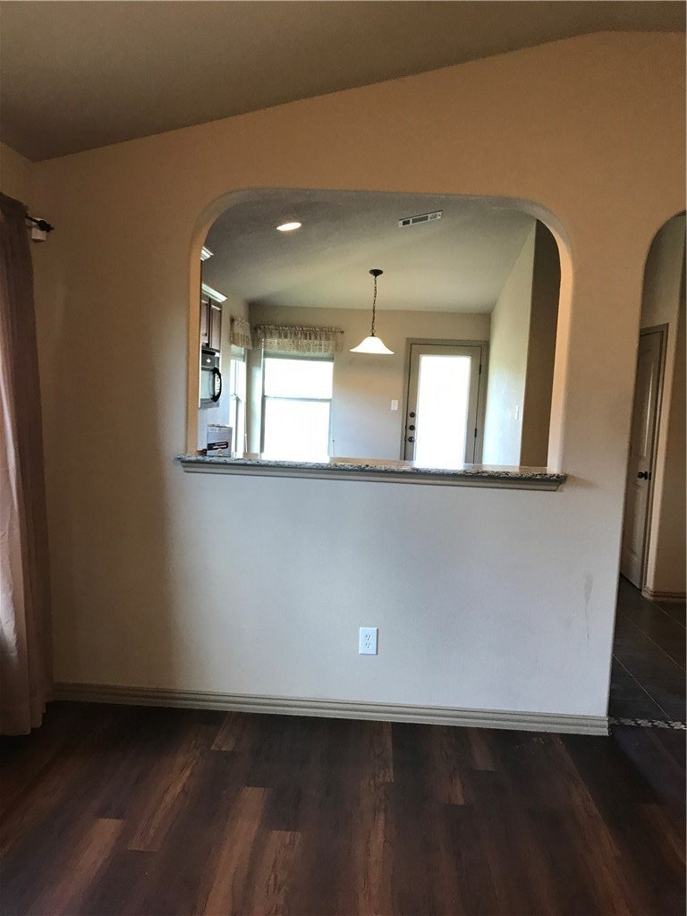 Beautiful stone and brick single story home on a large privacy fenced corner lot. No carpet here al laminate flooring, no popcorn on the tall 10 foot ceilings. Gorgous black marbled granite counter tops, Stainless appliances and microwave included. Refrigerator can stay but owner may not fix if it breaks. Art and TV nooks, rounded corners, in entire home. large utility room off hall by garage entrance. Spacious primary bedroom with ceiling fan and bathroom with separate tub and shower. THE GARAGE IS HUGE 398 PER TAX RECORDS AND THEN EXTRA 109 FEET OF BUMP OUT SPACED,AKA WORKSHOP AREA. This home rents fast and people stay for years.