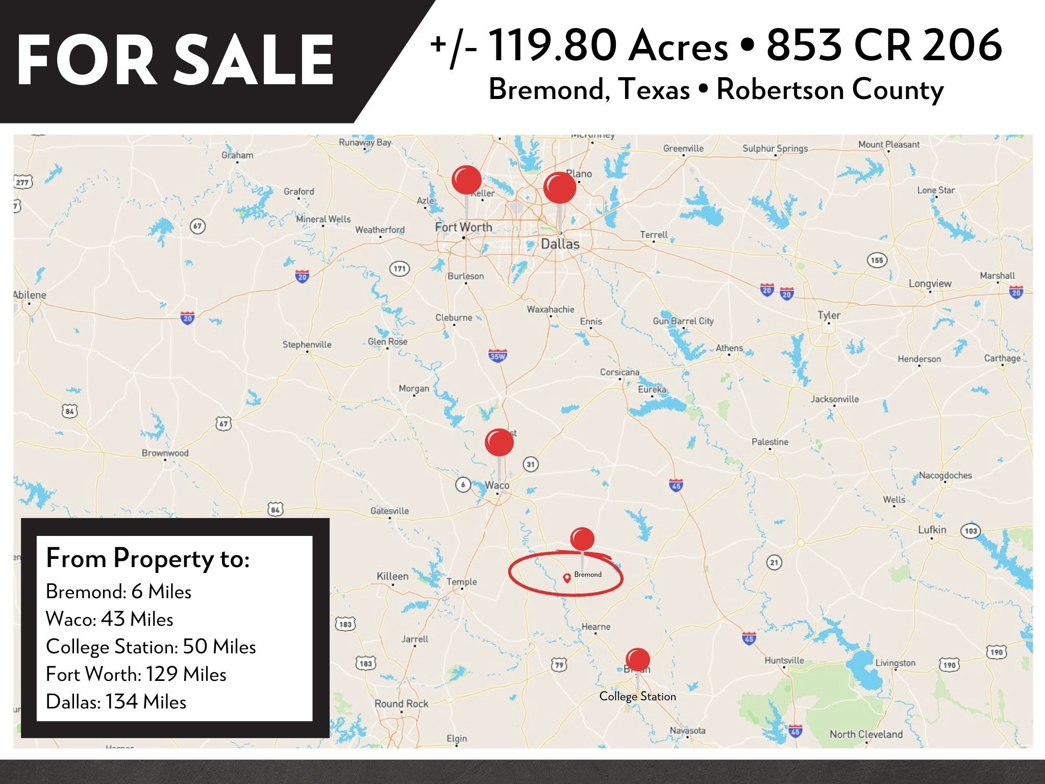 If you are looking for a quiet place to build, hunt or just get away from it all this 119 (+/-) acres is the place you have been looking for. From open pastures, 2 ponds, perimeter fencing and mix of big beautiful pecan and oak trees there are limitless opportunities for hunting, cattle or whatever you choose. The 3200 sq foot shop, precious cabin, storage conex, 3 septic systems, paved road frontage and lean to barn are just a few of the things that set this property apart. Being centrally located to College Station, Waco, Ft Worth and Dallas allow for an easy commute as well. Come and get it in time for deer season!