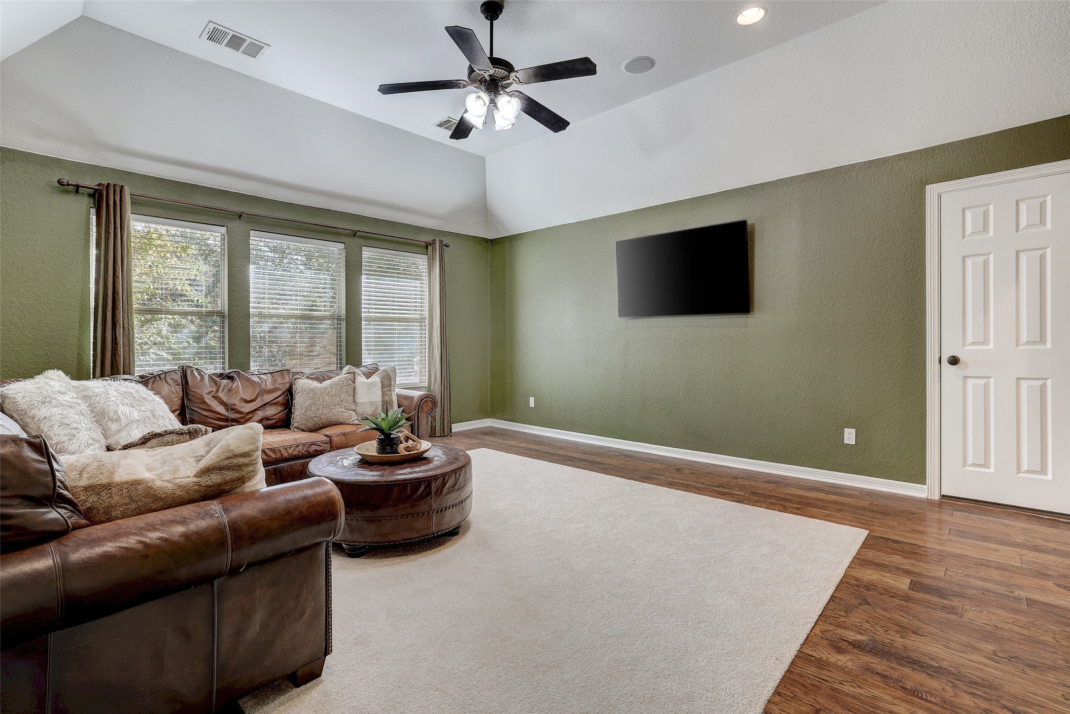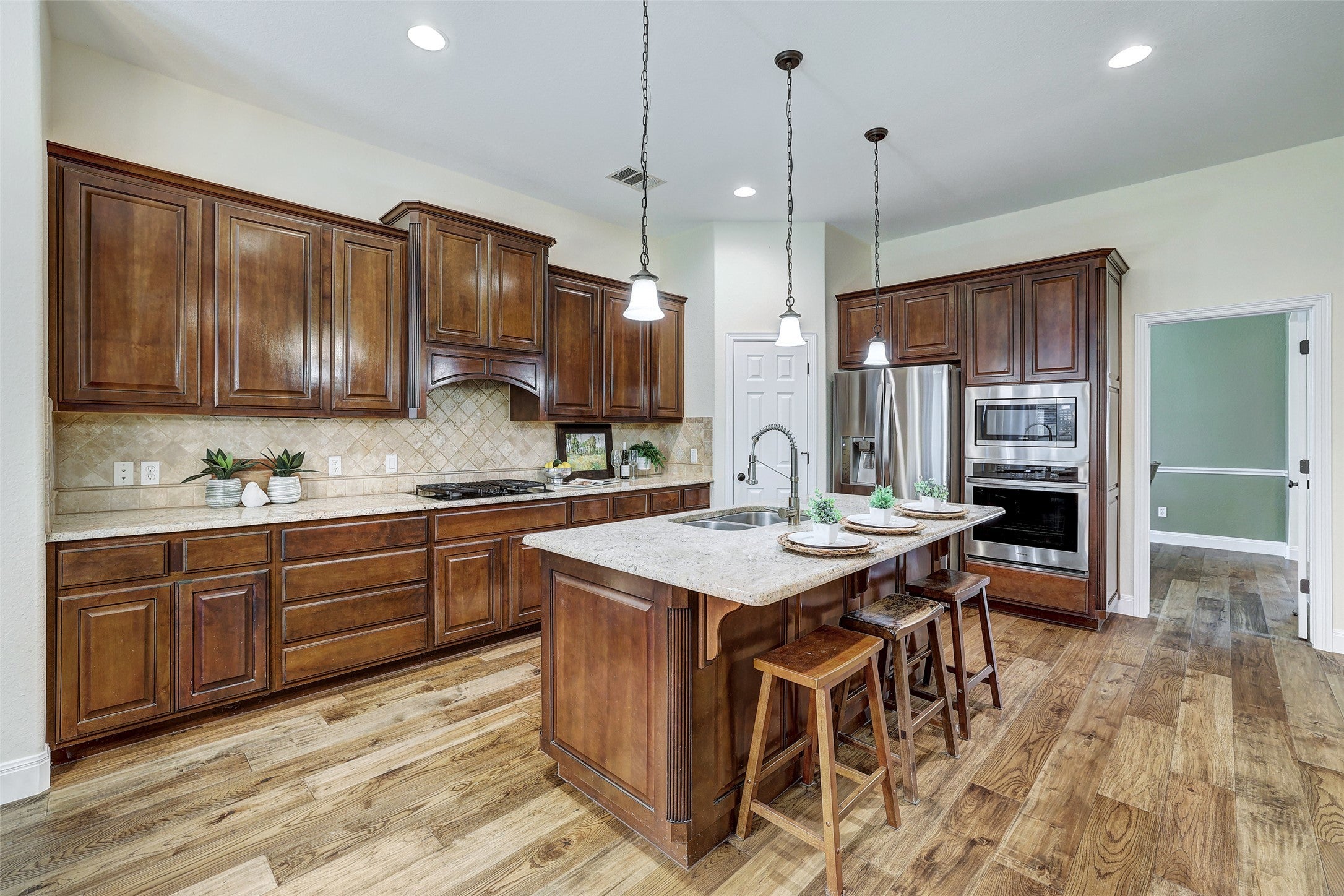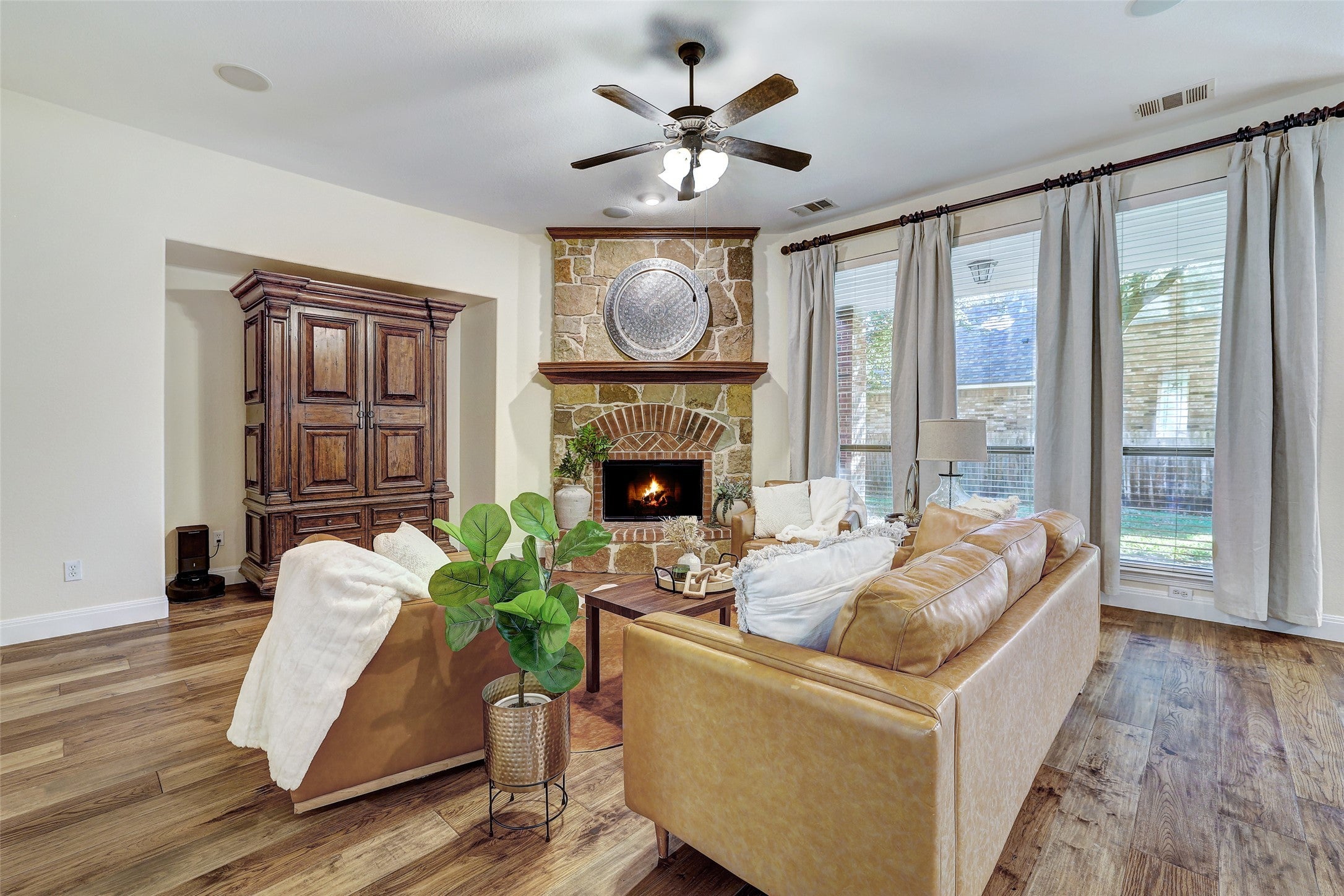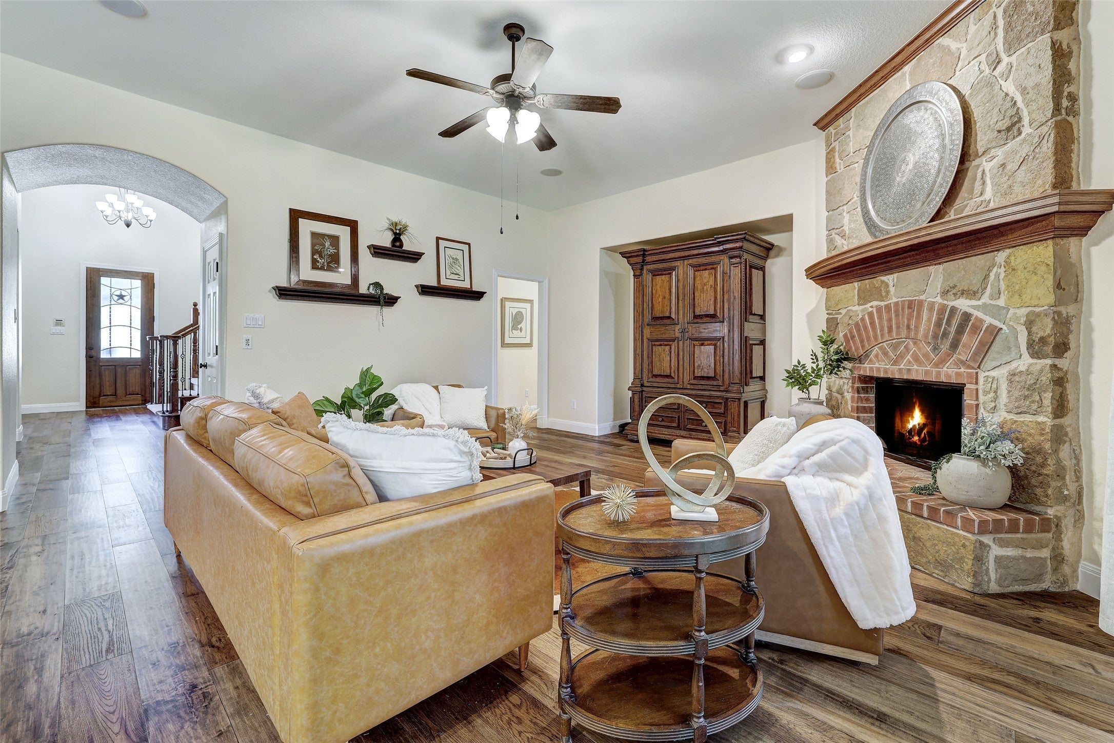 Experience refined living in the Walsh Ranch community with this beautifully appointed 5-bedroom, 4-bath home. Designed with comfort and sophistication in mind, the dream floorplan features two bedrooms on the main level—including an elegant primary retreat and a well-appointed guest suite, each with its own full bath for everyday convenience and gracious hospitality. A private study adds the perfect touch for work or quiet focus time. The kitchen is the stylish heart of the home, offering granite countertops, a generous center island, a breakfast room, pantry, and seamless flow into the sun-filled living area. High ceilings, rich wood flooring, and a cozy fireplace elevate the space, while a formal dining room sets the stage for memorable gatherings. Upstairs, a beautiful staircase guides you to three additional bedrooms—two connected by a J-and-J bath—plus another full bath nearby. A spacious game room offers a versatile second living area ideal for relaxation, media, or play. Set on an expansive, beautifully landscaped lot, the backyard features mature oaks, crepe myrtles, fencing for privacy, and a covered patio perfect for unwinding or hosting. Located within acclaimed Round Rock ISD and walking distance to resort-style community amenities—including a pool, trails, playground, and clubhouse—this residence delivers the ideal blend of comfort, elegance, and premier neighborhood living.