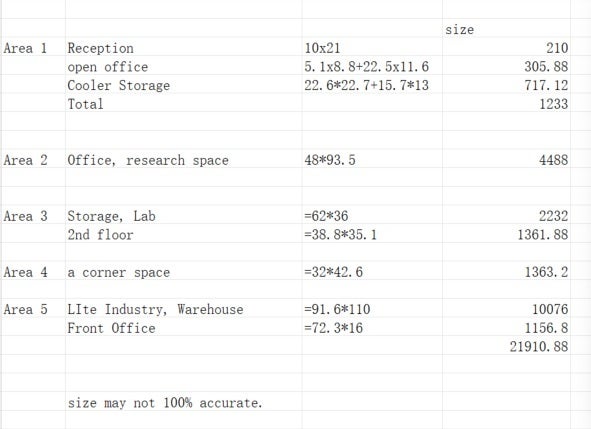 It is the back end of the building. The front buildin is leased out for a long term tenant. Pls see floor plan imaging for "can lease" spaces. Total about 24000 sf. You can lease the whole or just one piece. Price negotisable. Please contact us for any question. Landlord is willing to modify/re-construction the building for your need. Please find more information in Picture section. Listing price is per sf per year. Landlord pay water and tenant pay electricity.