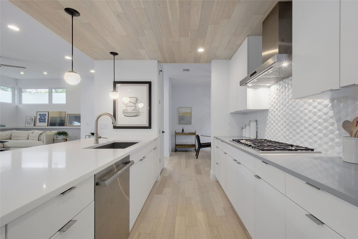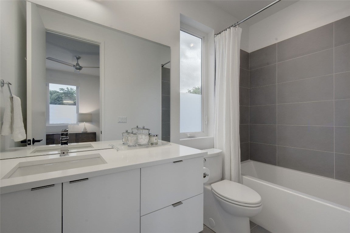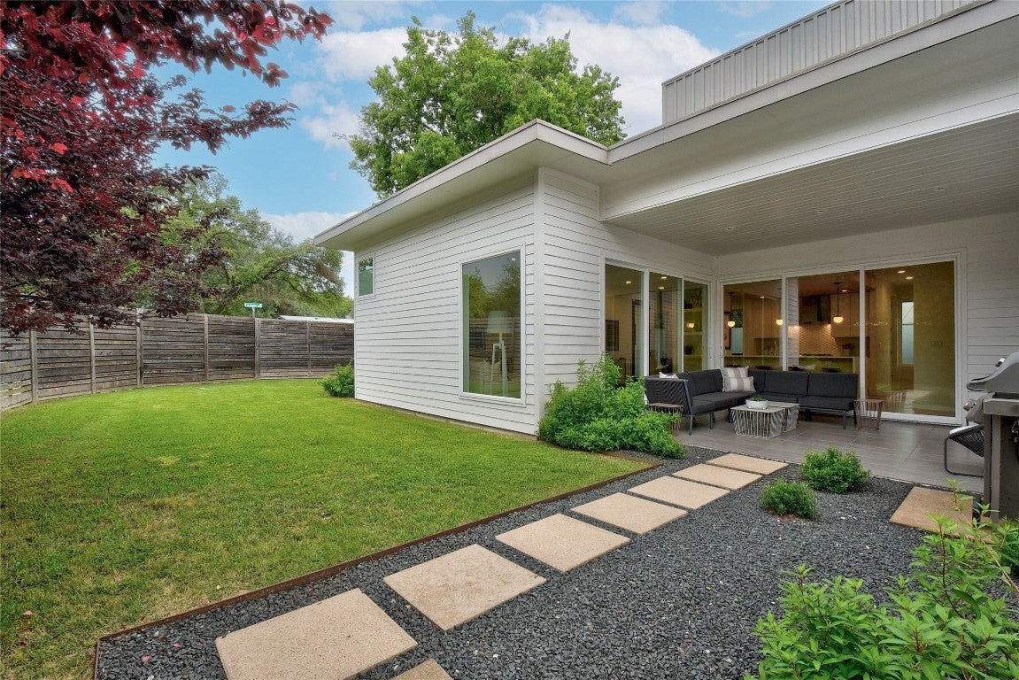 Light-filled luxury in the heart of 78704. Private corner lot w/ room for a pool. Well-planned living with indoor/outdoor flow. High-end kitchen with Thermador appliances & huge L-shape pantry. Rare, spacious 2-car garage. Walkability to restaurants, shopping, schools. Easy driving: ~5 min to downtown, ~12 min to ABIA, ~15 min to golf, tennis, pickleball, and social activities at Westlake Country Club. This free-standing, single family home w/ 3 bedrooms + 3.5 baths offers 2339 sqft of living space. Nestled in one of Austin’s most desirable zip codes. Situated on a gated & flat lot, surrounded by mature plants & trees. As you step into the open living area, the eye-catching 11’ ceilings, custom-built art shelves, & large picture windows strike a balance between elegance & comfort. The wrap-around sliding doors invite you to a large patio, extending your living area into the outdoor space. The kitchen boasts Thermador range top, wall oven & microwave, refrigerator, dishwasher, quartz countertops, ample cabinetry & pantry for storage. The kitchen's seamless flow to the outdoor patio & grilling area, dining room, & living room enhances the overall culinary experience. Retreat to the primary suite located on the first floor with its own private patio, large windows adorned with custom wood valances & blackout shades, a sizable walk-in closet, + an ensuite double-sink vanity bathroom. Upstairs, find comfort in two additional bedrooms, each offering ensuite bathrooms, walk-in closets, & custom wood valances & blackout shades. A custom entertainment center in the media room completes the upstairs living area, perfect for movie nights. Large windows open to views of treetops & sky. Outdoor living highlights include a wrap-around yard that provides plenty of space for entertaining, a grilling area, & lawn games. The exterior of the home was just recently painted. The 8’ double-sided privacy fence ensures a peaceful retreat, & tasteful landscaping adds a touch of tranquility