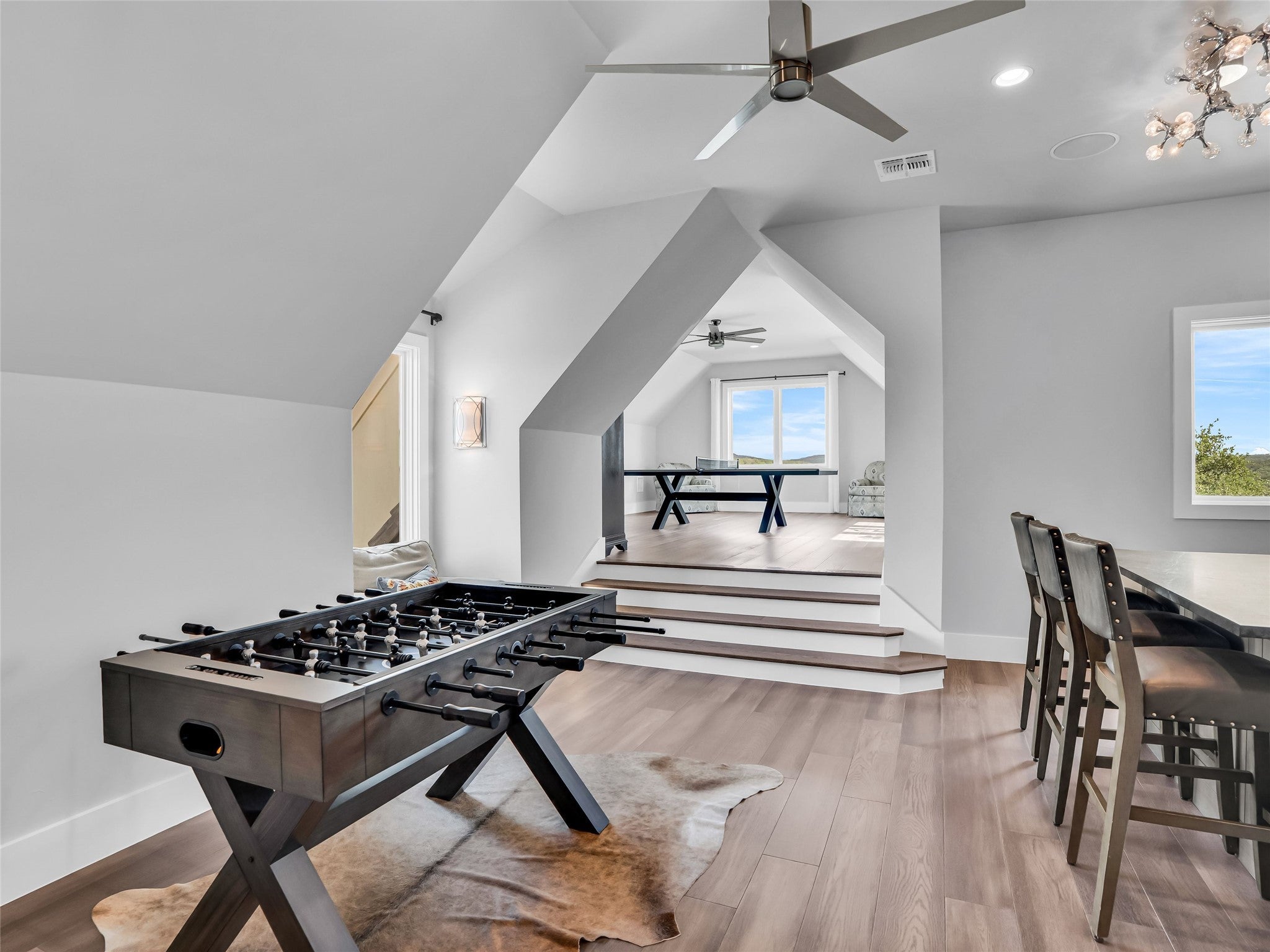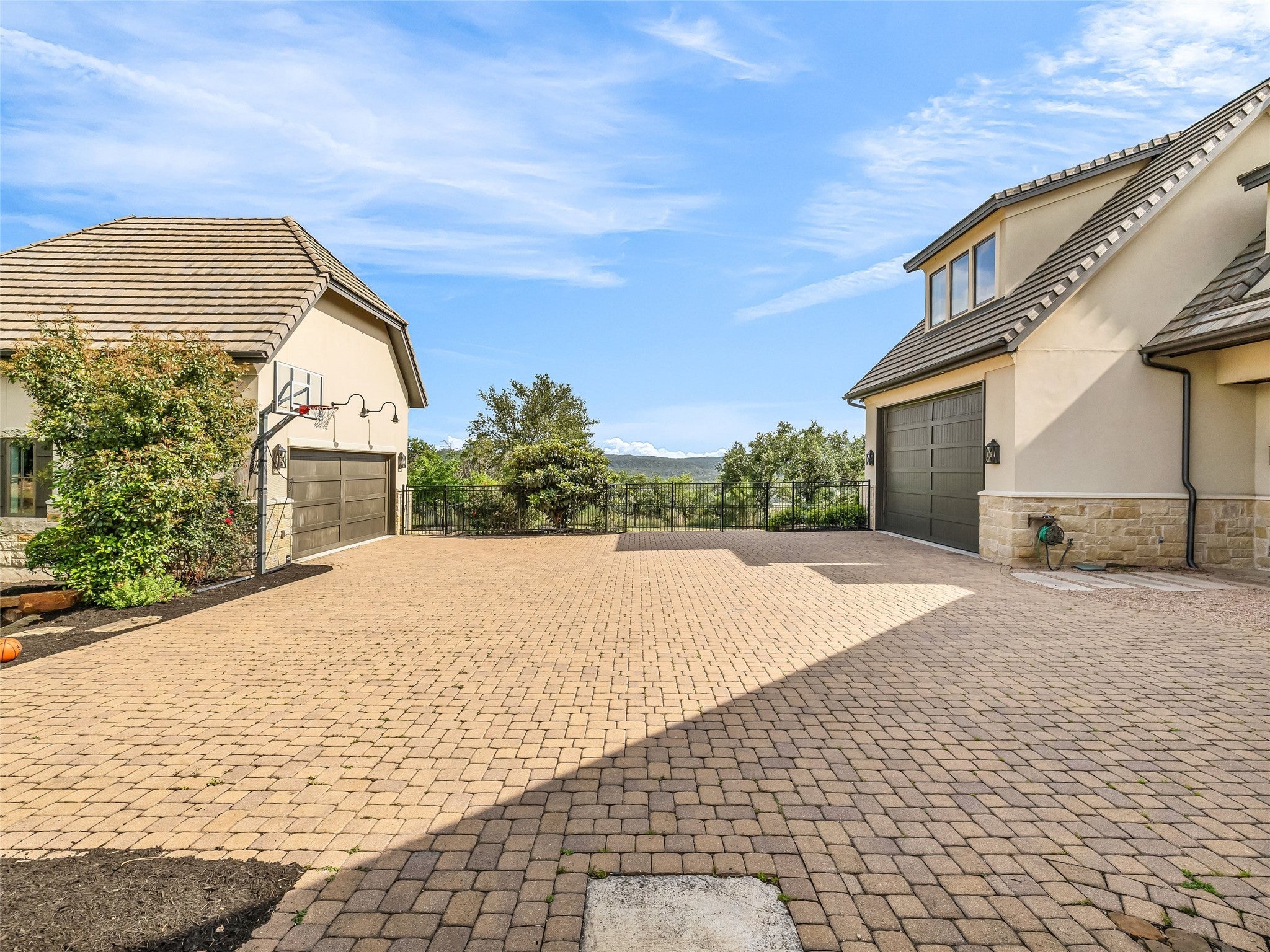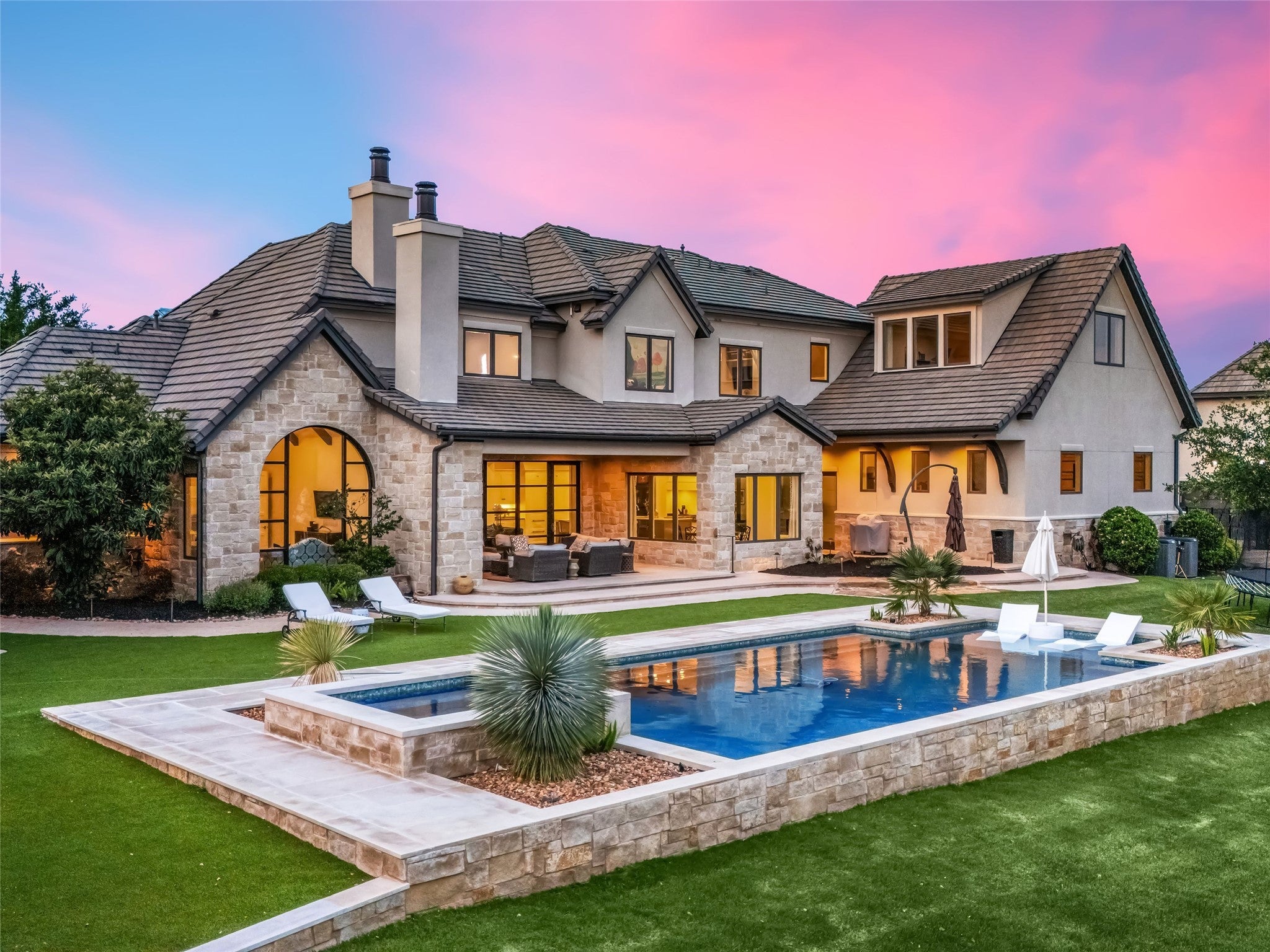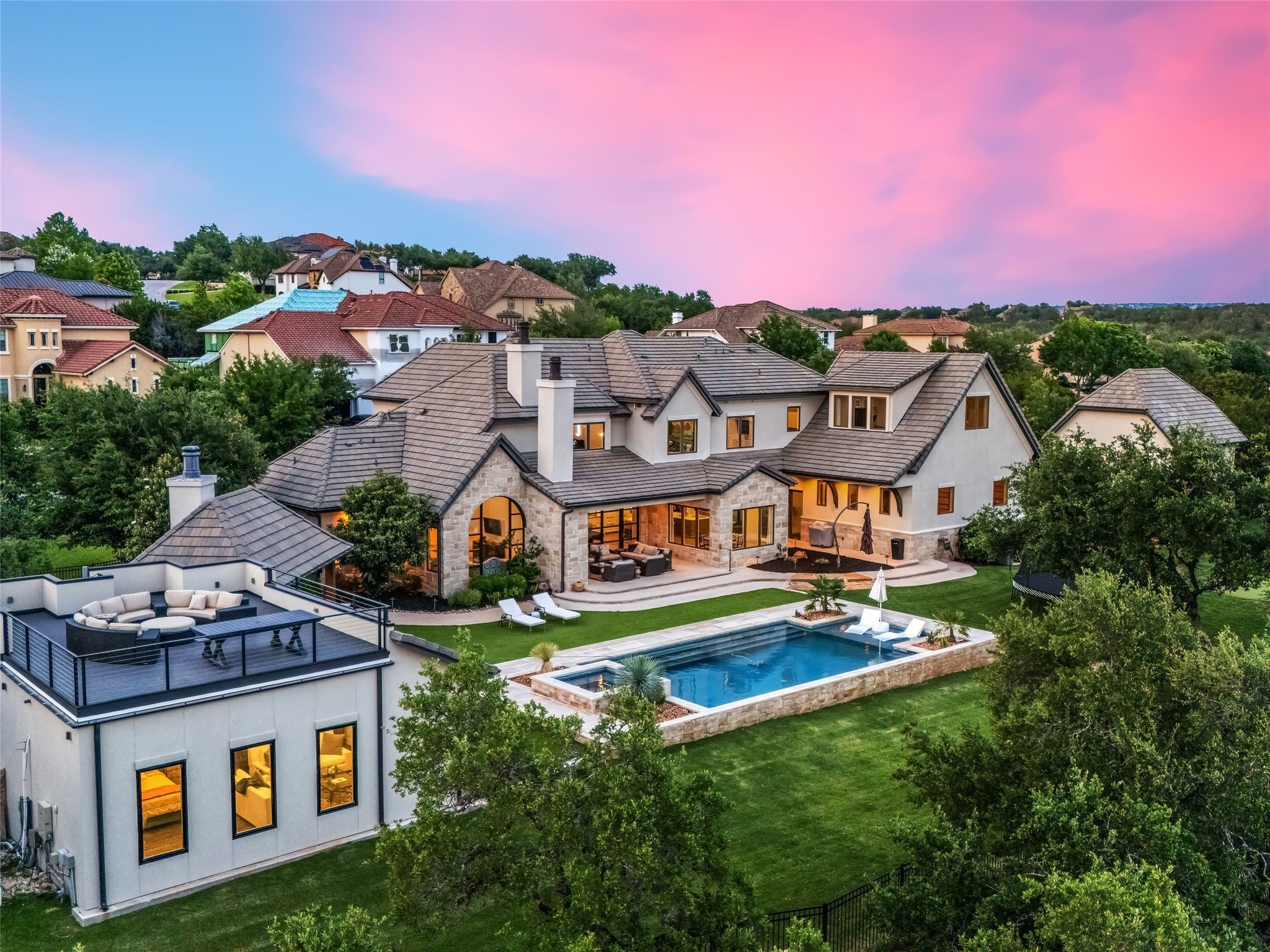 Located high above Lake Austin in the prestigious, guard-gated UT Golf Club community, this estate offers one of the most compelling opportunities in Steiner Ranch. Set on a private 1.057-acre lot and spanning 7,500+ square feet, the home blends architectural refinement with resort-style outdoor living—ideal for discerning buyers seeking space, privacy, and elegance. Designed for elevated living and entertaining, the home features six bedrooms, six full bathrooms, a powder bath, and multiple living areas. The owner’s suite is privately positioned on the main level, with dual closets, a spa-like bath, and Hill Country views. Throughout, wide-plank hardwoods, timber beams, custom steel doors, and designer lighting create an atmosphere of understated luxury. The gourmet kitchen includes dual marble islands, a Wolf range, Sub-Zero refrigeration, double ovens, and a butler’s pantry. A full bar off the kitchen includes a wine fridge, ice maker, and custom cabinetry—perfect for entertaining. Additional highlights include a study, media room, upstairs lounge with half kitchen, and smart home features. Outdoor living is elevated with 2,500+ sq ft of covered patios, a heated pool and spa, fire pit, rooftop lounge, and a full kitchen with hibachi grill, pizza oven, and Twin Eagle appliances. A putting green, basketball hoops, and lush landscaping add to the lifestyle. The detached 700 SF casita includes a full bath and private rooftop terrace with Lake Austin views. Three garages provide parking for six cars, with room for lifts. Enjoy golf, tennis, social amenities, and top Leander ISD schools—all minutes from Lake Austin. This is the Overlook.
