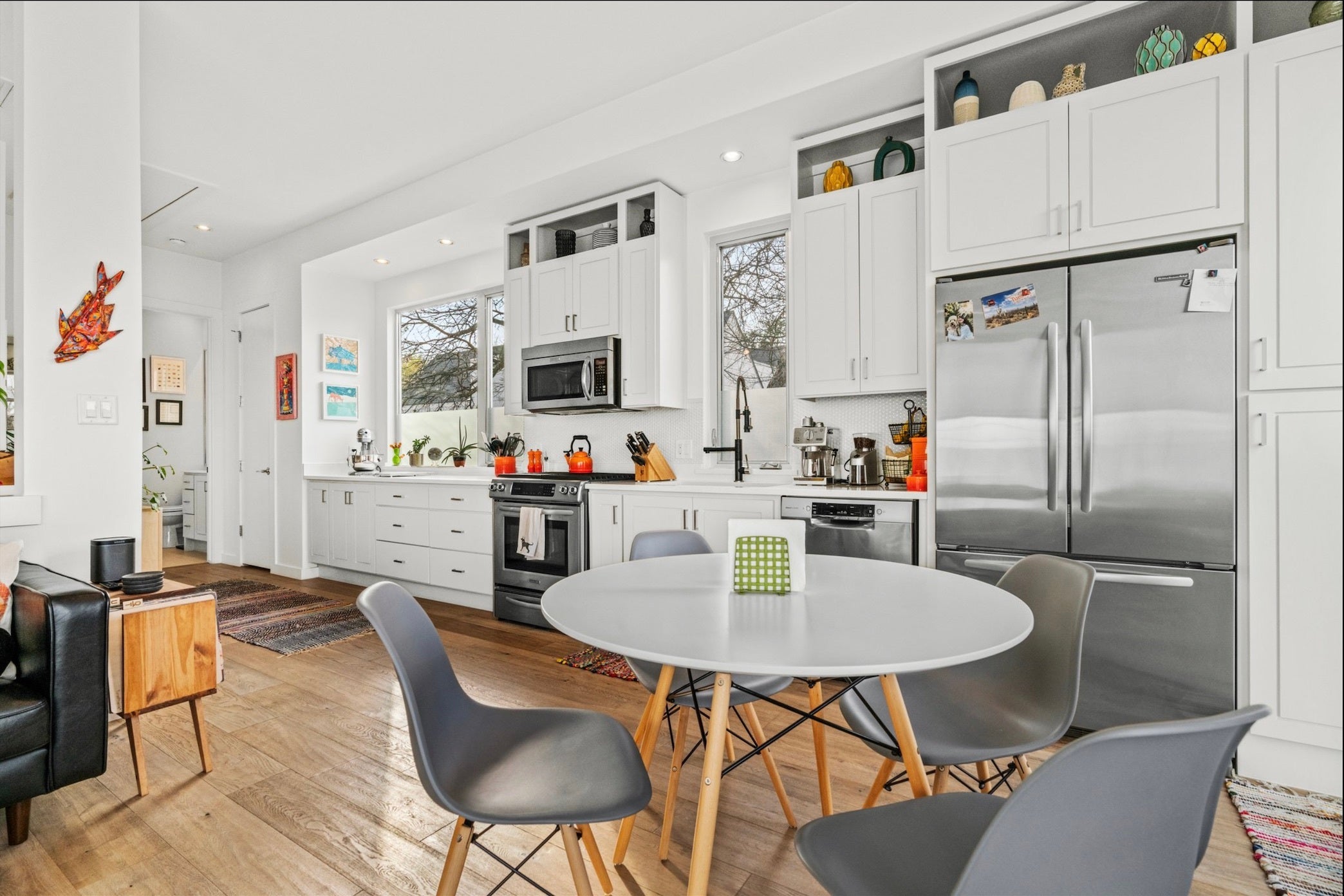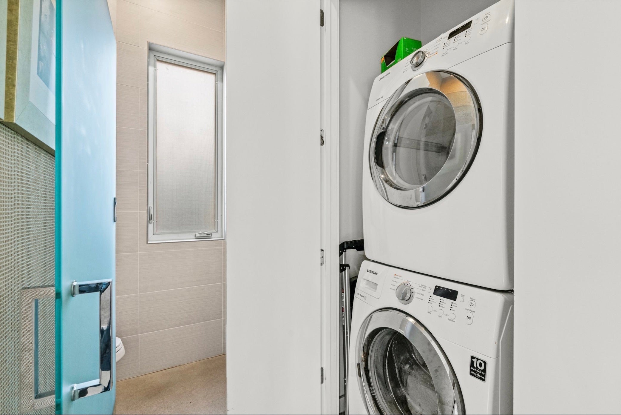 - Washer/Dryer Stacked, Dishwasher, Free-Standing Gas Range, Free-Standing Refrigerator, Disposal, Microwave, Oven, Stainless Steel Appliance(s), Bar Fridge