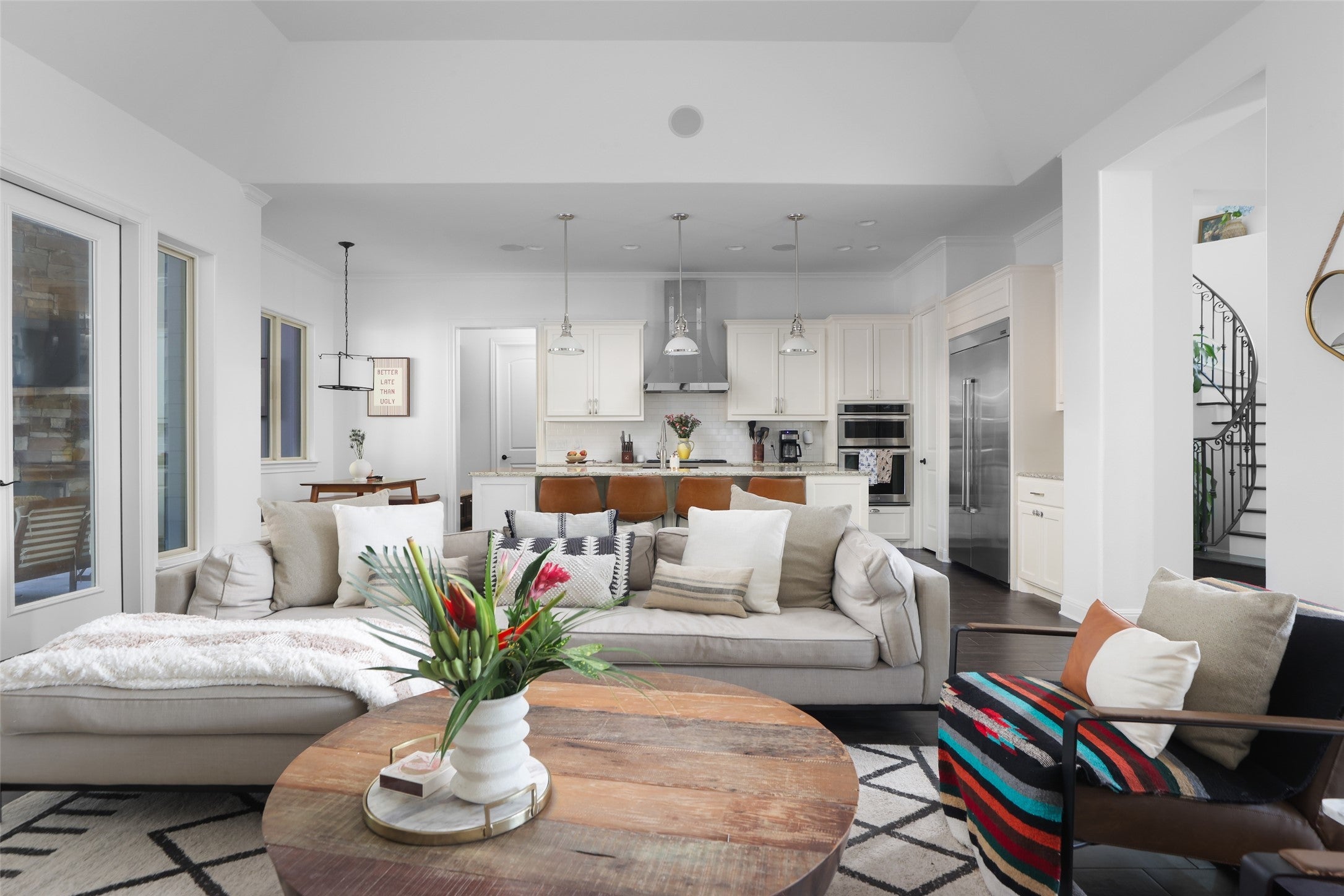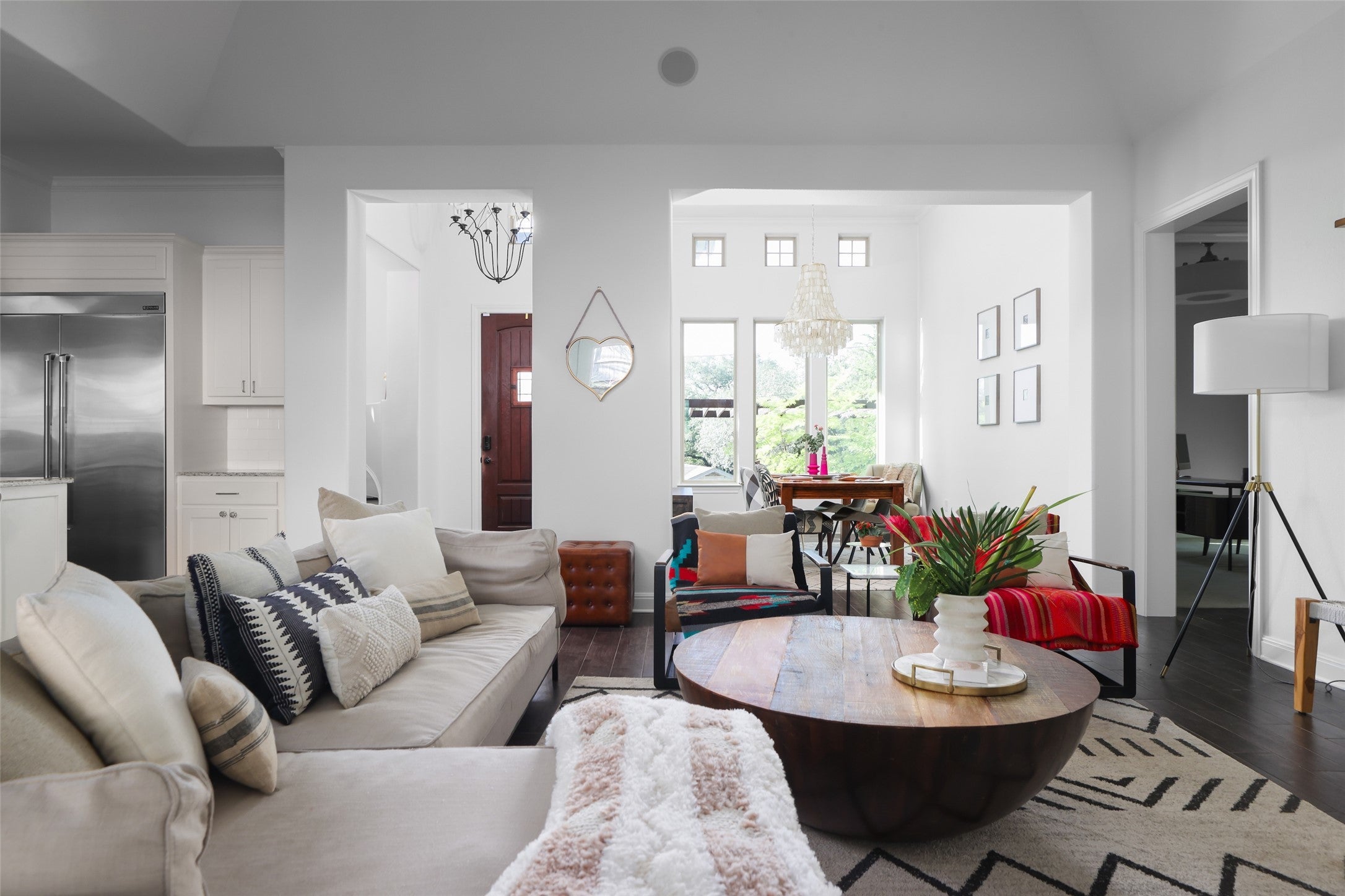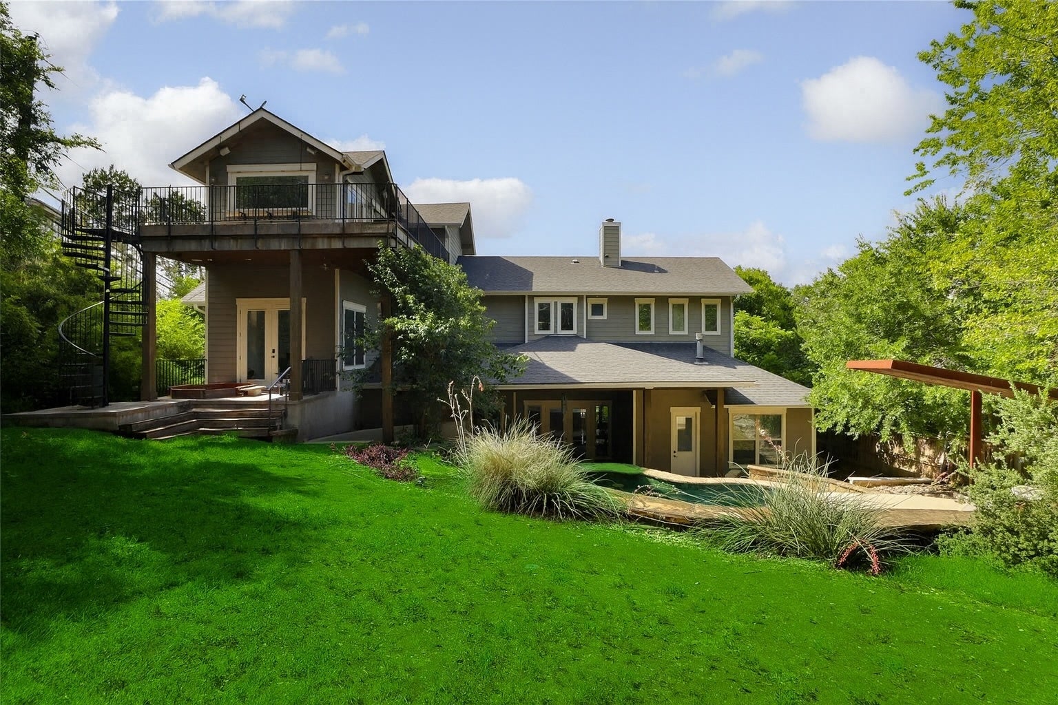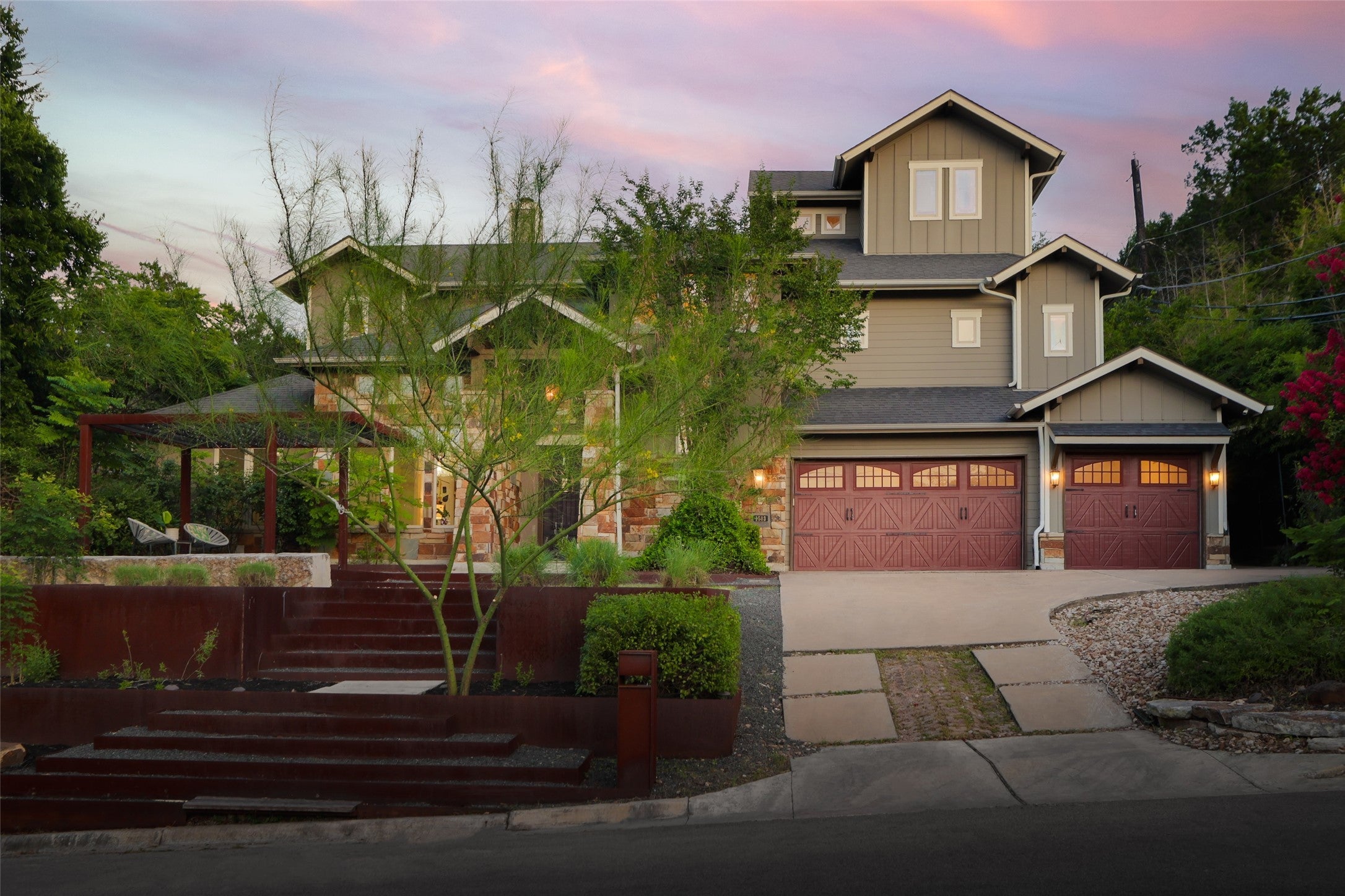Set on a .29-acre lot in desirable Barton Hills, this three-story custom residence offers refined living just minutes from Zilker Park and downtown Austin. Thoughtfully designed with five bedrooms and exceptional amenities, the home seamlessly blends luxury and function. The main level welcomes you with an open-concept chef’s kitchen featuring a Wolf range and high-end appliances, flowing into spacious living and dining areas. A private office and guest suite complete the first floor. Upstairs, the second level hosts the primary suite and two secondary bedrooms, along with a dedicated gym. The third floor is an entertainer’s dream, with a media room, indoor/outdoor bar, and lounge opening to an expansive deck with panoramic downtown views. Enjoy resort-style outdoor living with a pool, outdoor kitchen, and playscape. A rare three-car garage and advanced home automation system further elevate this remarkable property. Experience the best of 78704, with renowned restaurants, boutique shopping, and entertainment just a short walk away.