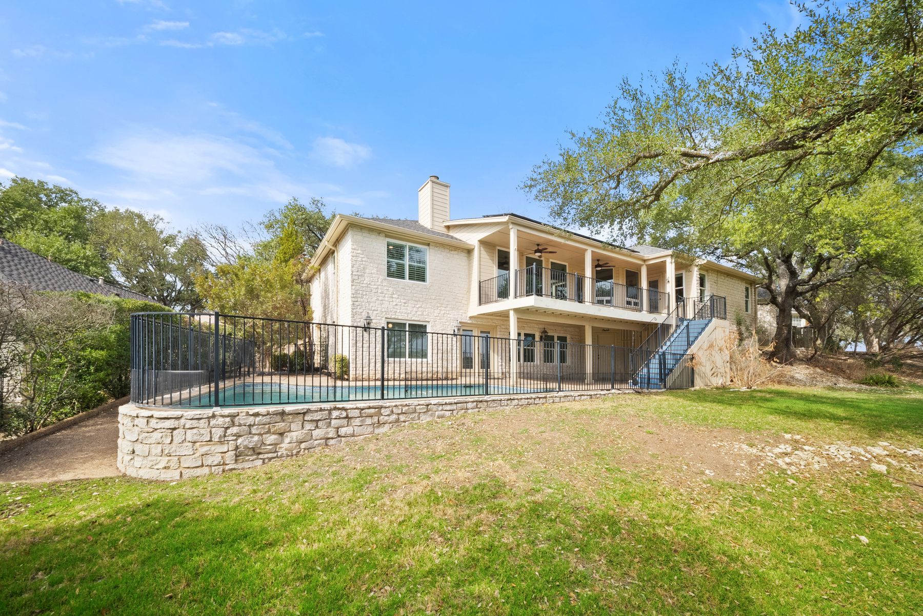 Discover the perfect blend of comfort, style, and Hill Country living at 112 Spellbrook in the heart of Lakeway. This beautifully maintained four-bedroom, three-and-a-half-bath golf course residence offers 3,229 square feet of thoughtfully designed living space filled with natural light and serene views. Step inside to find walls of windows that frame the lush surroundings and illuminate the open, inviting living areas. The main level features the majority of the home’s living space, including the spacious primary suite and two generously sized secondary bedrooms. The fourth bedroom doubles beautifully as an expansive study or library, providing flexibility for work or relaxation. The walkout lower level is ideal for guests, teenagers, or multigenerational living, complete with a private bedroom, full bath, and a large game room that opens directly to the backyard oasis. Outdoor living shines with a covered deck and patio overlooking the sparkling in-ground pool, creating the perfect backdrop for gatherings, morning coffee, or peaceful afternoons. The solar panels are transferable and offer approximately $37,000 in value, adding meaningful long-term efficiency and buyer appeal. Additional highlights include an oversized two-car garage, a dedicated golf cart garage, and abundant storage throughout. Perfectly positioned in one of Lakeway’s most desirable pockets, this home offers quick access to top-rated Lake Travis ISD schools, world-class golf courses, multiple marinas on Lake Travis, scenic hiking and biking trails, medical facilities, and a variety of dining and boutique shopping. Conveniently located near the Hill Country Galleria, H-E-B, and Whole Foods, the home provides the ideal blend of lifestyle, leisure, and everyday convenience.