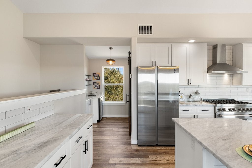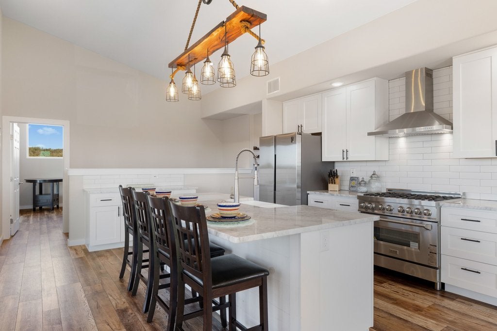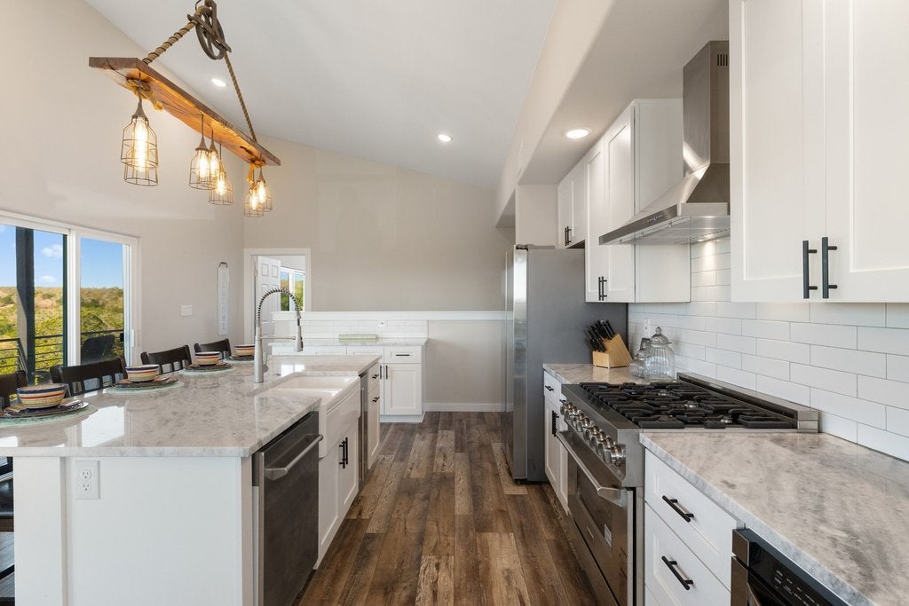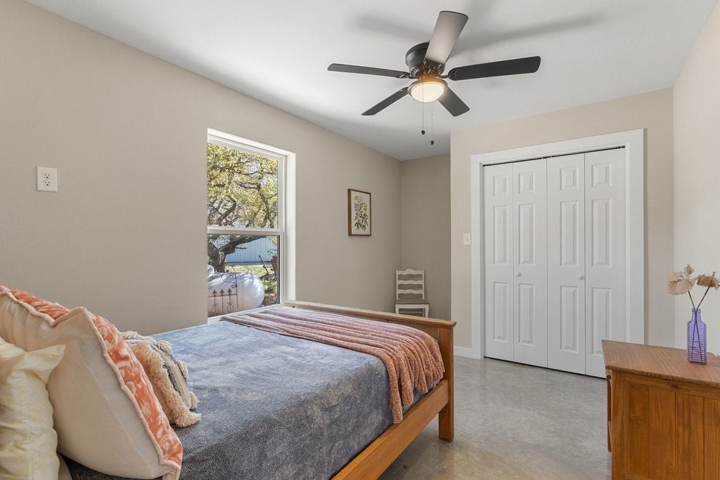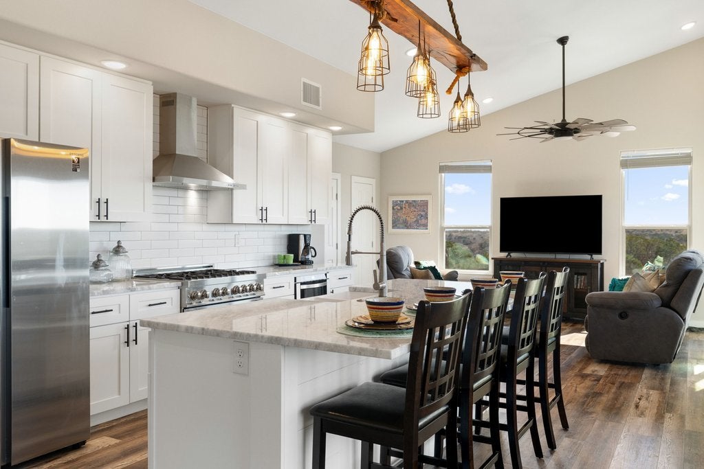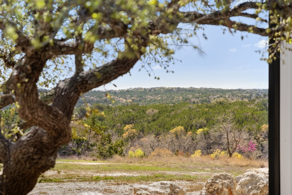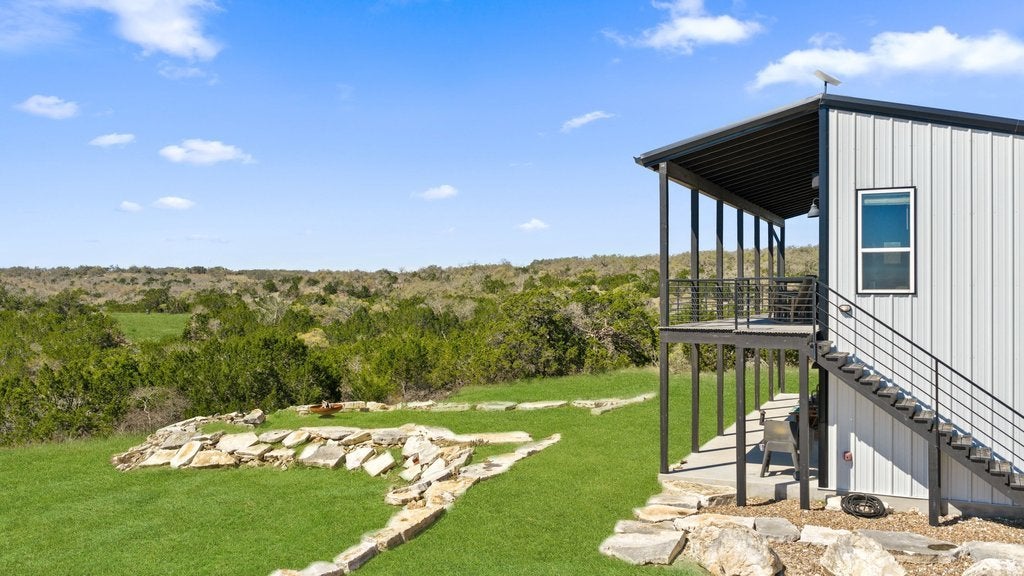 Tucked away at the end of the paved and private Delaware Creek Road, this stunning 53.94-acre Hill Country ranch offers sweeping views, abundant wildlife, and peaceful natural surroundings. A resurfaced caliche road leads to the thoughtfully positioned custom-built 2,020 sq. ft. metal home (built in 2020) featuring 5 bedrooms and 2.5 baths, designed with an open floor plan filled with natural light. Interior features include engineered wood flooring, granite countertops, soft-close cabinetry, Low-E windows, spray foam insulation, a tankless water heater, and a ZLINE range and oven, along with propane service and underground electric to the home. Outdoor living is highlighted by a 10' x 50' balcony with expansive Hill Country views, Trex decking, and an outdoor shower, perfect for enjoying the surrounding landscape. The land carries a wildlife exemption and includes a spring-fed pond, established hiking trails, and fencing on two sides. Additional improvements include a 30' x 40' shop with electricity, two 12' x 10' roll-up doors, and an RV hookup. Surrounded by large ranches. Light restrictions help preserve the integrity of the area while maintaining the privacy and beauty that make this Hill Country property an exceptional retreat or full-time residence. (No Subdividing, No commercial, No STR's)