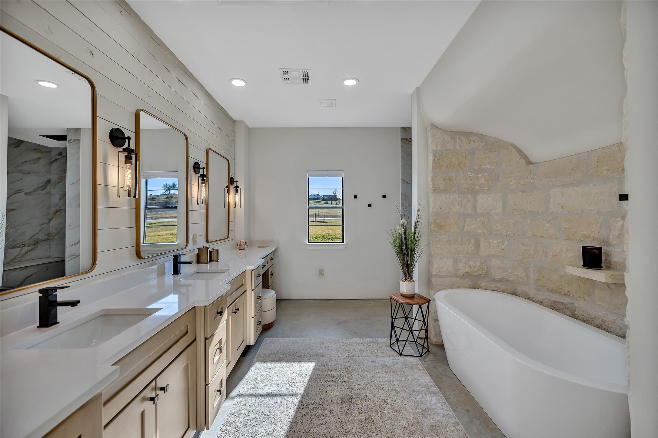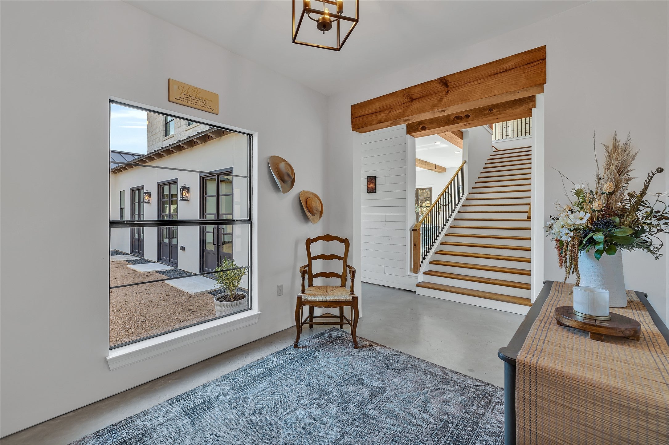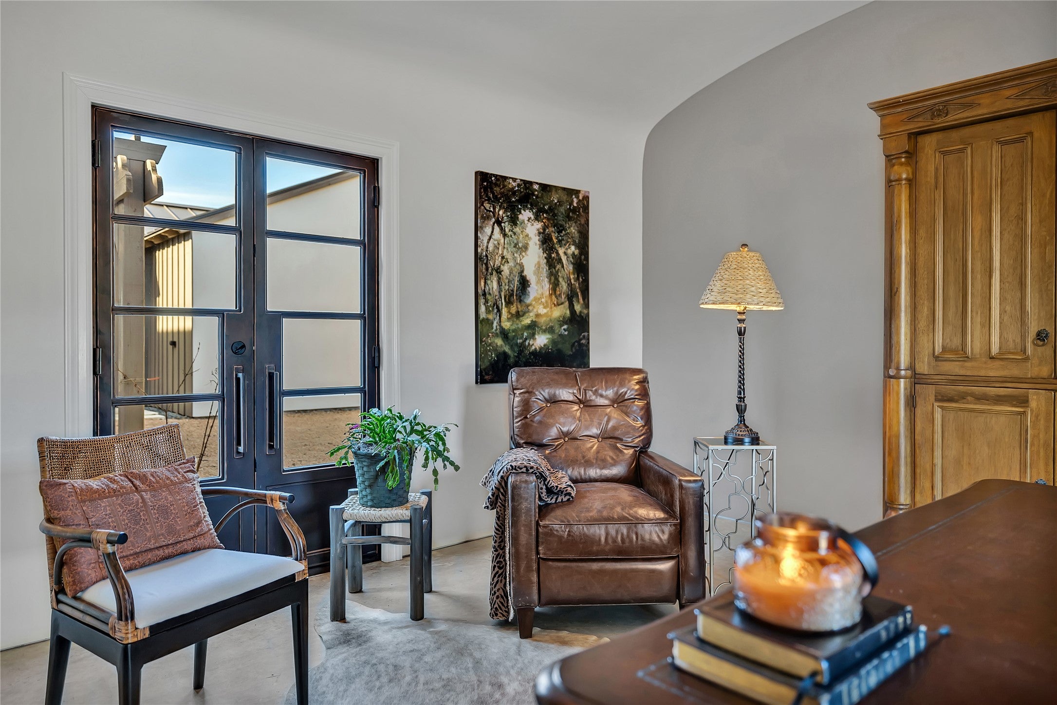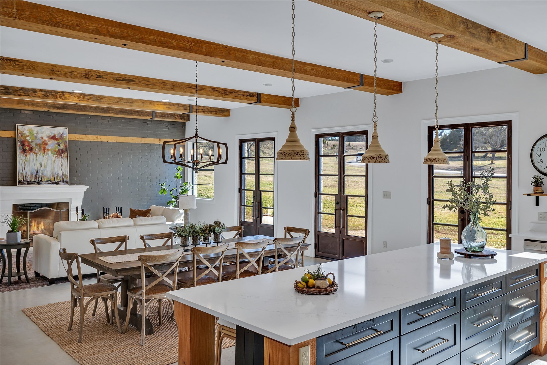 Set on 4.087 acres in the Texas Hill Country, this modern farmhouse offers luxury and comfort in a prime location near Fredericksburg, Comfort, and Kerrville. Thoughtfully designed, this two-story home features 4 bedrooms, 3.5 bathrooms, and elegant details throughout. Inside, heated floors, recessed mood lighting, and limestone walkways create an inviting atmosphere. The chef’s kitchen is equipped with high-end appliances, quartz and woodblock countertops, an 11-foot island, and a butler’s pantry, seamlessly connecting to the dining and living areas, where rustic beams, a brick accent wall, and a wood-burning fireplace add warmth and character. Expansive steel entry doors on both sides open to a picturesque yard, perfect for outdoor entertaining. The primary suite, privately located in the east wing, provides a peaceful retreat with arched ceilings, custom lighting, and a spa-like en suite featuring a freestanding tub, heated stone bench, dual vanity, and spacious dressing room. A private office adjacent to the suite is ideal for work or relaxation. Upstairs, three additional bedrooms, two full baths, and a bright family room with hardwood floors offer comfort and space for family or guests. Outside, a detached oversized garage provides room for two cars, a golf cart or ATV, and extra storage. A versatile 36x30 barn, currently used as a horse barn, can easily be adapted to suit different needs. With HOA approval for two large animals, the property is well-suited for horses or even Texas Longhorns. More than just a home, this is a Hill Country retreat, where luxury, tranquility, and thoughtful design come together in perfect harmony.