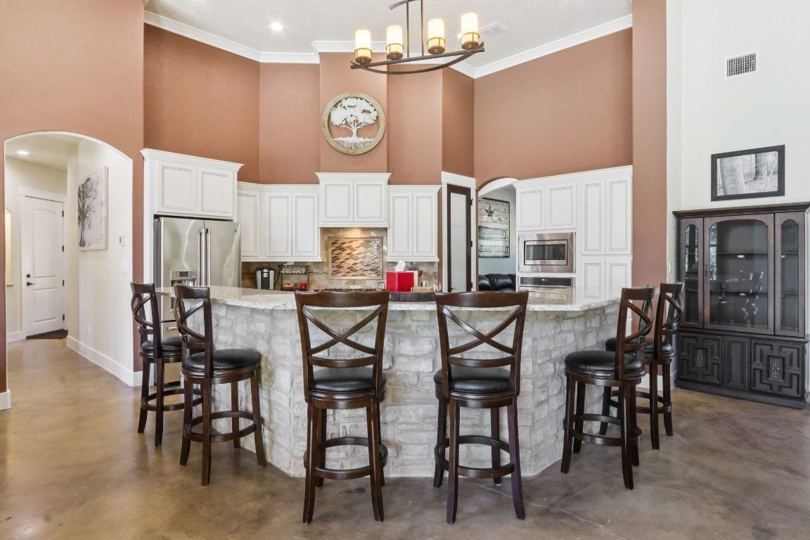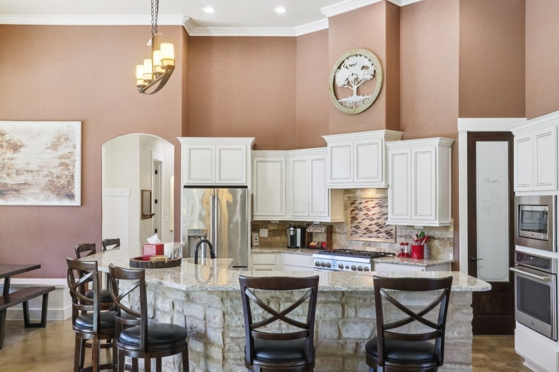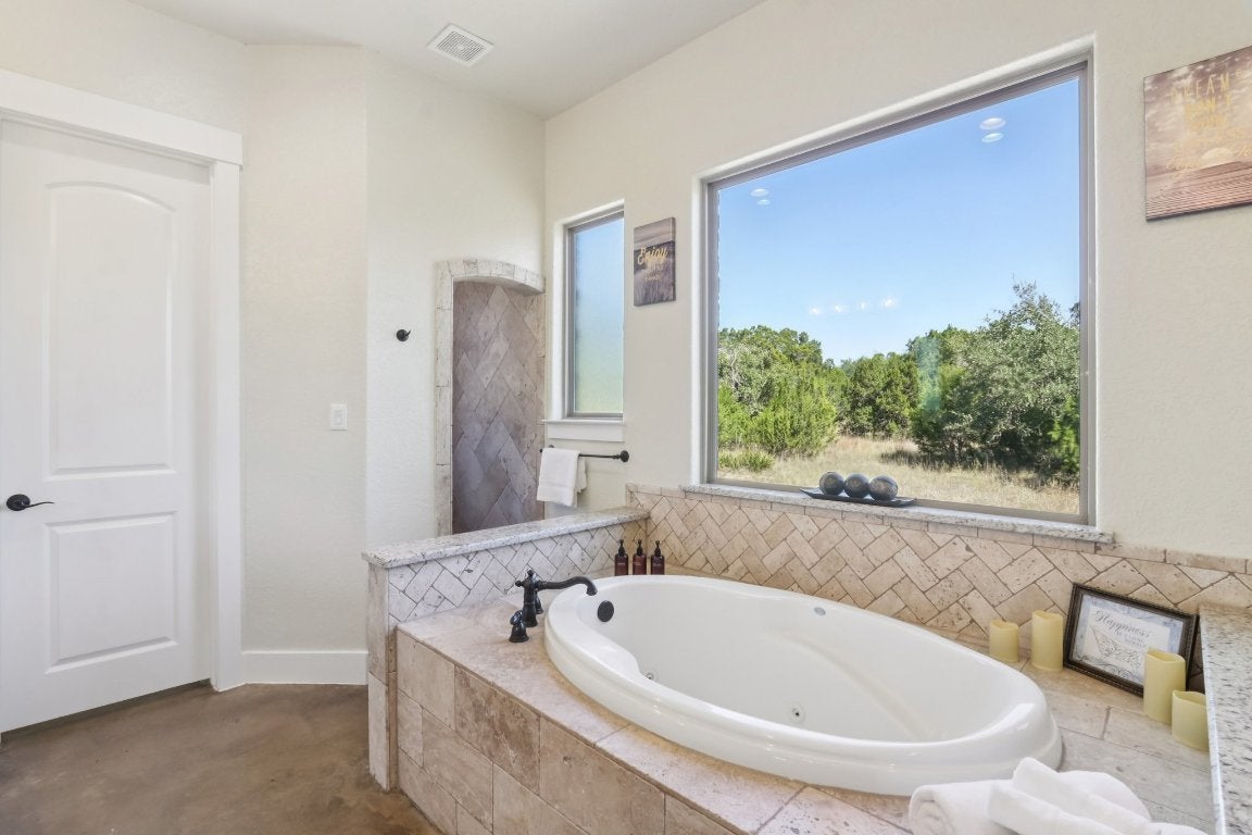Welcome to 1194 Vaquero Way, a private Hill Country retreat tucked within the desirable Mustang Valley community. Sitting on 5.56 acres, this stunning single-story home offers 4 bedrooms, 4.5 baths, and 3,290 square feet of thoughtfully designed living space — perfectly blending rustic charm with modern luxury. Inside, you’ll find soaring beamed ceilings, custom stone accents, and an open floor plan ideal for entertaining. The gourmet kitchen features double ovens, a gas range, stainless appliances, a large island, and breakfast bar, flowing seamlessly into the spacious living area anchored by a stone fireplace. The primary suite provides a serene retreat with spa-like bath, walk-in shower, sauna, double vanity, and walk-in closet. Additional highlights include 2 living areas, a wet bar, and built-in storage throughout. Step outside to your own resort-style oasis complete with a heated in-ground pool, spa, outdoor kitchen with gas grill, and fire pit— all overlooking the peaceful Hill Country landscape. The property is fully fenced with a gated entrance and offers ample parking, including a 4-car garage and RV access. Enjoy the privacy of acreage living while still being just minutes from downtown Wimberley and Dripping Springs. Served by Wimberley ISD, this home also benefits from agricultural and homestead exemptions for lower taxes. Whether you’re seeking a primary residence, vacation retreat, or income-producing STR, 1194 Vaquero Way delivers the best of Hill Country living in every detail.