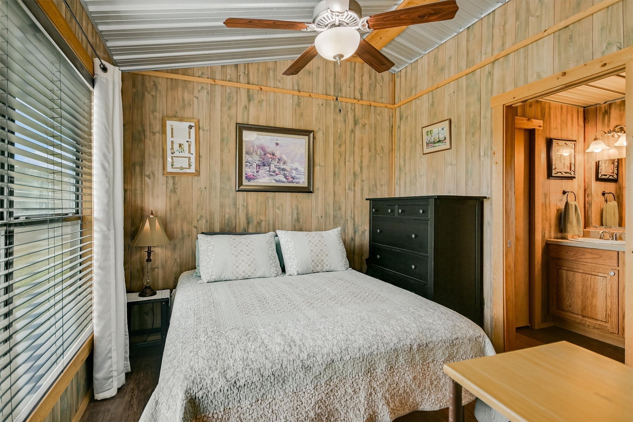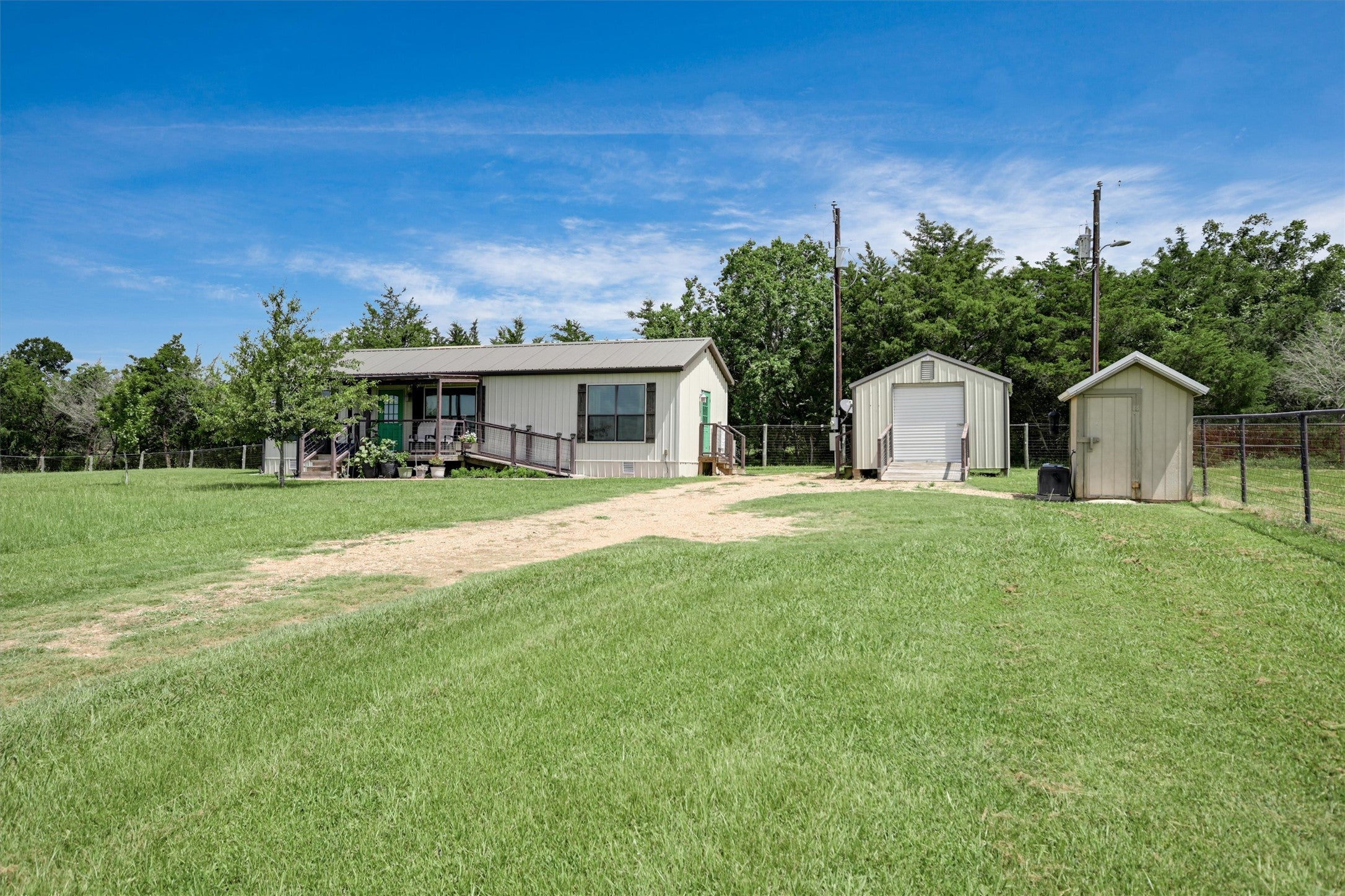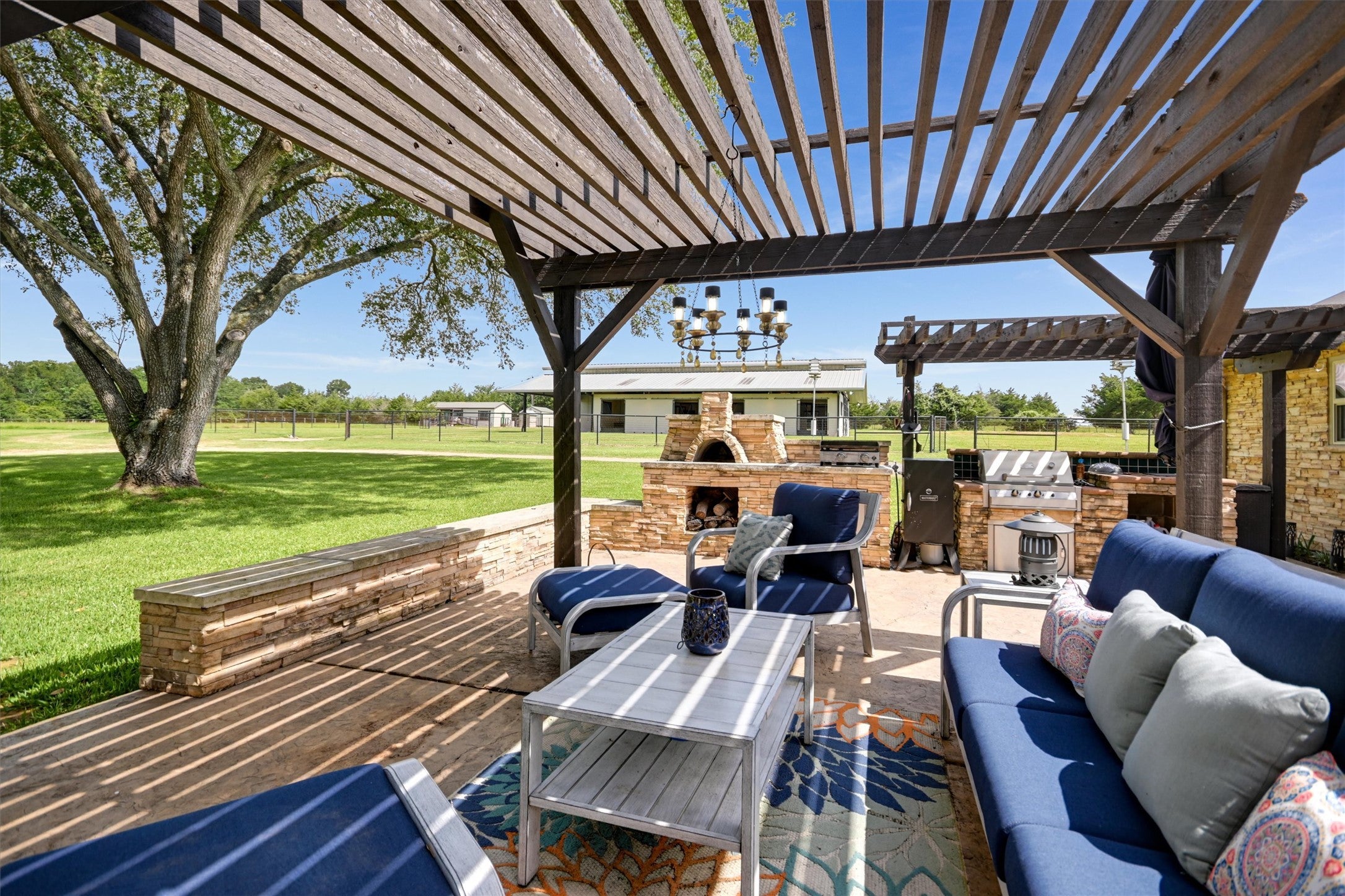 A private equestrian sanctuary in the heart of Texas wildflower country, Six Oak Ranch offers 7.89 serene acres tucked along a quiet lane in beautiful Brenham. At the center of the property is a custom-designed, DERBY-INSPIRED HORSE BARN crafted with reinforced concrete block, steel trusses, and 4-foot footings. It includes four premium horse stalls with custom Louisville-made metalwork, a wash bay with rubberized flooring and French drains, a tack room, full electricity, and exceptional lighting. A portion of the structure is built stormproof, with a concrete roof and hurricane-resistant glass surrounding the restroom, which features a walk-in shower. Exterior perks include drilled-pipe fencing and an RV hookup. The SINGLE-STORY PRIMARY RESIDENCE offers refined country elegance, with an open floor plan, a sunroom, a stone-accented fireplace with a black walnut mantel, and abundant natural light. The updated kitchen features Silestone counters, a farmhouse sink overlooking the backyard, under-cabinet lighting, and travertine flooring. The primary suite includes granite counters, dual sinks, an oversized spa-style shower with a seat, and a walk-in closet. Outdoor living shines with a large patio, hot tub, wood-fired pizza oven, stone fire pit, and three pergolas beneath mature live oaks. The acreage is divided into three corralled pastures—two with automatic water troughs and one with a shared well agreement—offering ample turnout space. A charming GUEST COTTAGE (THINK MULT-GEN OR B-AND-B OPPORTUNITY) PROVIDES 2-BEDROOMS, 2 BATHS, a full kitchen, a washer/dryer hookup, a covered porch, and a wheelchair ramp. An 80 by 40 WORKSHOP/GARAGE, automatic doors, an RV carport, an EV charger, and a CLIMATE-CONTROLLED, CEDAR-LINED STORAGE room. Modern utilities include three deep Jasper Aquifer wells, two anaerobic septic systems, separate Bluebonnet Electric meters, and high-speed Starlink internet. Please request the "Highlights and Features" PDF for more details.