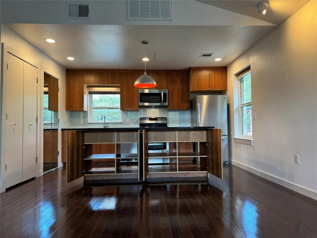 Welcome to your own private urban retreat — a striking architect-designed contemporary studio that blends modern style with everyday convenience in one of the city’s most walkable locations. Securely tucked behind a gated entrance with private stair access and an additional interior security system, this home offers both peace of mind and a true sense of privacy. Inside, natural light pours through the space, highlighting clean lines, smart design, and impressive storage solutions that make the studio feel open and inviting. The versatile Murphy bed maximizes functionality without sacrificing style, while the sleek, modern kitchen shines with granite countertops, stainless steel appliances, a dishwasher, generous cabinetry, and contemporary finishes perfect for cooking and entertaining. A full bath with shower/tub combo and private washer and dryer add comfort and convenience, while central air conditioning keeps the space cool year-round. Enjoy a dedicated driveway with alley access, secure bicycle storage, and a pet-friendly atmosphere that welcomes your four-legged companion. Just steps from cafes, boutiques, gyms, Target, Whole Foods, and more, with bike and scooter lanes offering effortless access to downtown and The University of Texas, this studio delivers the ultimate lock-and-leave lifestyle. Quiet, modern, and incredibly well located — this is city living done right.