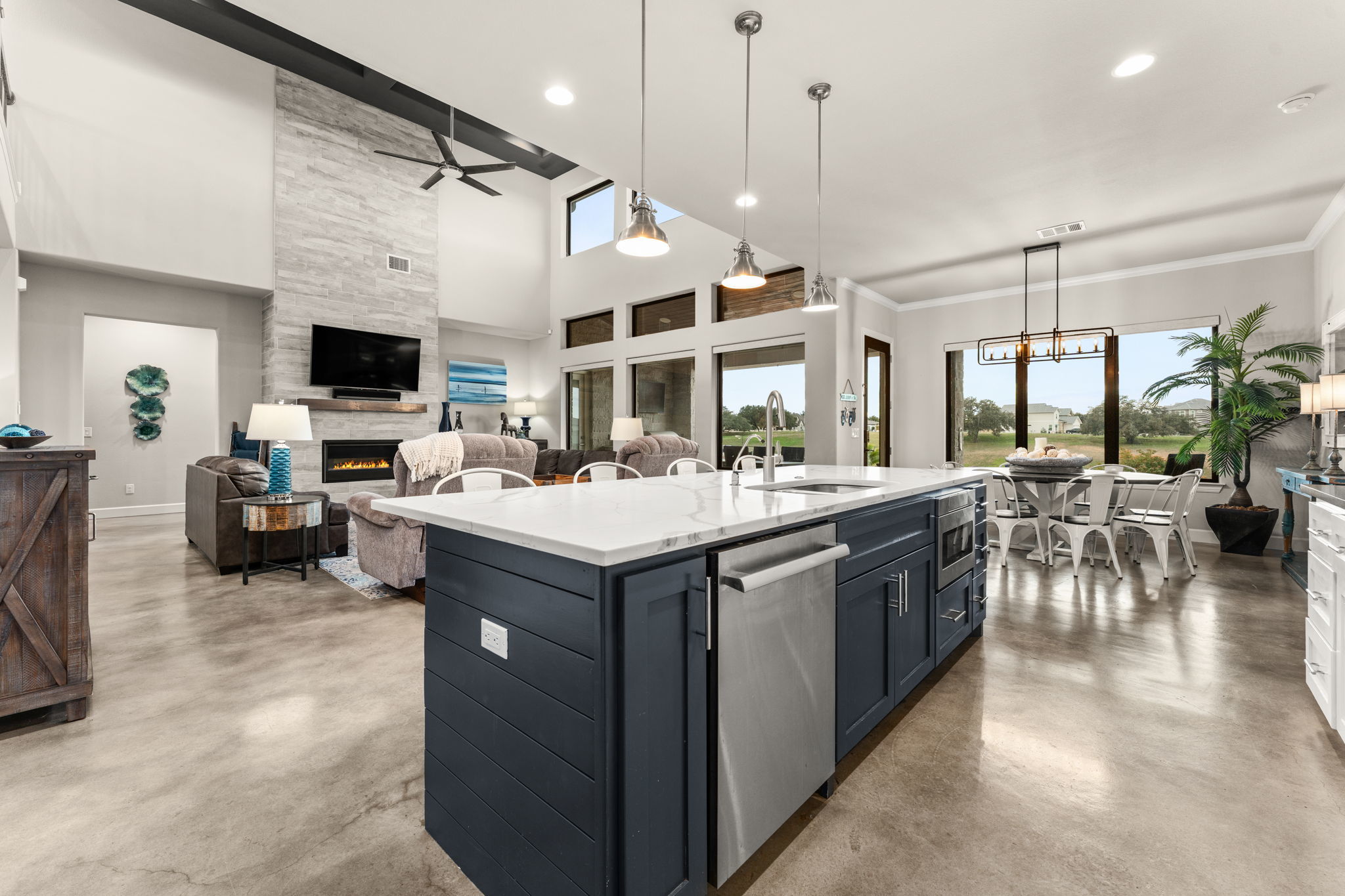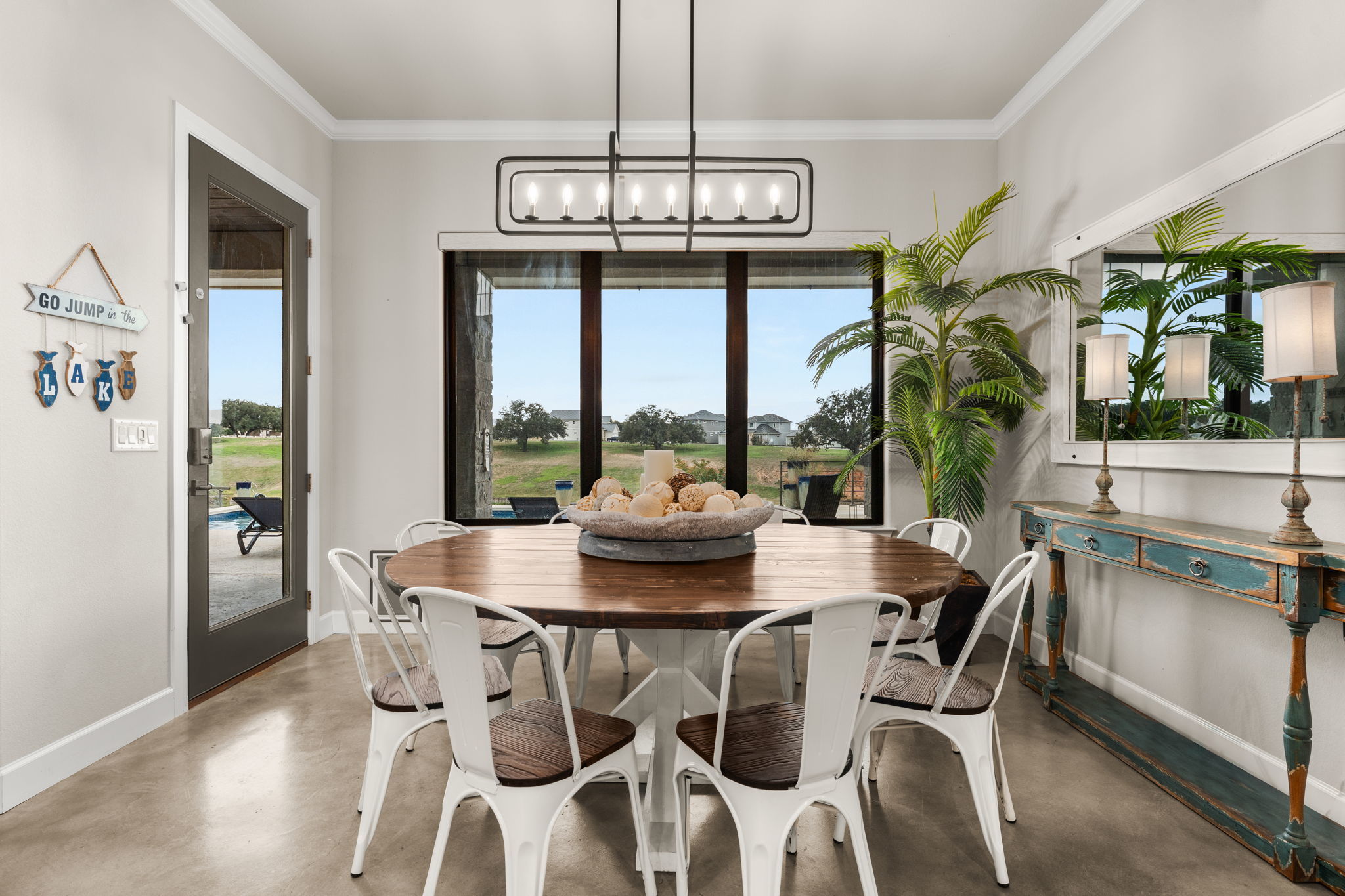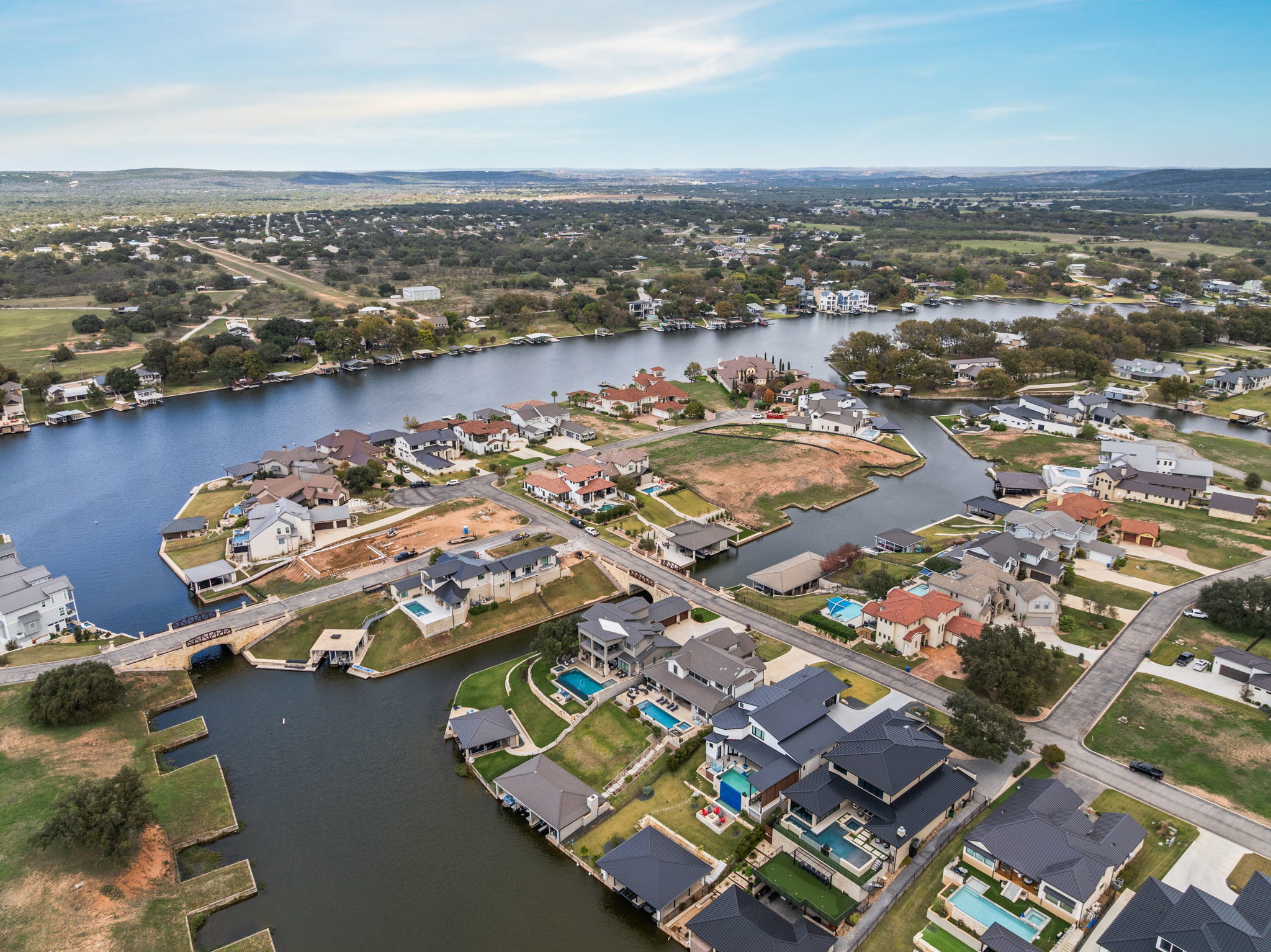 Stunning Turn-Key Luxury Waterfront Home in a Gated Community on Lake LBJ Fully furnished and ready to enjoy, this luxury lakefront retreat offers 6 bedrooms, 5.5 bathrooms, approx. 4,410 sq ft, a resort-style pool and spa, and an upgraded private boat dock. Designed for large groups and effortless entertaining, the home sleeps more than 24 guests with 16 total beds thoughtfully arranged throughout. The main level features an open floorplan with abundant natural light, a spacious dining area that flows into the kitchen and living room, and a kitchen with two large pantries, double ovens, and generous workspace. The primary suite includes a built-in work area, and two additional guest suites offer ensuite baths. Modern finishes and lake-inspired decor create an elevated and inviting setting. Upstairs offers an extra-large king room with built-in bunkbeds and a Jack and Jill bathroom with double vanities shared with a queen bedroom. An oversized bunk room with four bunks sleeps eight and connects by Jack and Jill bath to a spacious game room featuring a queen pull-out couch and a pool table, allowing the game room to serve as an additional bedroom if desired. Outdoor living includes a sparkling pool and spa, generous covered patios, and a highly upgraded private boat dock with a comfortable lounge area and fireplace, double JetSki lifts, and two boat slips with all-aluminum lifts and remotes. The home and the dock are equipped with an automatic bug control system for added comfort. Located in a calm, protected cove, the setting is ideal for paddleboarding, kayaking, floating, and effortless docking. A rare opportunity to own a fully furnished, turn-key luxury waterfront property in one of Lake LBJ’s most desirable gated communities. Buyer to independently verify all information.