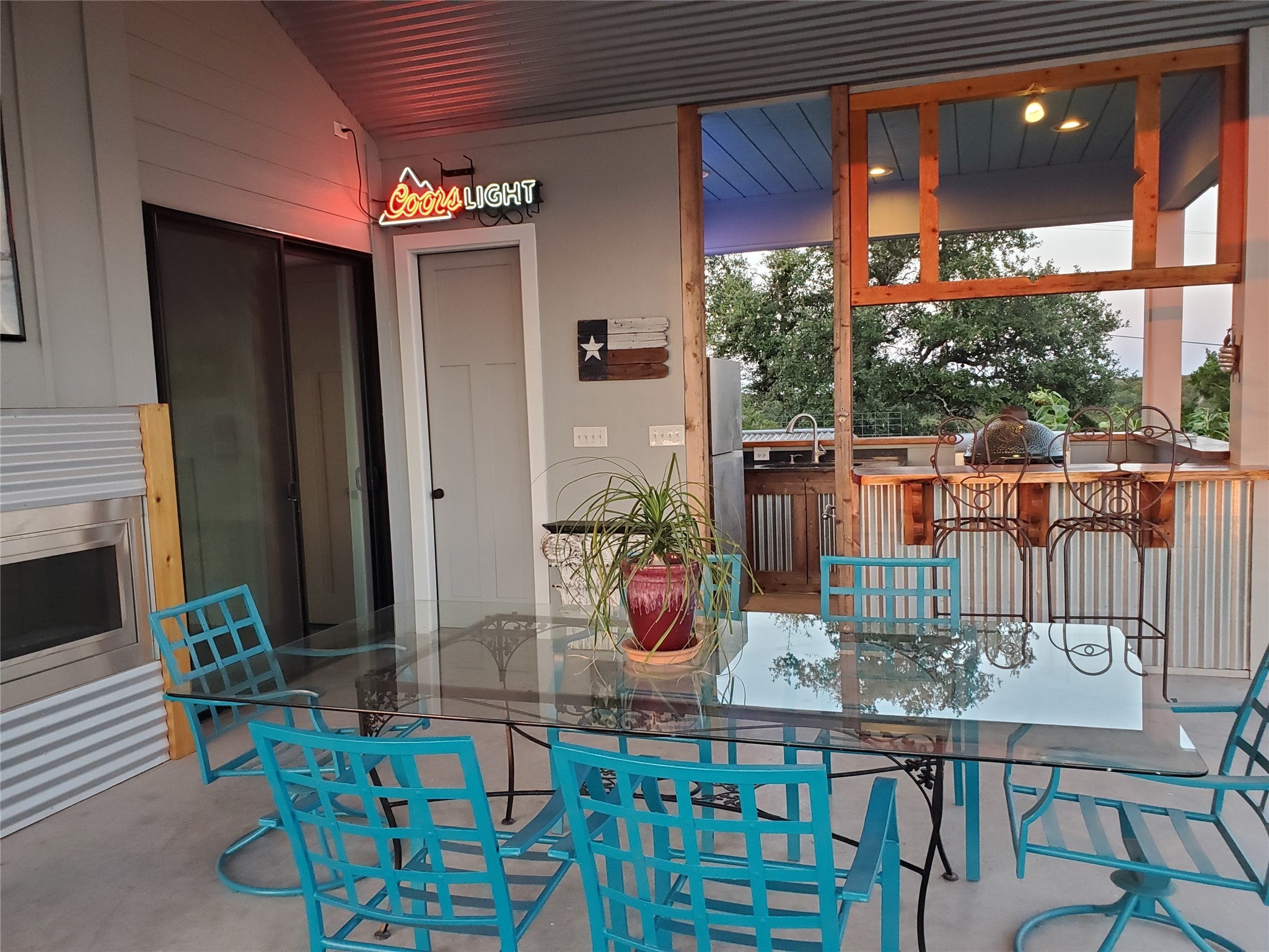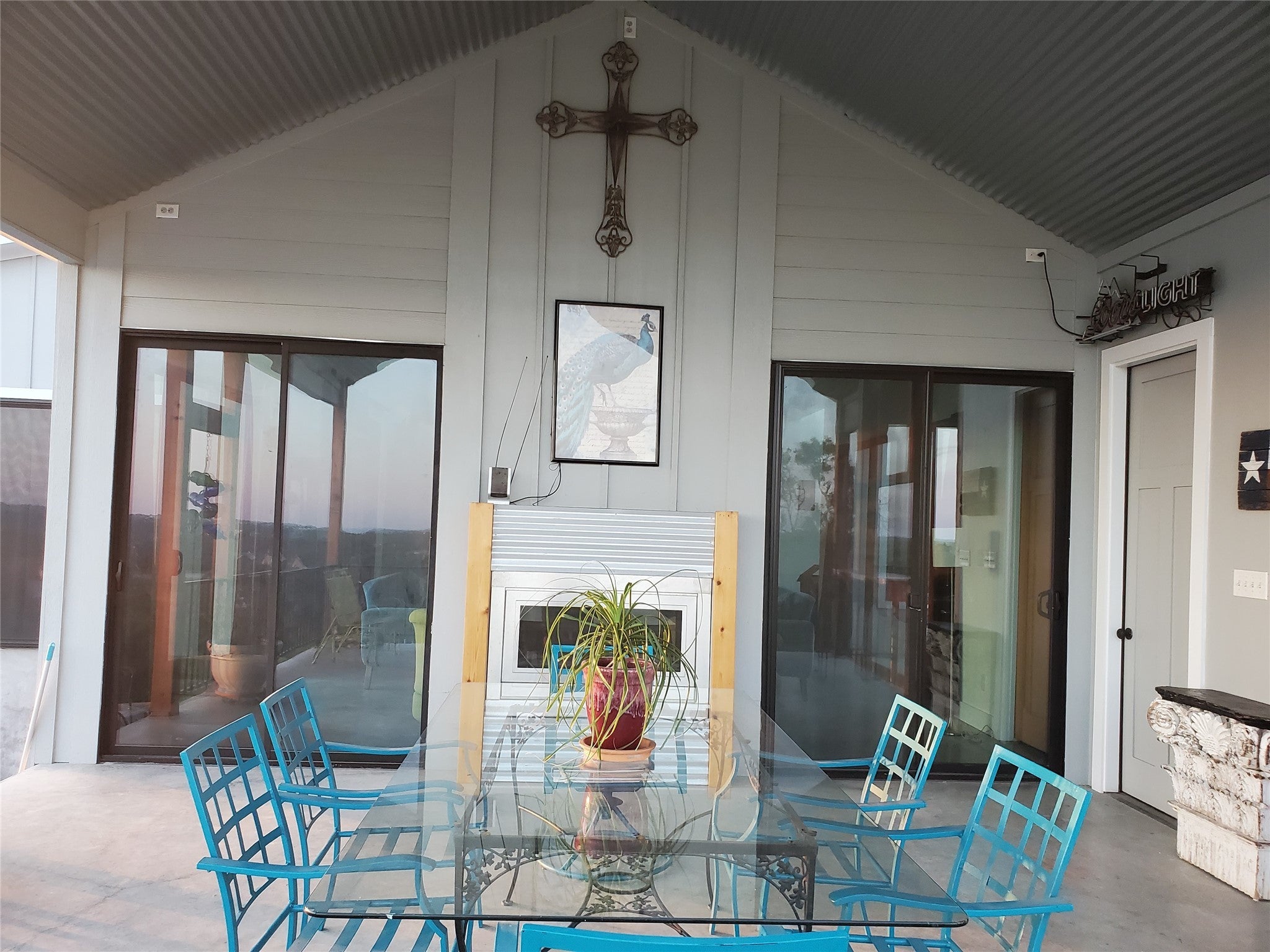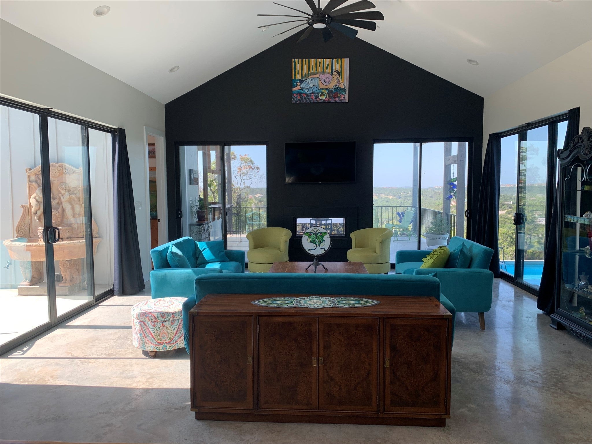 Truly panoramic views. Sunrises from the east facing patios and sunsets from the west back patio and deck. Large apx 20 x 24 covered vaulted ceiling patio with outdoor kitchen area and sink. Refrigerator and bar seating. Propane gas fireplace open to this patio and gathering/living room. View from large kitchen and dining areas in open concept area in home. Unique home has 2 primary bedrooms with spacious baths in seperate wings. One is accessible from adjacent living area, the other is in 2nd wing with 2nd large bedroom. 3rd bedroom with upstairs secret room, So cool! That wing is accesible thru media room and 3rd living area. That wing has a seperate entrance with ramp. The master in this wing has 9 ft wide patio doors open to back deck. This plan is ideal for multi-gen life style or large family with the one wing ideal private escape for parents. The bonus is both wings have their own laundries and study/offices. There are 10 ft walls and 8 ft tall patio doors all thru the house. Zoned into 3 seperate areas with their own heat pump A/C units. The exterior walls and ceilings are foam insulated. All ceilings are vaulted in the main house and in the 2nd residence. 2nd residence is being used as art studio. It has approximately 1,000 feet of the total footage listed and also has an upstairs large storage area. There is a fenced area behind privacy fence that has multiple raised garden beds. The large southfacing covered patio with vaulted ceiling has beautiful panoramic views that also catch the east sunrises and west sunsets. So much family living is available here in this tuly unique home.Want more land? Adjacent 2 lots: 2 acres 250,000 and 3.8 acres 350,000. Beautiful sunsets, sunrises and priced right. The main house is aproximately 4429 HAVAC. The 2nd house is, currently used as studio is aproximately 1390 HVAC. Travis county combines the total footage and it is confusing.