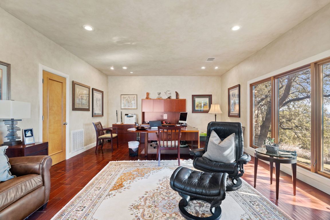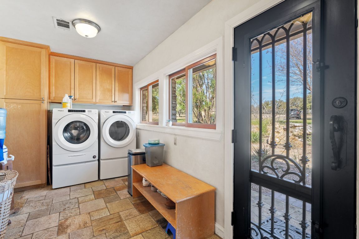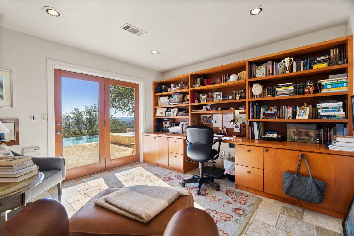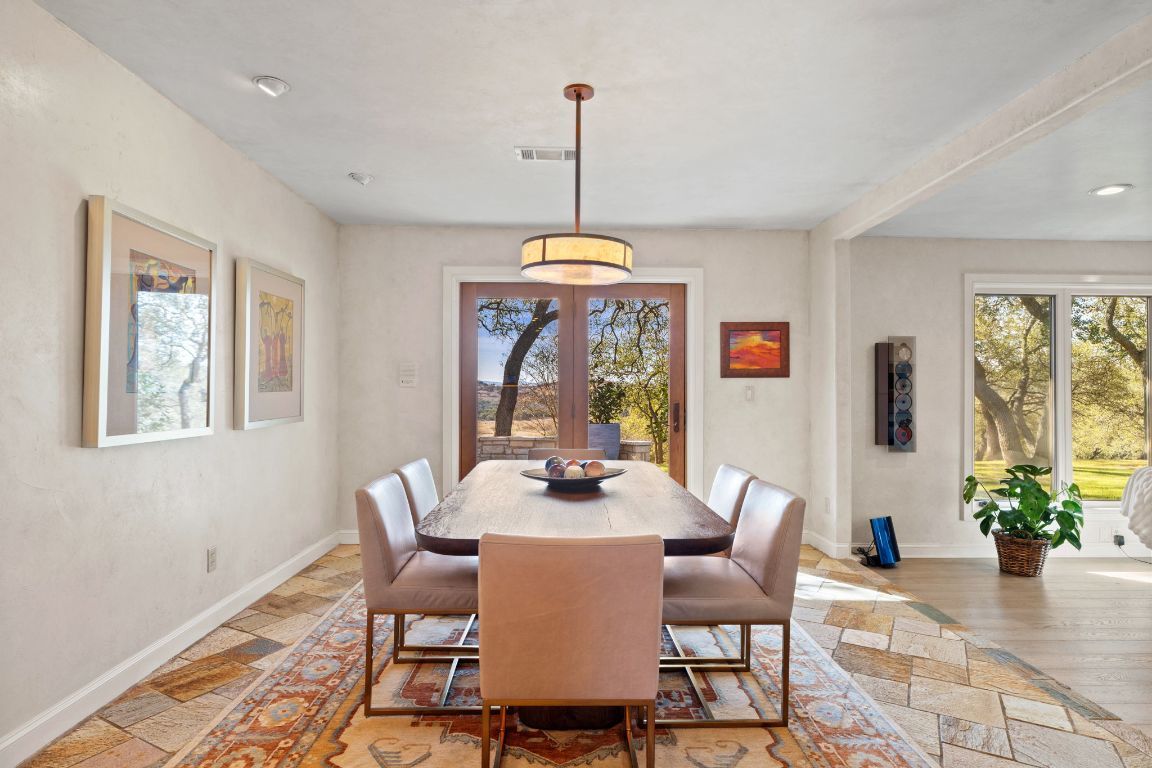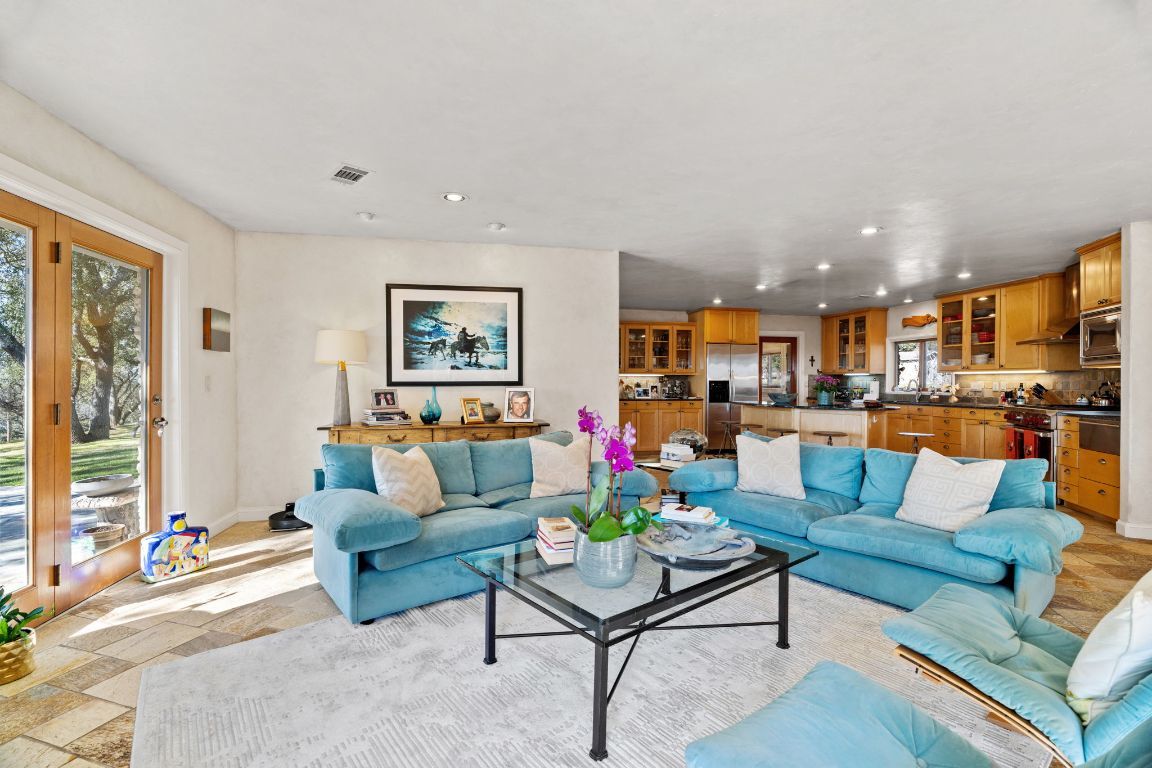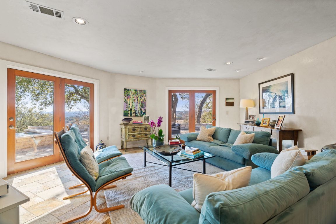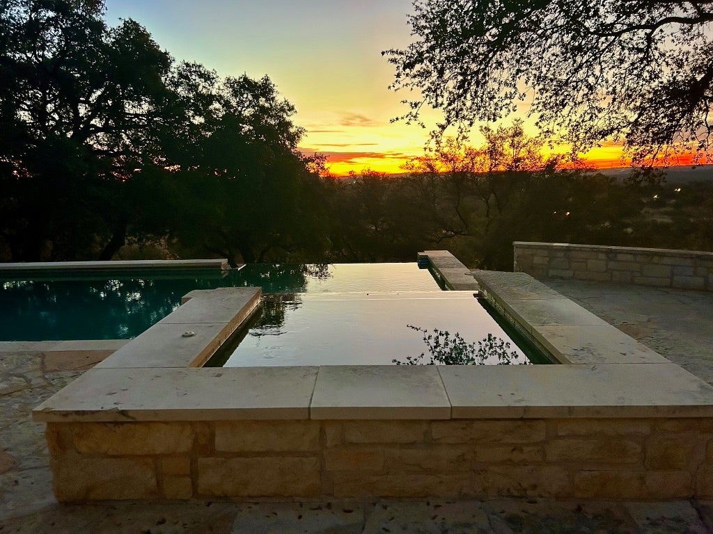 Perched atop a scenic hill, this exceptional property offers a tranquil retreat with breathtaking horizon views and a wealth of amenities. The main residence features 3 bedrooms and 2 bathrooms, while a separate 2-bedroom, 1-bath guest suite includes an office and gym. An equipment barn with an attached chicken coop is located near the main residence. Outdoor living is elevated with an infinity-edge pool, lush gardens, stocked fishing ponds, hiking trails, and cross-fencing for livestock. Located only 23 miles west of downtown Austin and unrestricted for development, Spicewood Retreat not only captivates with its aesthetic appeal but also presents an appealing investment prospect. The rolling terrain has been mostly cleared of juniper trees and is covered with live oaks, red oaks, hackberry and many other desirable hardwoods. Deer and other wildlife frequent the property daily and use the water troughs provided for this purpose. The paved road features a gated stone entry and winds uphill through the oaks to the main residence. Ready for its next steward, this property embodies the perfect blend of natural beauty, luxury, and potential.