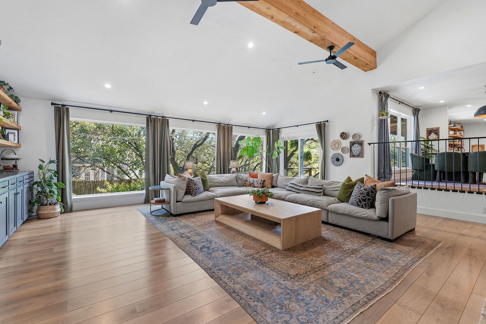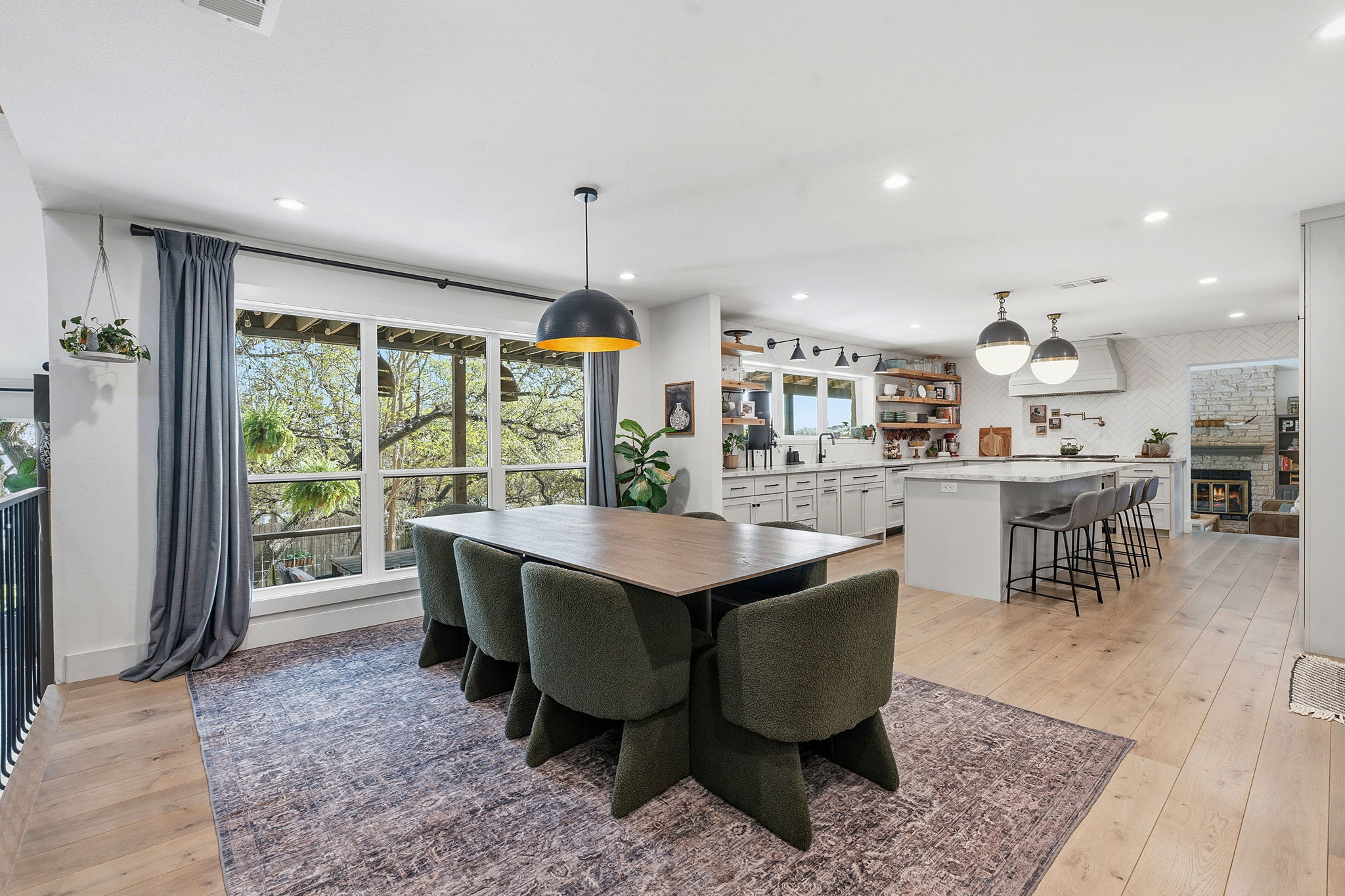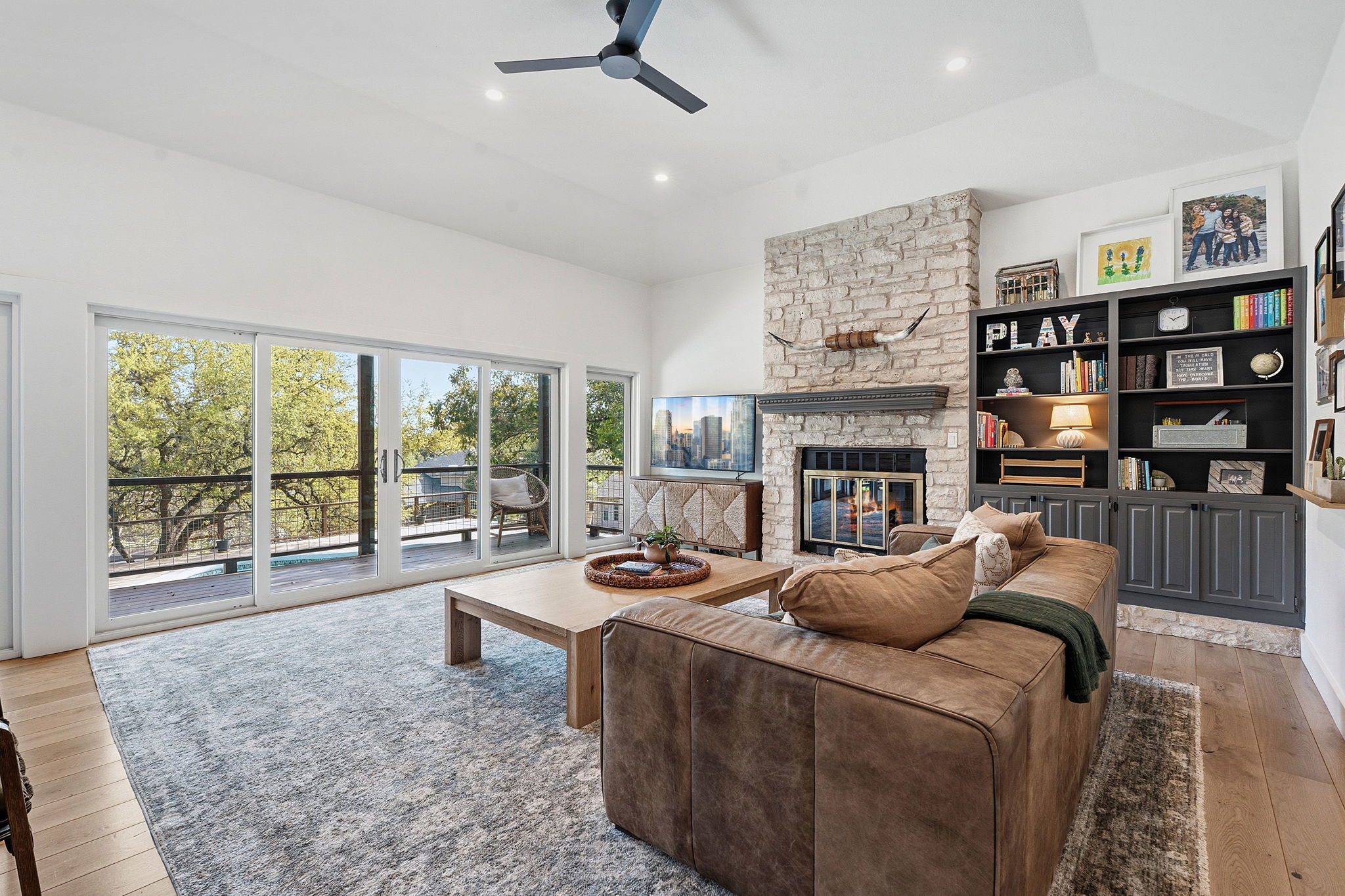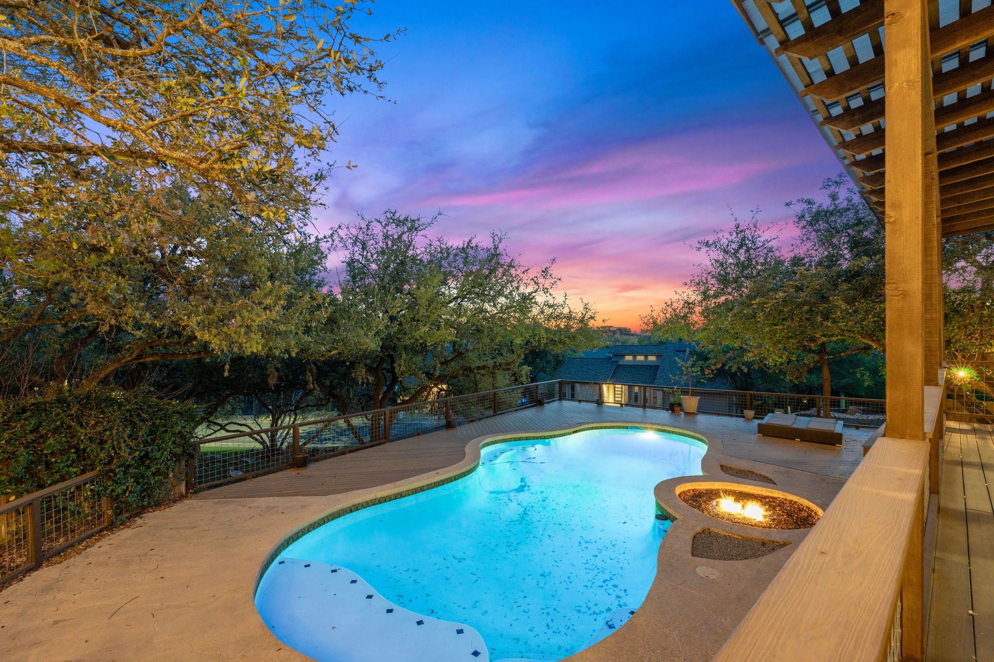 Discover unparalleled sophistication at 5907 Ivy Hills Dr in the coveted Great Hills golf community—moments from prestigious Great Hills Country Club in Northwest Austin. This 3,569 sq ft residence was fully remodeled by acclaimed design-build firm Thirty 7 Degrees, converting the mid-century layout into a seamless open-concept masterpiece with exceptional sightlines and curated luxury finishes. Set on a prime low-traffic corner lot with mature trees, fresh landscaping, and panoramic golf course/Hill Country sunset views from Trex decks and poolside patio. Features include energy-efficient tile roof, lifetime vinyl windows, and custom iron front door opening to a soaring vestibule with dramatic stacked stone accent wall. Main level offers a refined office with built-ins, two secondary bedrooms sharing an updated bath, and grand family room with beamed ceilings, wall of windows, oversized stacked stone fireplace, and wide-plank white oak floors. Dining flows into the chef’s kitchen with bespoke cabinetry, Fisher & Paykel French Door fridge, dual dish drawers, 48" Dacor dual-fuel range with dual ovens, Brizo pot filler, custom hood, Dekton counters, oversized island (seats 5) under Thomas O'Brien pendants, and more. A second retreat features sliding doors to pool views, cozy fireplace, built-ins, plus third bedroom with en-suite bath. Upstairs primary suite includes dual walk-in closets with barn doors, private covered deck for sunset views, and spa bath with frameless walk-in shower (bench), dual vanity, Brizo fixtures, and 67" soaking tub. Outdoors: extra-deep pool under mature oaks, gas firepit, string lights, re-sodded side yard with chicken coop (3 hens), raised garden bed, and play space. Zoned for top-rated Hill Elementary, Murchison Middle, and Anderson High. Enjoy nearby club golf, tennis, pickleball, and poolside living. The ultimate blend of luxury, location, and lifestyle—schedule your private showing today. Welcome home!