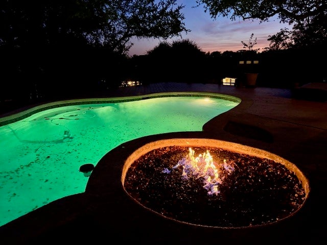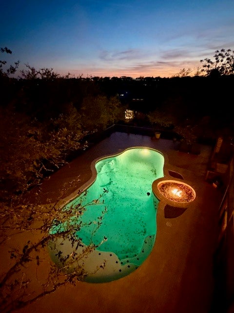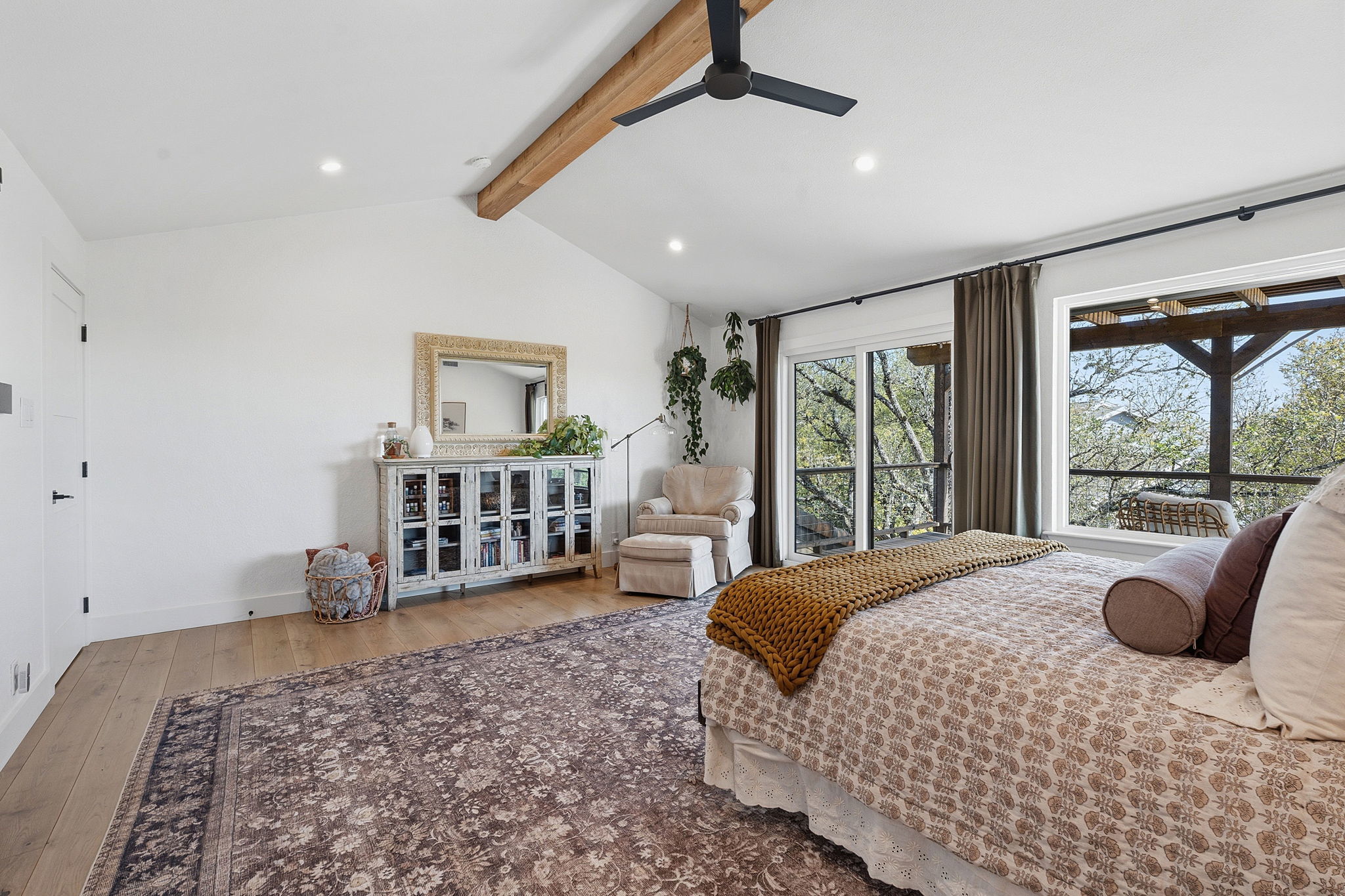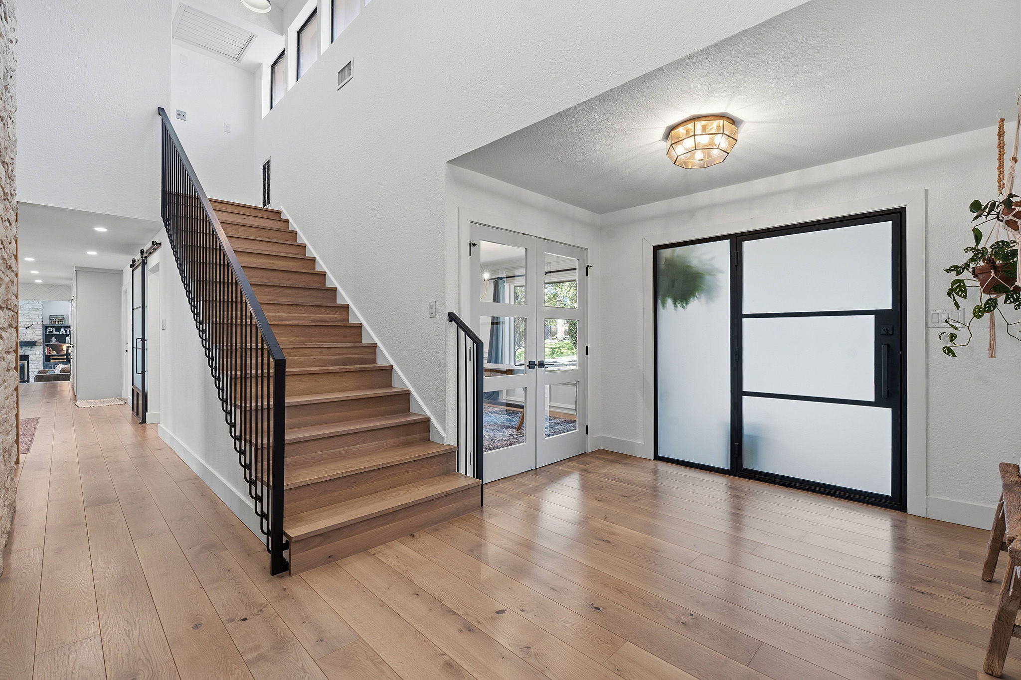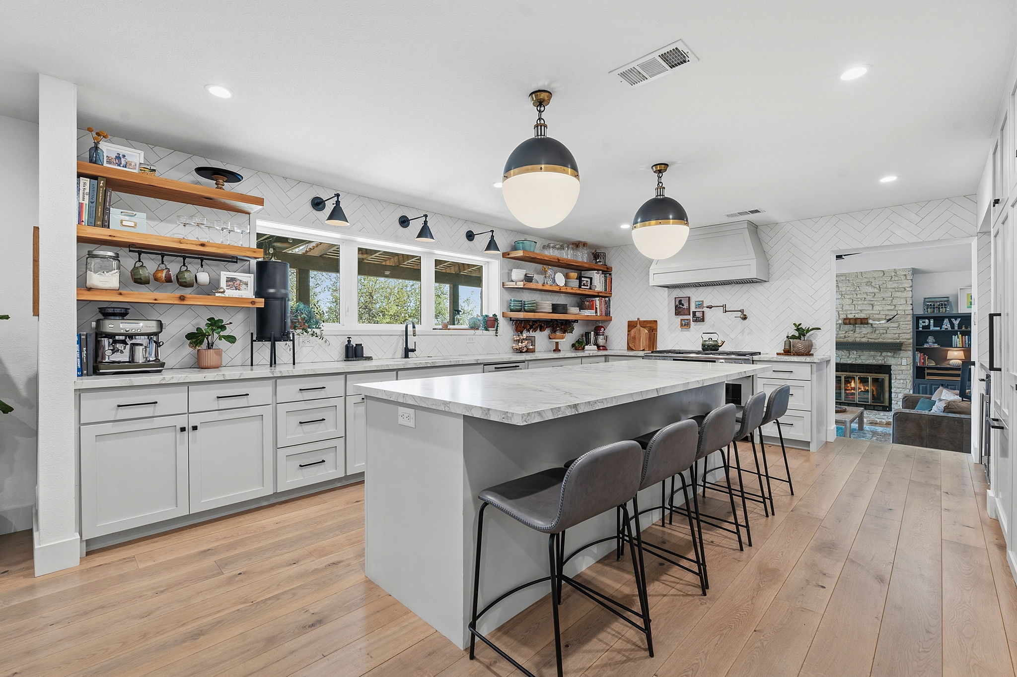 Discover unparalleled sophistication at 5907 Ivy Hills Dr in the coveted Great Hills golf community—moments from prestigious Great Hills Country Club in Northwest Austin. This 3,569 sq ft residence was fully remodeled by acclaimed design-build firm Thirty 7 Degrees, converting the mid-century layout into a seamless open-concept masterpiece with exceptional sightlines and curated luxury finishes. Set on a prime low-traffic corner lot with mature trees, fresh landscaping, and panoramic golf course/Hill Country sunset views from Trex decks and poolside patio. Features include energy-efficient tile roof, lifetime vinyl windows, and custom iron front door opening to a soaring vestibule with dramatic stacked stone accent wall. Main level offers a refined office with built-ins, two secondary bedrooms sharing an updated bath, and grand family room with beamed ceilings, wall of windows, oversized stacked stone fireplace, and wide-plank white oak floors. Dining flows into the chef’s kitchen with bespoke cabinetry, Fisher & Paykel French Door fridge, dual dish drawers, 48" Dacor dual-fuel range with dual ovens, Brizo pot filler, custom hood, Dekton counters, oversized island (seats 5) under Thomas O'Brien pendants, and more. A second retreat features sliding doors to pool views, cozy fireplace, built-ins, plus third bedroom with en-suite bath. Upstairs primary suite includes dual walk-in closets with barn doors, private covered deck for sunset views, and spa bath with frameless walk-in shower (bench), dual vanity, Brizo fixtures, and 67" soaking tub. Outdoors: extra-deep pool under mature oaks, gas firepit, string lights, re-sodded side yard with chicken coop (3 hens), raised garden bed, and play space. Zoned for top-rated Hill Elementary, Murchison Middle, and Anderson High. Enjoy nearby club golf, tennis, pickleball, and poolside living. The ultimate blend of luxury, location, and lifestyle—schedule your private showing today. Welcome home!