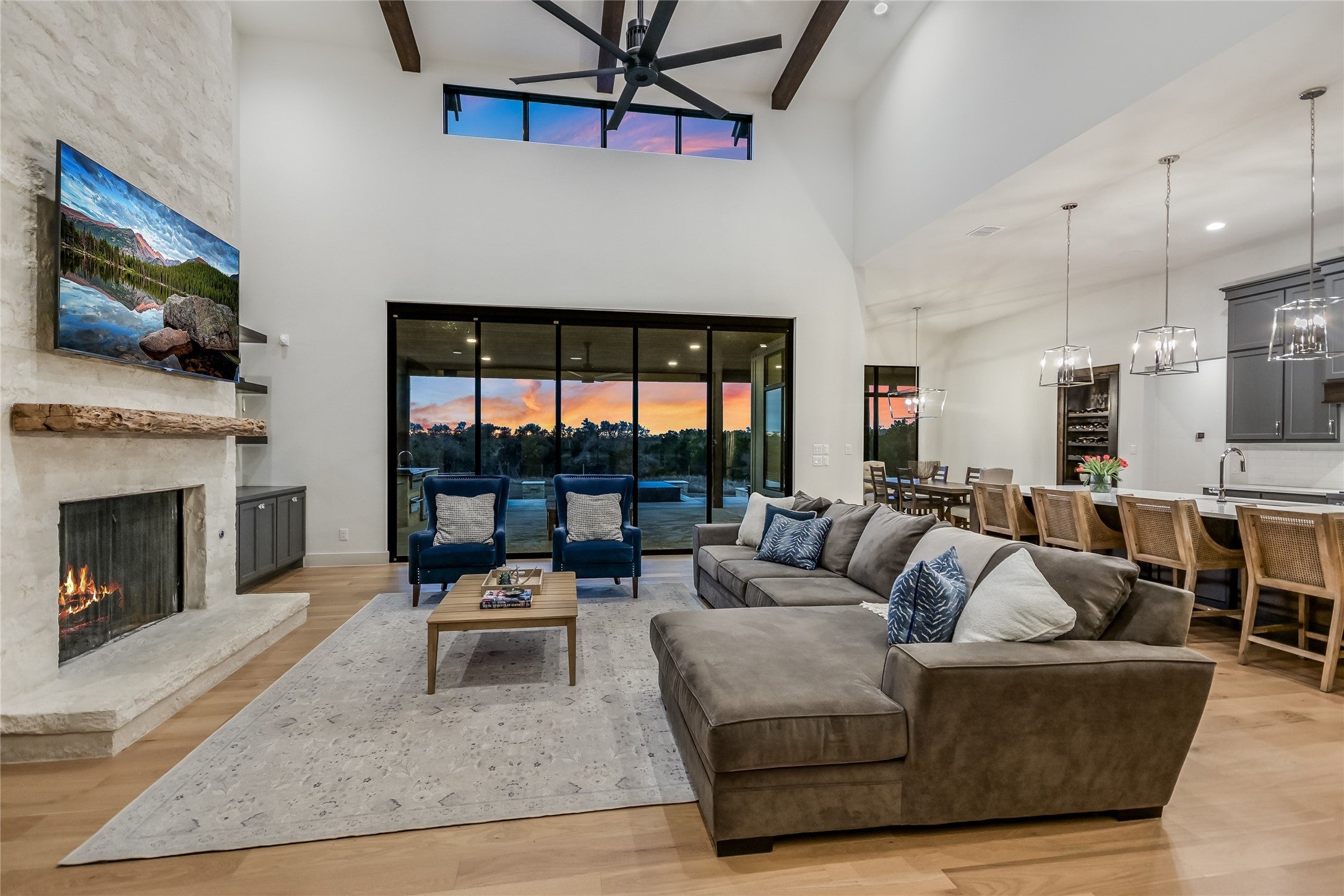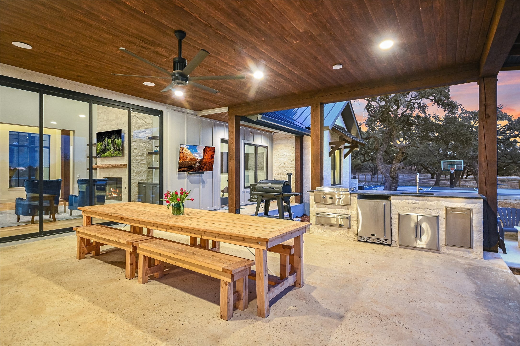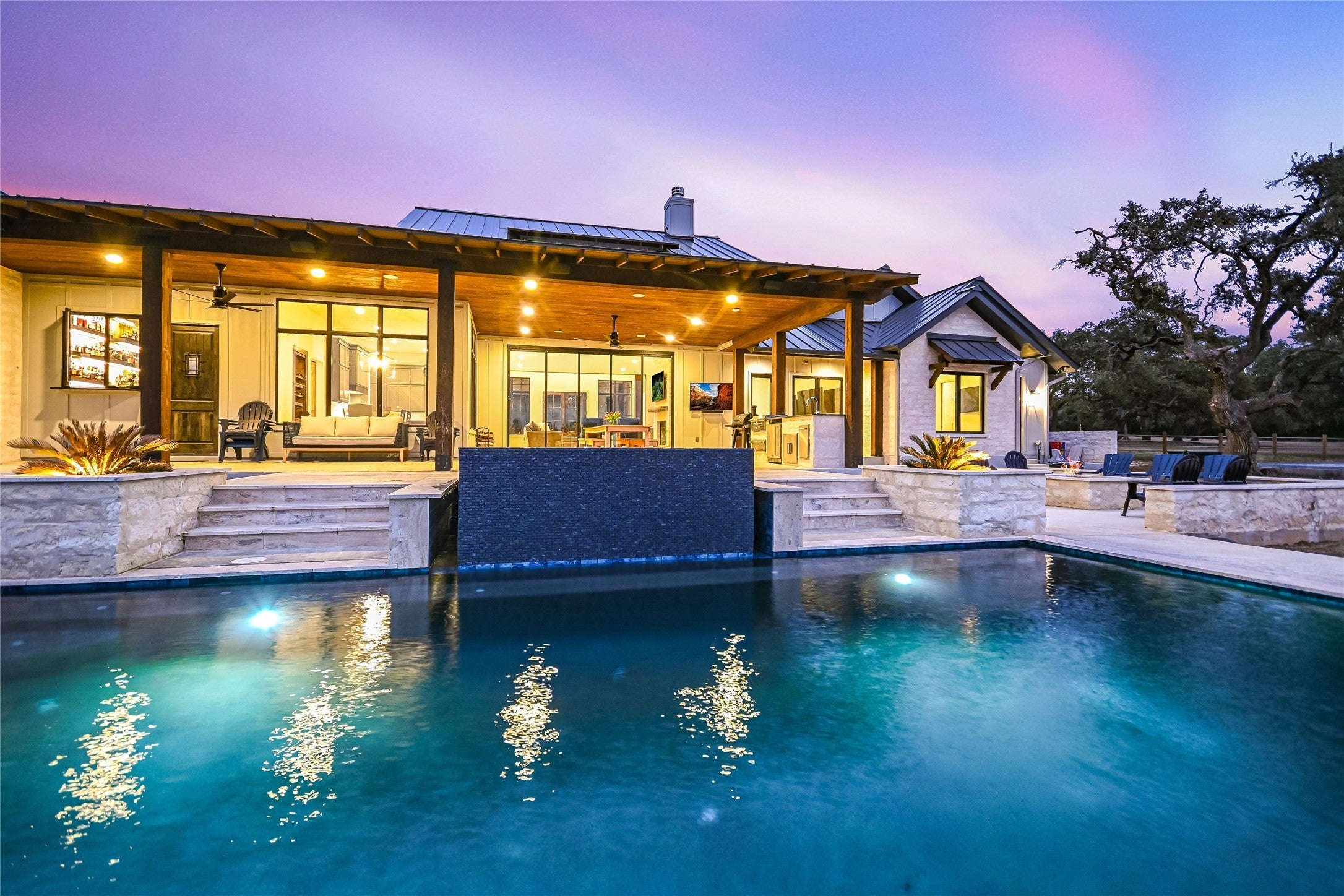 Nestled within the exclusive gated community of Hunter’s Ridge, this stunning one-story estate sits on over 12 acres in the heart of Wimberley, home of the Wimberley Texans. Offering 4,494 sq. ft. of thoughtfully designed living space, this 4-bedroom, 3.5-bathroom home is a true Hill Country retreat, blending luxury with comfort in every detail. Step inside, and you’re immediately welcomed by soaring ceilings, rich wood floors, and an open-concept layout bathed in natural light. The spacious living area centers around a floor-to-ceiling stone fireplace, perfect for cozy gatherings. Just beyond, the chef’s kitchen is both stylish and functional, boasting high-end stainless steel appliances, quartz countertops, an oversized island, custom cabinetry, and a generous walk-in pantry. The primary suite is a private haven, complete with a spa-like ensuite featuring a soaking tub, walk-in shower, and dual vanities. A massive walk-in closet provides ample storage. Three additional bedrooms offer comfortable accommodations, each with unique charm. This home is built for both entertainment and practicality. A dedicated media room promises cinematic experiences, while a hidden speakeasy adds a touch of old-school sophistication. The home gym is perfect for wellness enthusiasts, and an oversized mudroom with built-in storage helps keep daily life organized. A secondary laundry closet adds extra convenience. Step outside to your personal paradise, where a heated pool and hot tub invite relaxation. A sport court is ready for friendly competition, and the outdoor grilling station makes hosting effortless. Custom outdoor lighting enhances the ambiance as the sun sets over the Hill Country. Additional features include a whole-home reverse osmosis system and an oversized three-car garage. Located minutes from downtown Wimberley and top-rated Wimberley ISD schools, this exceptional estate offers the perfect blend of tranquility and convenience.