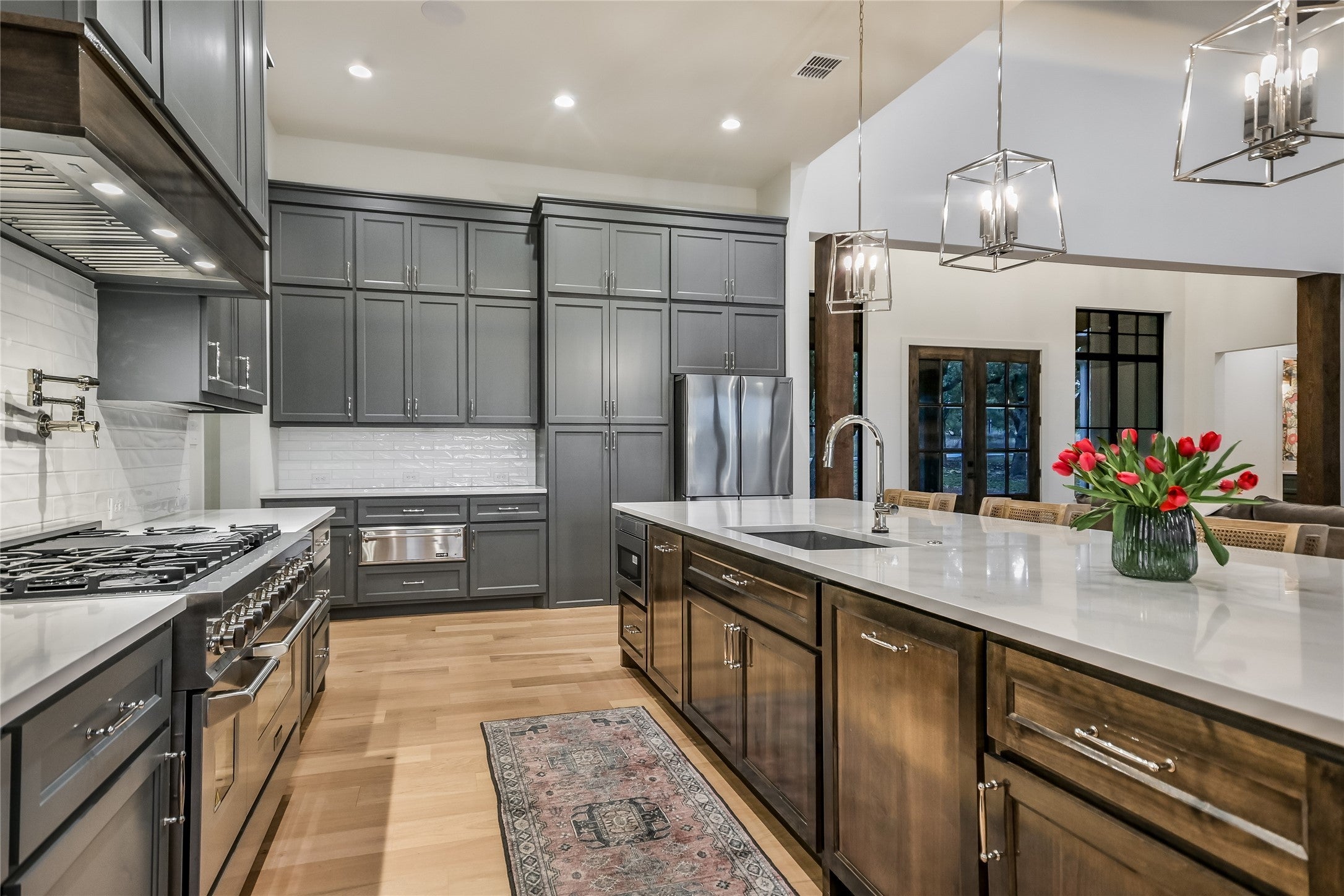 - Dishwasher, Disposal, Microwave, Wine Cooler, Convection Oven, Exhaust Fan, Range Hood, Stainless Steel Appliance(s), Warming Drawer